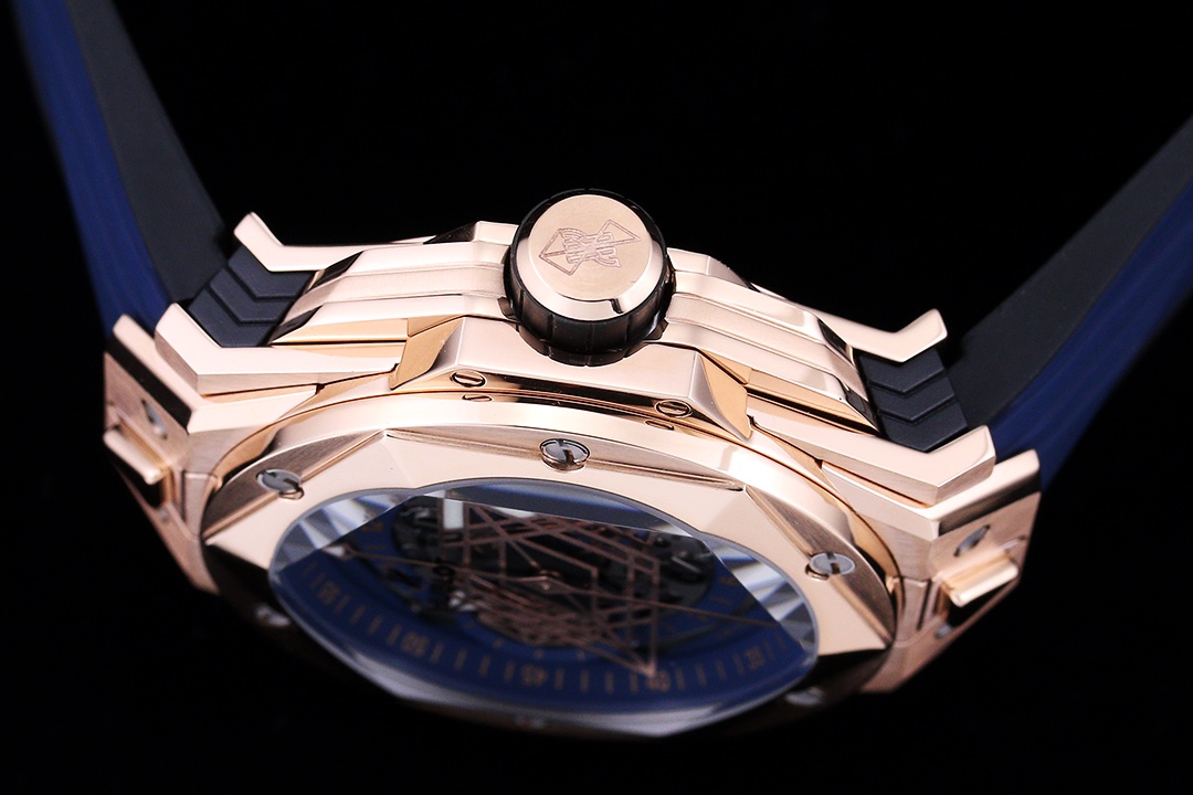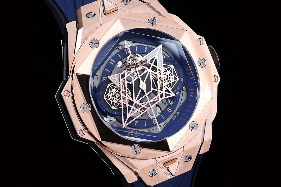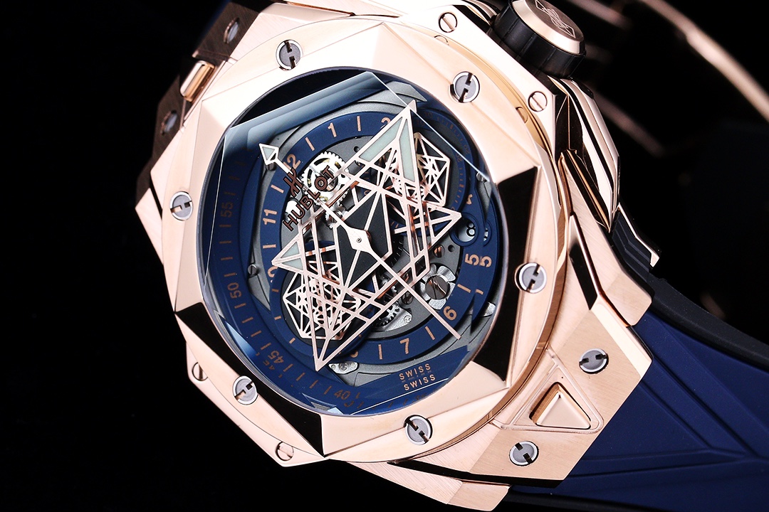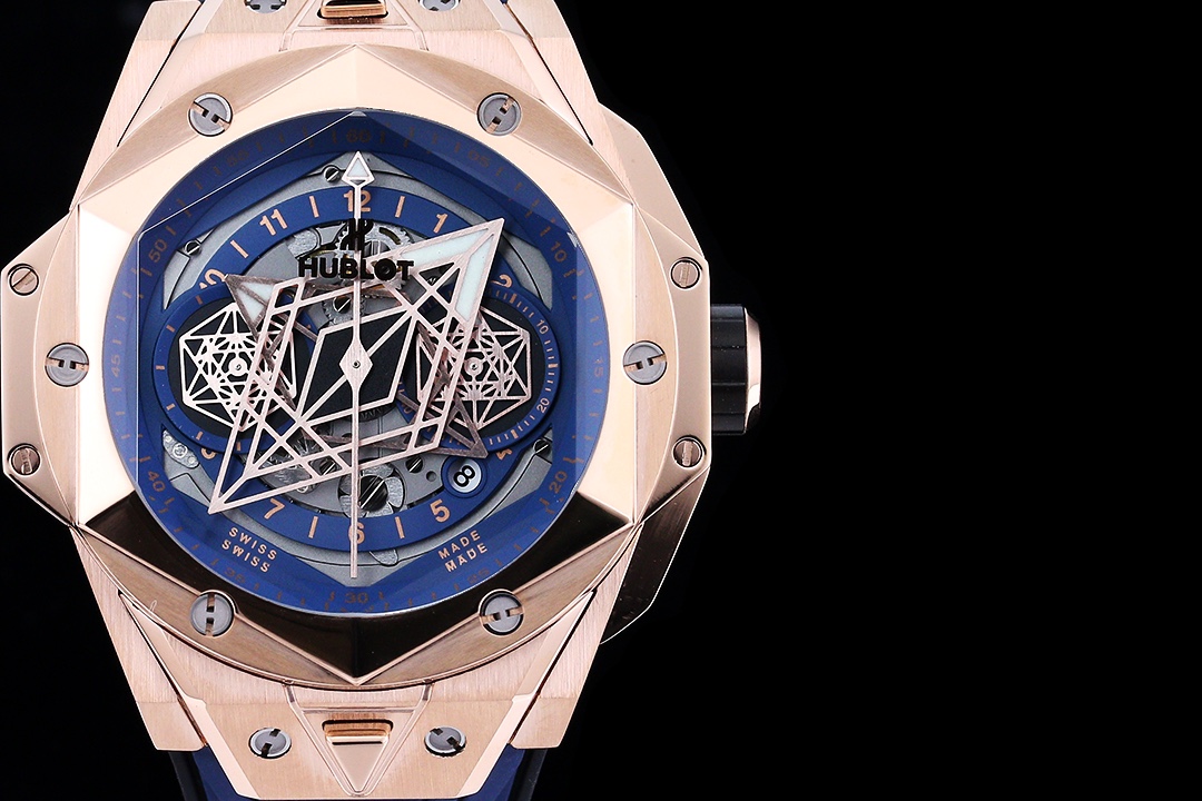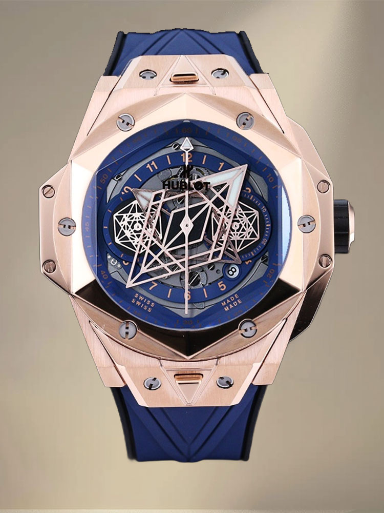 إليكم ساعة هوبلو بيغ بانغ سانغ بلو II بلو كينغ جولد يونيكو 45 مم، عمل فني يجسد الرقي والمهارة التقنية من هوبلو. الساعة المحدودة الإصدار محاطة بعلبة من الذهب الوردي بقطر 45 مم تتميز بتصاميم هندسية مقطوعة ومشكلة في الإطار السداسي. تؤمن ستة براغي من التيتانيوم على شكل حرف H الإطار، مما يجعل الساعة متينة ولكنها أنيقة المظهر. القرص رائع، مع عقارب الساعات والدقائق المزخرفة بأشكال ماسية، وقرص فرعي على شكل سداسي يخلق أنماطًا هندسية ديناميكية مع مرور الدقائق. تجلس الساعة على حزام مطاطي سريع الإطلاق، مصنوع من خطوط هندسية تخلق وهمًا بصريًا ثلاثي الأبعاد. مع حركة كرونوغراف أوتوماتيكية سويسرية من طراز 7750، تحتوي الساعة على ظهر علبة داخلي من التيتانيوم، وعقارب مصقولة مجوفة، وزجاج ياقوت متعدد الأوجه مقاوم للخدش وخفيف ومضاد للانعكاس، ومقاومة للماء حتى عمق 50 مترًا مع موثوقية يومية.