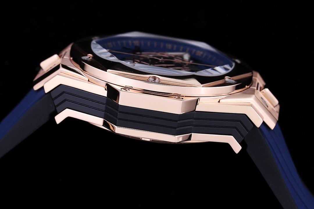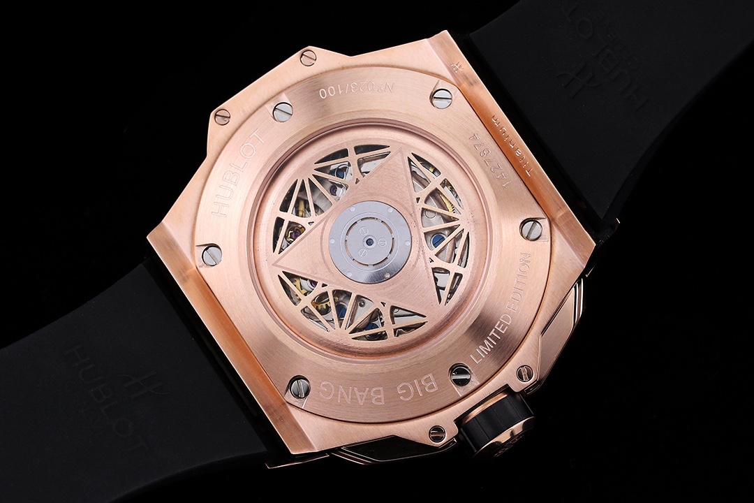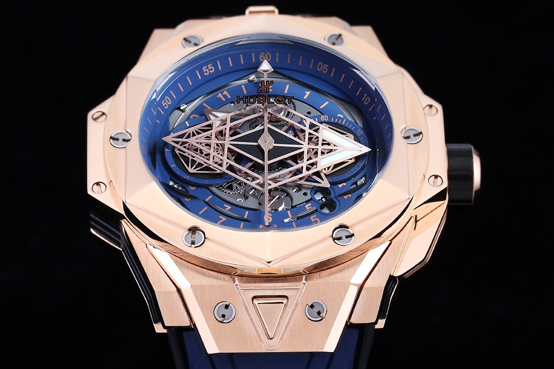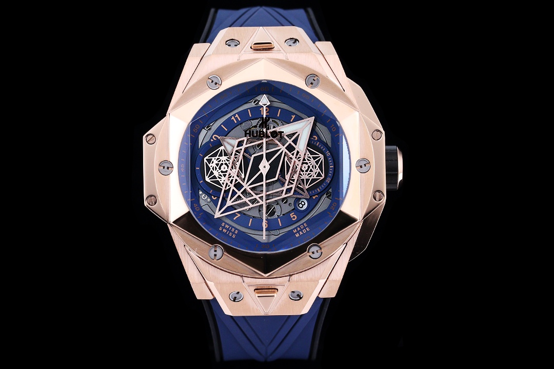 إليكم ساعة هوبلو بيغ بانغ سانغ بلو II بلو كينغ جولد يونيكو 45 مم، عمل فني يجسد الرقي والمهارة التقنية من هوبلو. الساعة المحدودة الإصدار محاطة بعلبة من الذهب الوردي بقطر 45 مم تتميز بتصاميم هندسية مقطوعة ومشكلة في الإطار السداسي. تؤمن ستة براغي من التيتانيوم على شكل حرف H الإطار، مما يجعل الساعة متينة ولكنها أنيقة المظهر. القرص رائع، مع عقارب الساعات والدقائق المزخرفة بأشكال ماسية، وقرص فرعي على شكل سداسي يخلق أنماطًا هندسية ديناميكية مع مرور الدقائق. تجلس الساعة على حزام مطاطي سريع الإطلاق، مصنوع من خطوط هندسية تخلق وهمًا بصريًا ثلاثي الأبعاد. مع حركة كرونوغراف أوتوماتيكية سويسرية من طراز 7750، تحتوي الساعة على ظهر علبة داخلي من التيتانيوم، وعقارب مصقولة مجوفة، وزجاج ياقوت متعدد الأوجه مقاوم للخدش وخفيف ومضاد للانعكاس، ومقاومة للماء حتى عمق 50 مترًا مع موثوقية يومية.