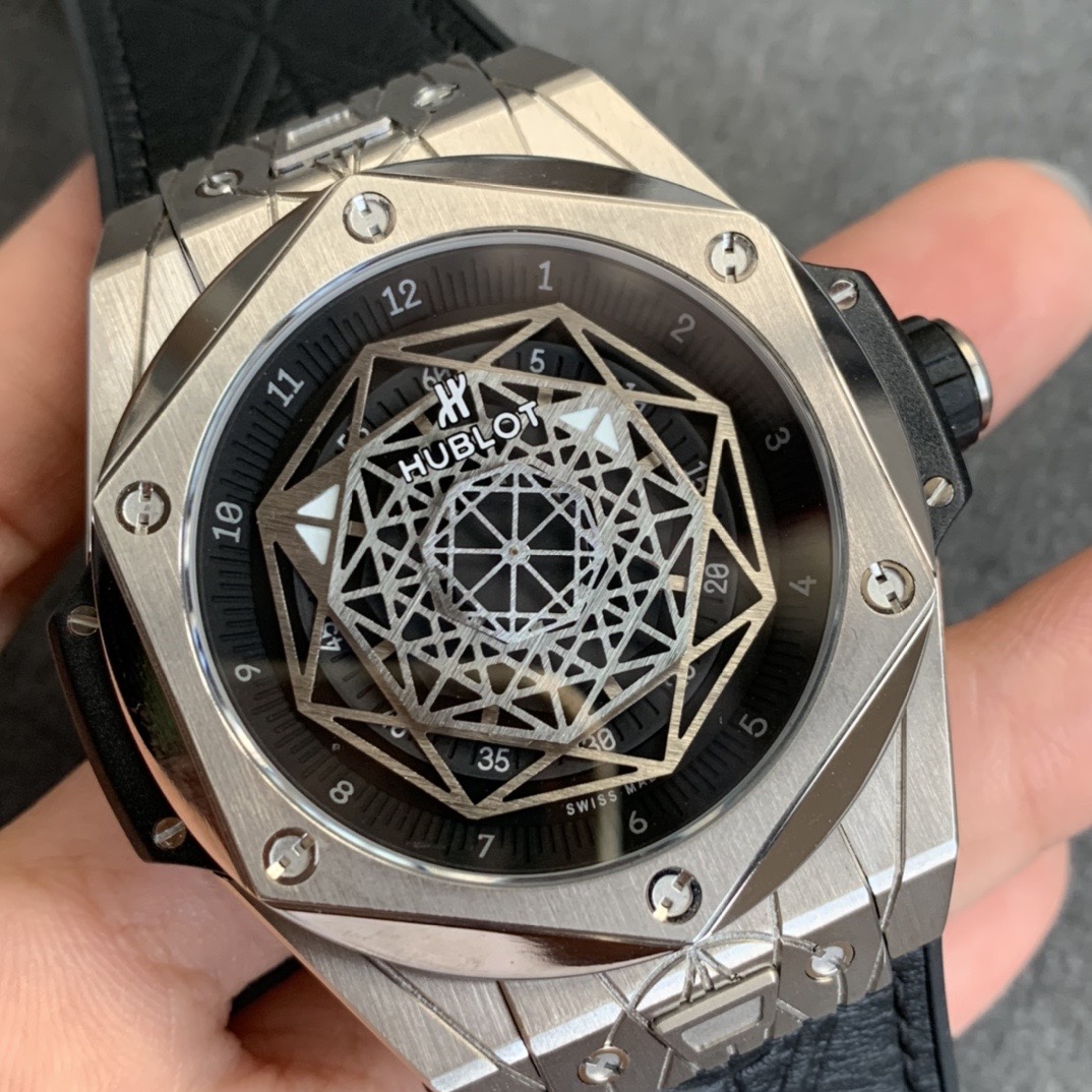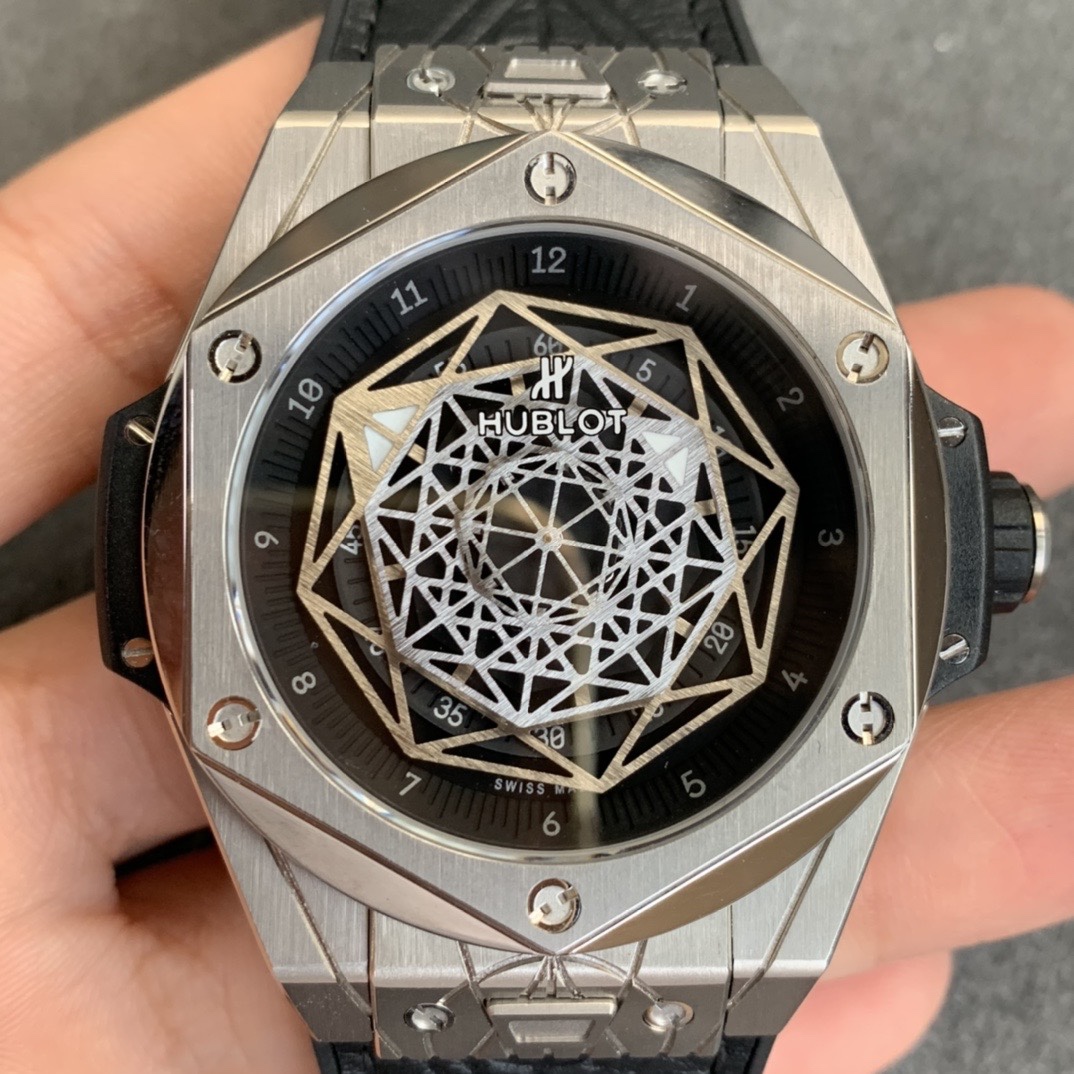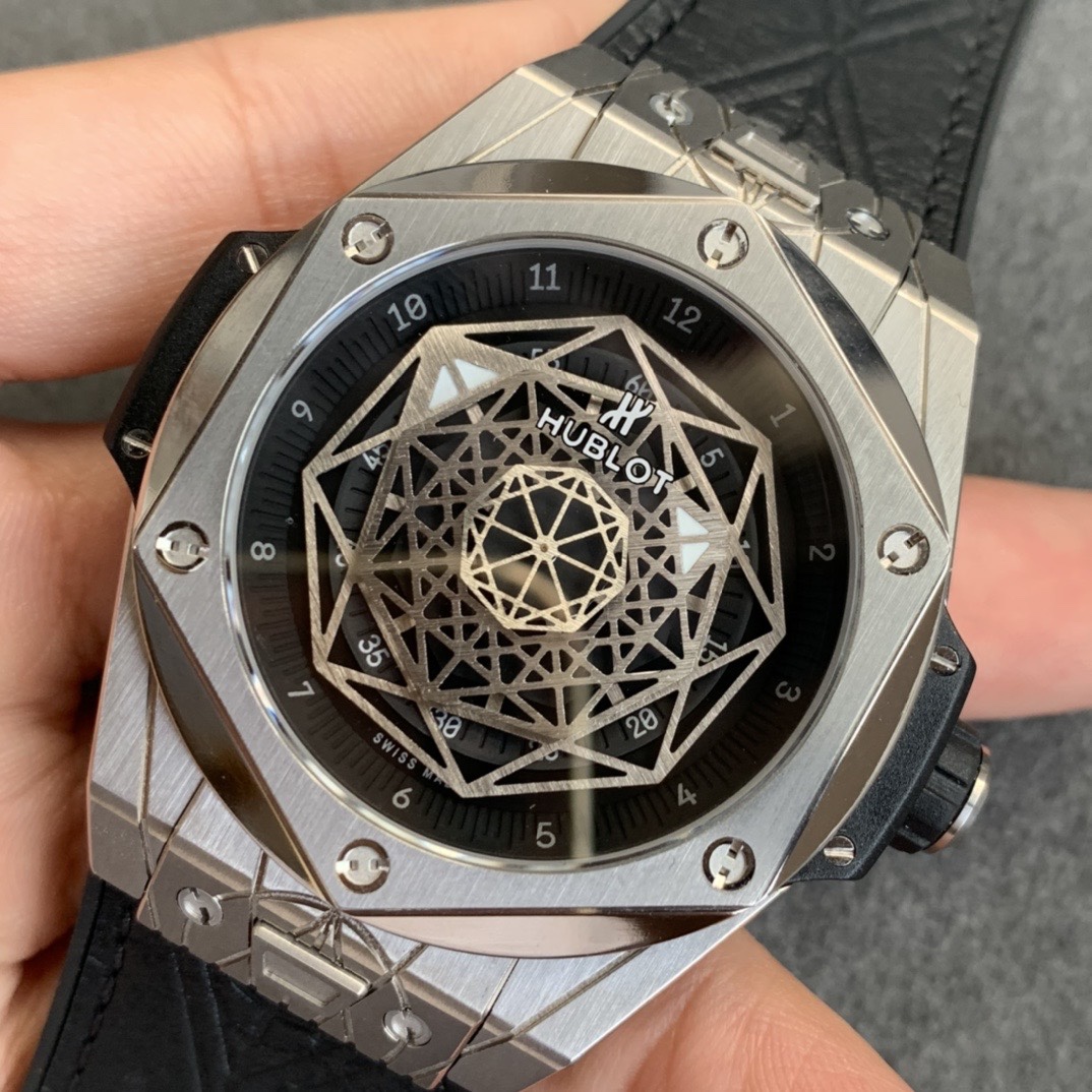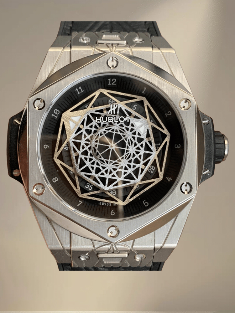 ساعة هوبلو بيغ بانغ سانغ بلو 415.NX.1112.VR.MXM16 هي عرض صارخ للأناقة الهندسية والفخامة المعاصرة. مصنوعة من علبة تيتانيوم بقطر 45 مم، تجمع الساعة بين القوة الصناعية وخفة الوزن. تحتوي على واجهة هيكلية مع علامات ساعات عربية حادة. وهذا يقدم لمحة نشطة عن الحركة السويسرية داخلها. تعطي أناقة تصميم الواجهة هذه الساعة إحساسًا معماريًا مميزًا.