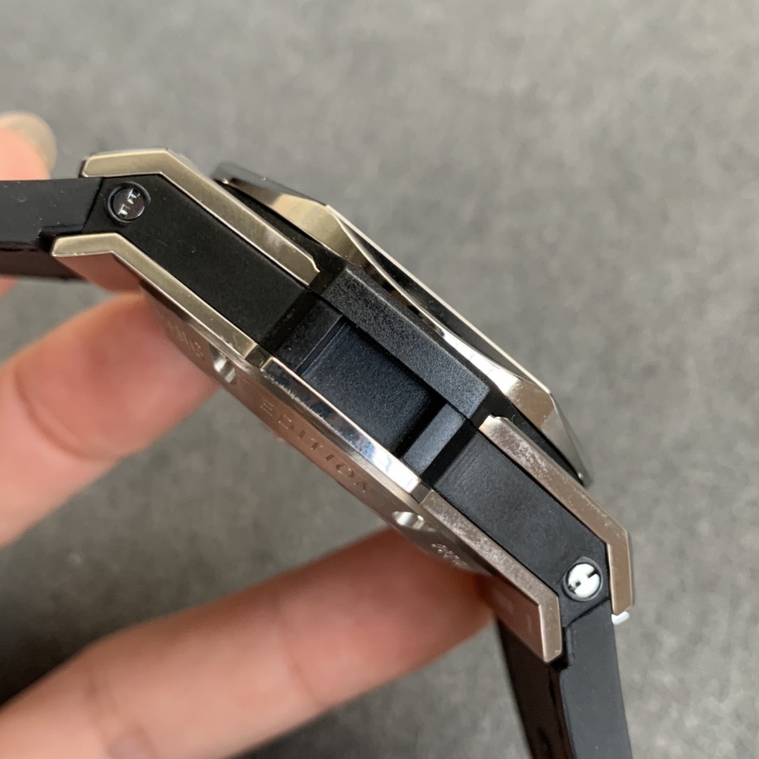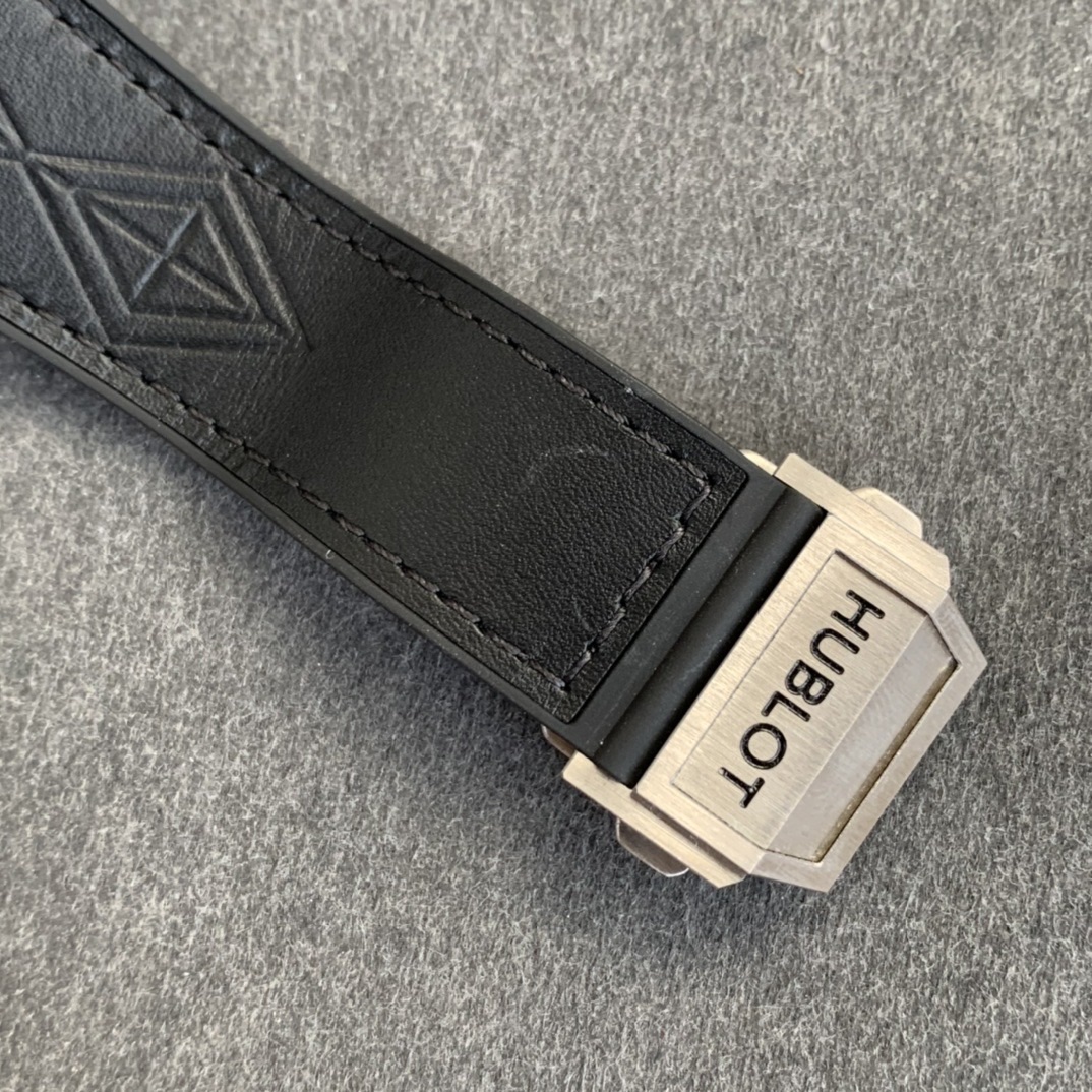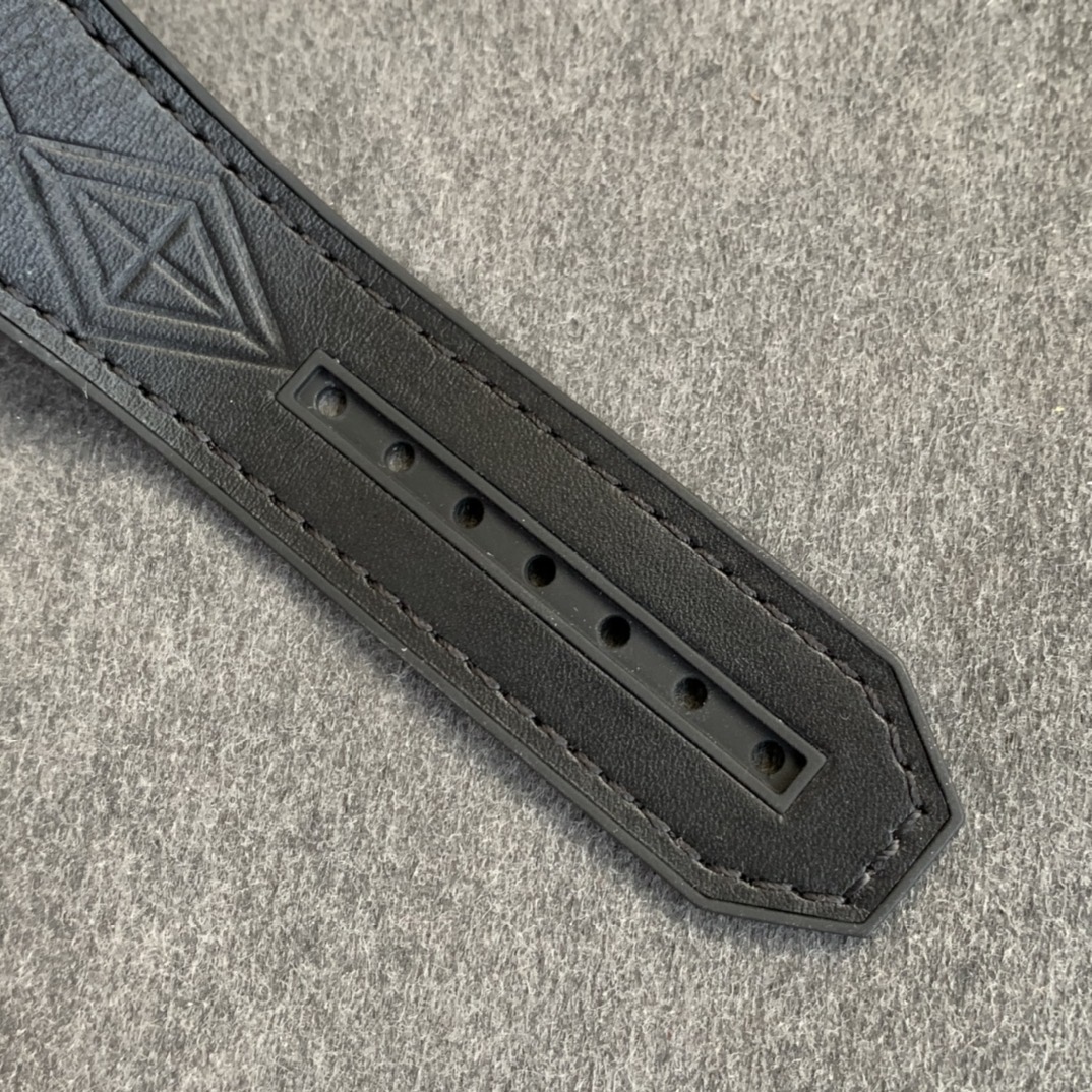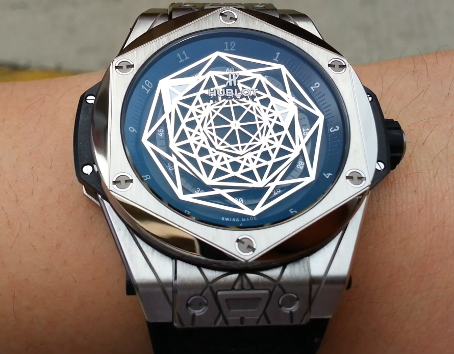ساعة هوبلو بيغ بانغ سانغ بلو 415.NX.1112.VR.MXM16 هي عرض صارخ للأناقة الهندسية والفخامة المعاصرة. مصنوعة من علبة تيتانيوم بقطر 45 مم، تجمع الساعة بين القوة الصناعية وخفة الوزن. تحتوي على واجهة هيكلية مع علامات ساعات عربية حادة. وهذا يقدم لمحة نشطة عن الحركة السويسرية داخلها. تعطي أناقة تصميم الواجهة هذه الساعة إحساسًا معماريًا مميزًا.