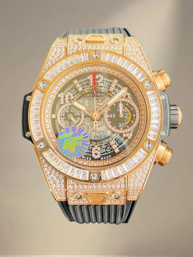 ساعة Replica Hublot Big Bang 421.OX.1180.RX.0904 مصنوعة من علبة من الذهب الوردي مرصعة بالألماس وميناء هيكلي متباين، تدمج هذه الساعة بشكل سلس بين الأسلوب المبتكر والفخامة المتطورة. يكشف الميناء الهيكلي والإطار اللامع المرصع بالألماس عن الحركة السويسرية أدناه ويقدم تصميمًا ووظائف.