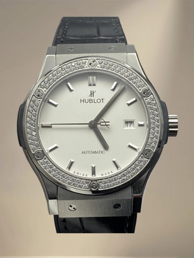 Ελβετό ρολόι αντιγραφής Hublot Classic Fusion 582.NX.2610.RX.1204 για γυναίκες – Τιτανένιο Κουτί, Διαμαντένια Κάσα, Λευκό Ρολόι