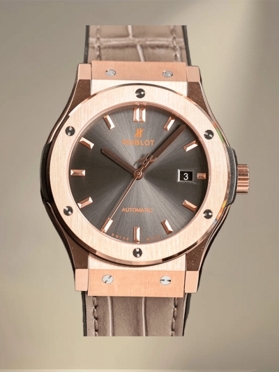 Ρολόι Πολυτελείας Hublot Classic Fusion Replica King Gold 45mm – Καπνί Dial & Ταμπά Δερμάτινο Λουράκι