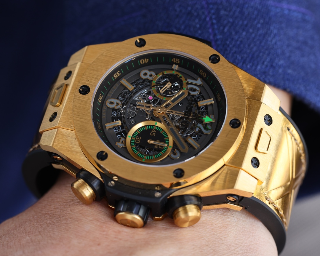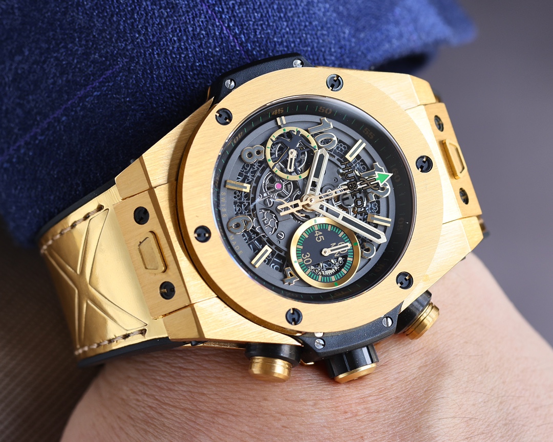 Ζήστε τη σύνθεση της καινοτομίας και της πολυτέλειας στο αντίγραφο Hublot Big Bang UNICO 411.VX.1189.VR.USB16. Το ανδρικό ρολόι 45mm διαθέτει μια τολμηρή σκελετωτή διάταξη που εκθέτει χωρίς ντροπή το περίπλοκο μηχανικό του πλαίσιο. Μια συγχώνευση βιομηχανικού γοητείας και σύγχρονου στυλ, η διάταξη έχει δύο υποδείκτες. Ο μικρός δείκτης δευτερολέπτων στις 9 και ο χρονογράφος 60 λεπτών στις 3 ώρες—που το καθιστούν τόσο κομψό όσο και λειτουργικό.