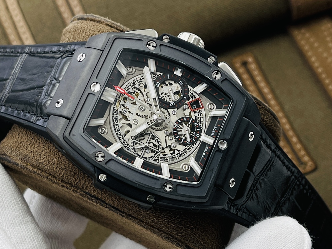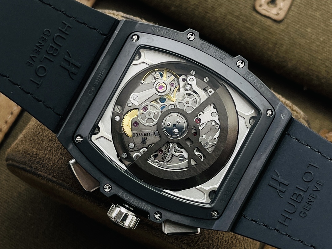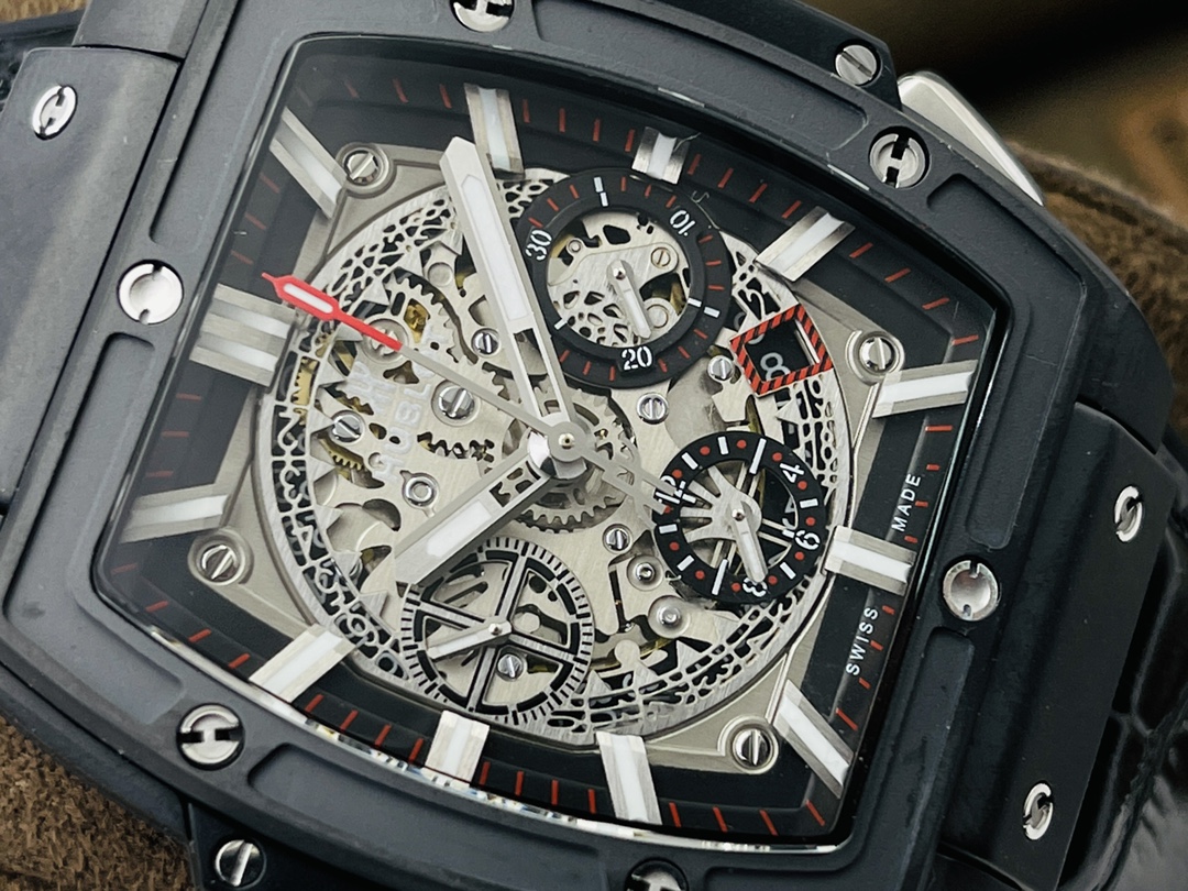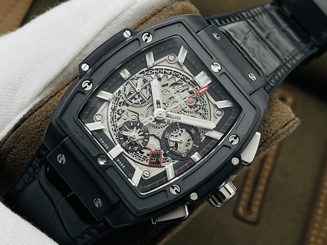 Η αναπαραγωγή Hublot Spirit of Big Bang Black Magic 601.CI.0173.RX είναι ένα έργο τέχνης εμπνευσμένο από τον κόσμο των μηχανοκίνητων αγώνων και αποτυπώνει τα χαρακτηριστικά της σειράς Spirit of Big Bang στο σχεδιασμό της. Η βαρελοειδής θήκη από μαύρη κεραμική υψηλής ποιότητας και η κατασκευή έξι βιδών σε σχήμα "sandwich" αναδεικνύουν την υπογραφή της τεχνολογίας σύντηξης της Hublot.