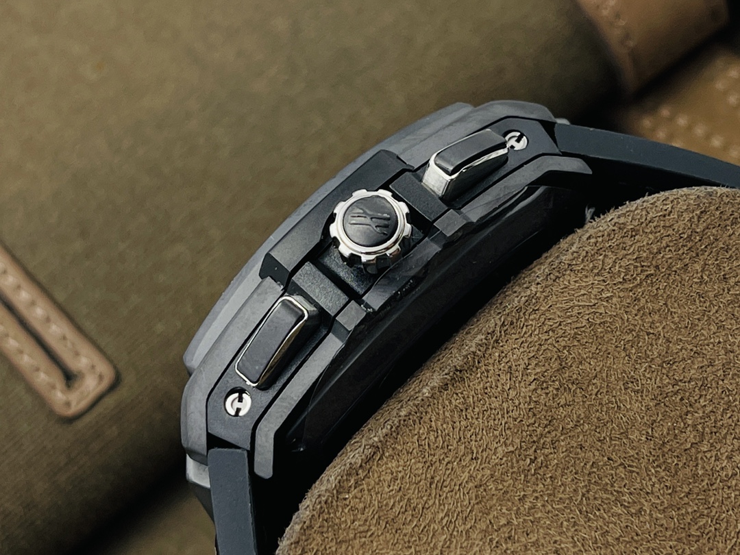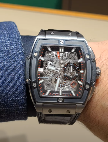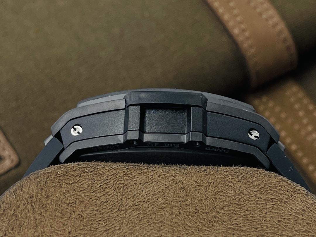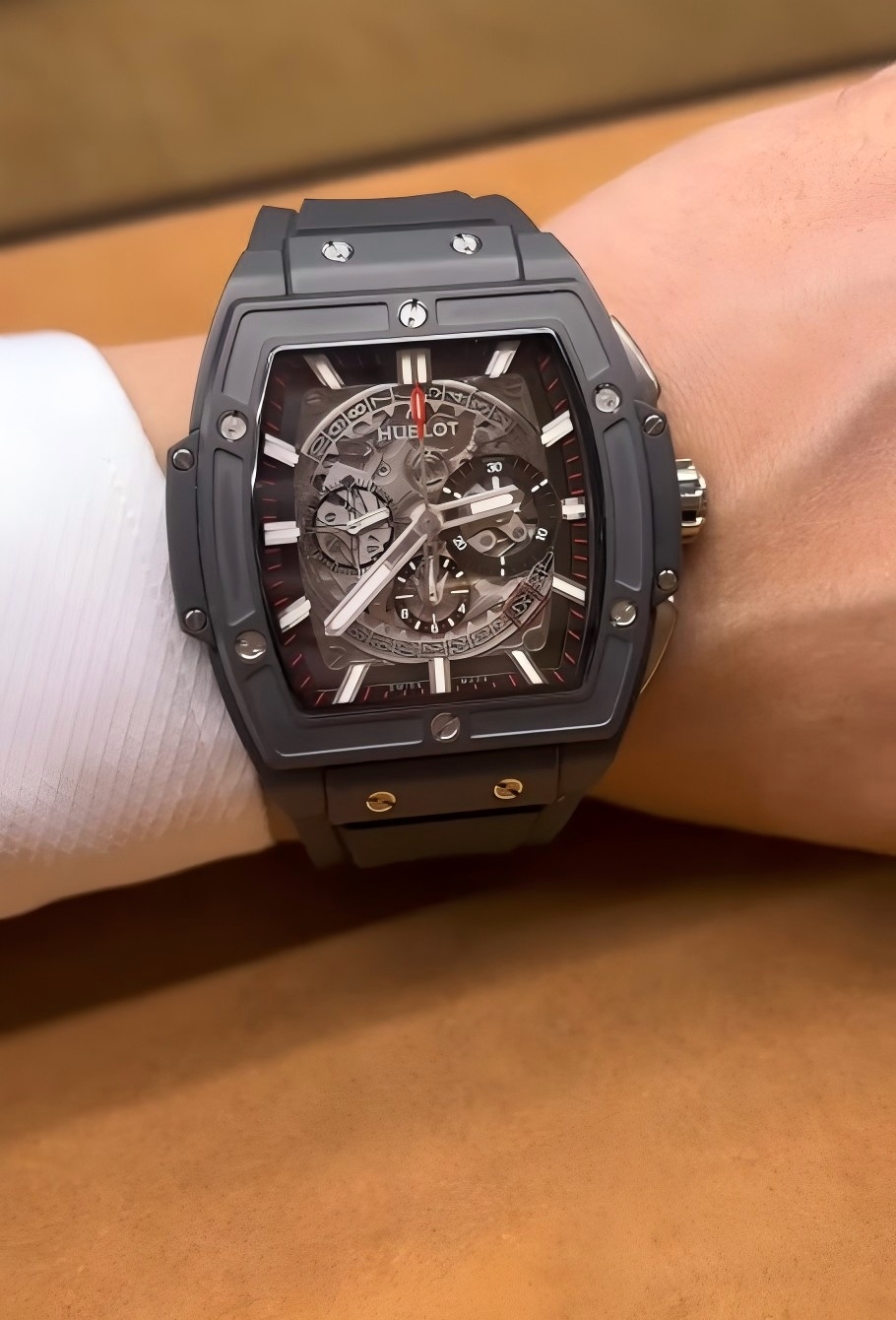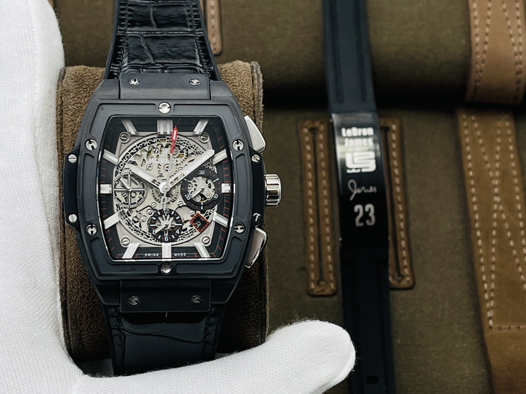 Η αναπαραγωγή Hublot Spirit of Big Bang Black Magic 601.CI.0173.RX είναι ένα έργο τέχνης εμπνευσμένο από τον κόσμο των μηχανοκίνητων αγώνων και αποτυπώνει τα χαρακτηριστικά της σειράς Spirit of Big Bang στο σχεδιασμό της. Η βαρελοειδής θήκη από μαύρη κεραμική υψηλής ποιότητας και η κατασκευή έξι βιδών σε σχήμα "sandwich" αναδεικνύουν την υπογραφή της τεχνολογίας σύντηξης της Hublot.
