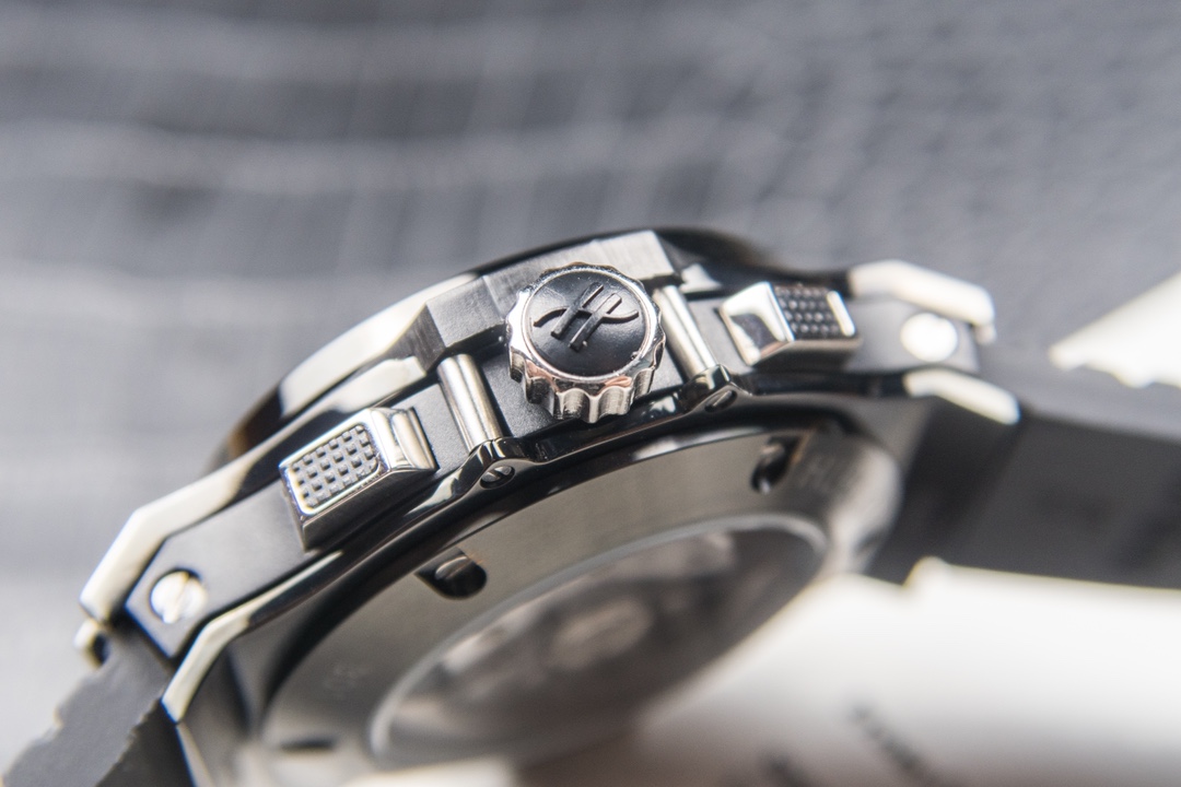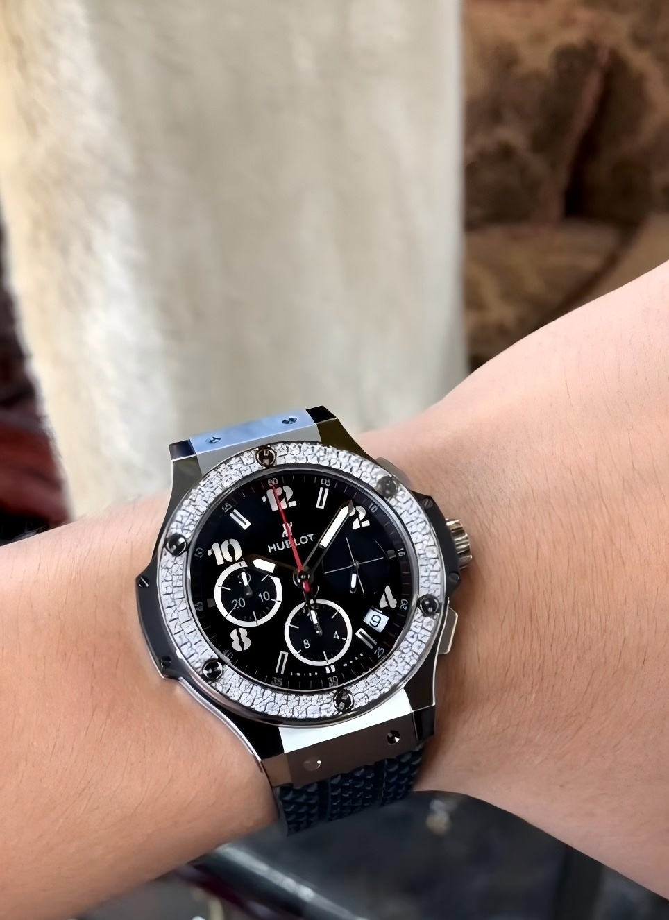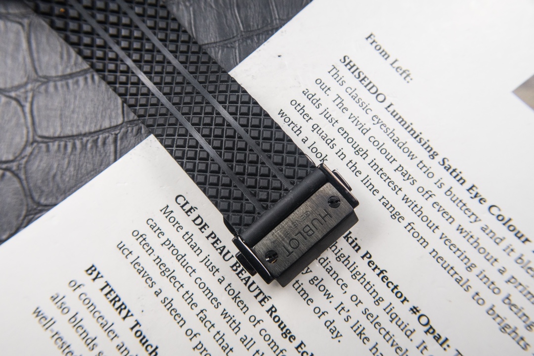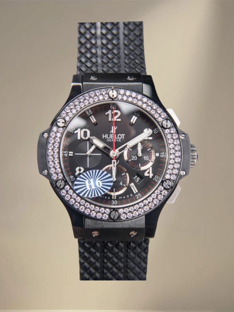 La caja de titanio sólido y el bisel engastado con diamantes añaden un temperamento refinado a la muñeca. Un estilo deportivo y chic se presenta a través de la correa de goma negra, que promete comodidad durante todo el día.