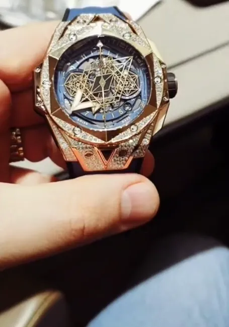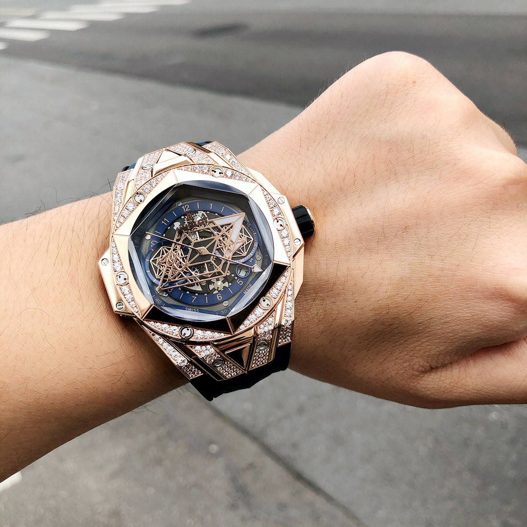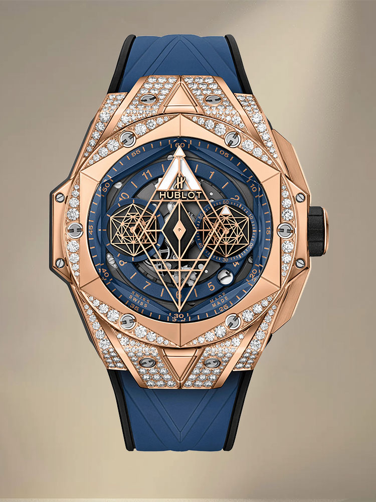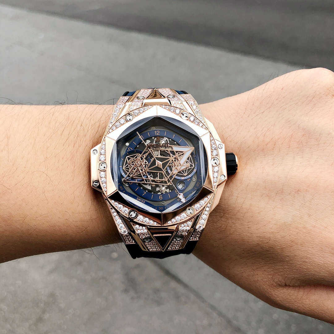 Hublot Big Bang Sang Bleu II Replica -kello on todellinen taiteen mestariteos, jossa yhdistyvät taiteellinen kekseliäisyys ja huipputeknologian kellot. 45 mm:n ruusukultakotelo, jossa on 172 timanttia, antaa tälle rajoitetun erän aikakappaleelle vaikuttavan ylellisen ja hienostuneen symbolin. Sen kellotaulussa on yksityiskohtaisia geometrisia kuvioita, jotka on inspiroitu tatuointitaiteesta, mikä tuo esiin tarkat viivat ja kolmiulotteisen visuaalisen vaikutelman. Nämä ainutlaatuiset, timantinmuotoiset tunti- ja minuuttiviisarit yhdessä kahden kuusikulmaisen alataulun kanssa muodostavat hypnotisoivia geometrisia kuvioita ajan kulkiessa.
