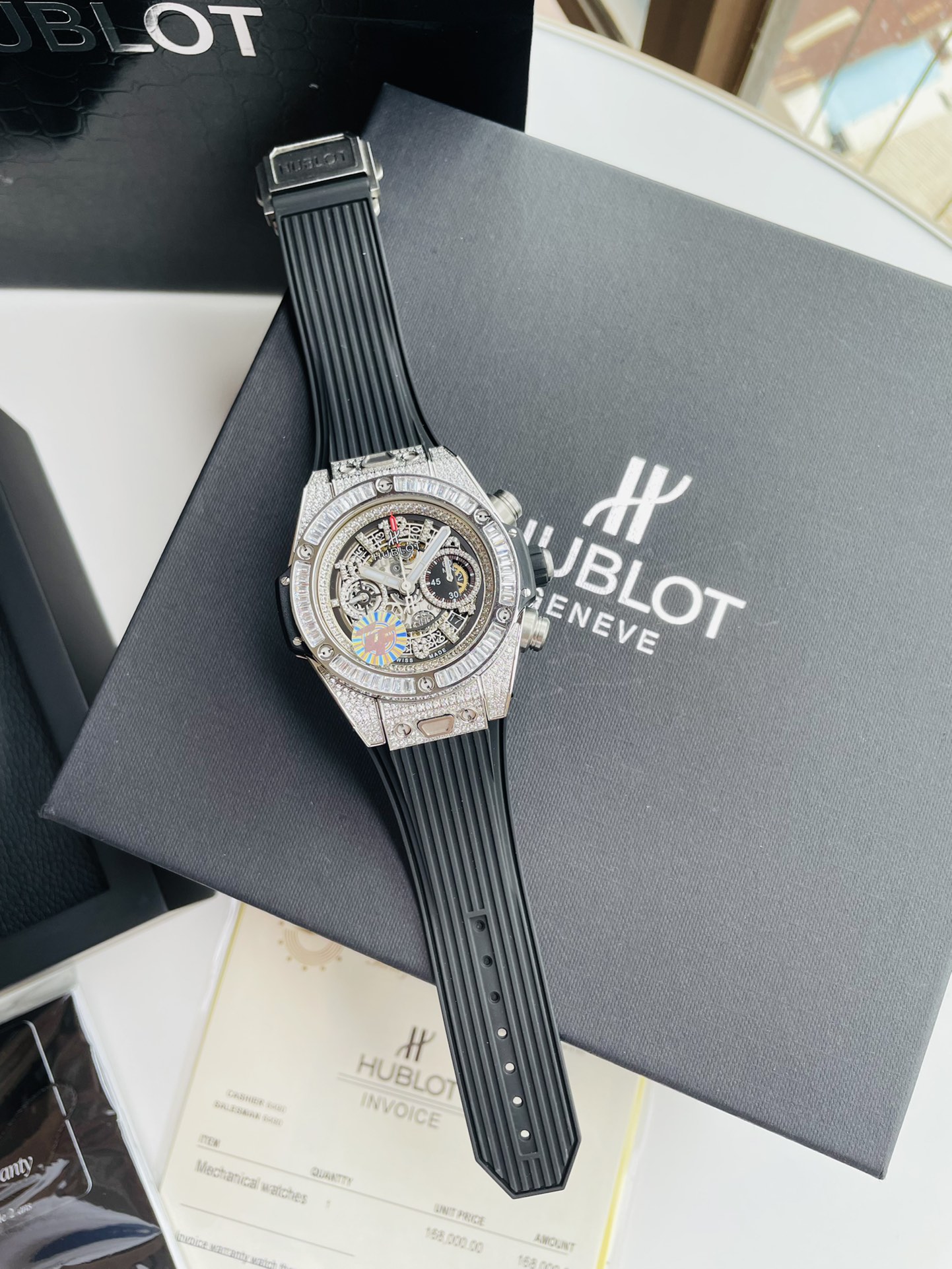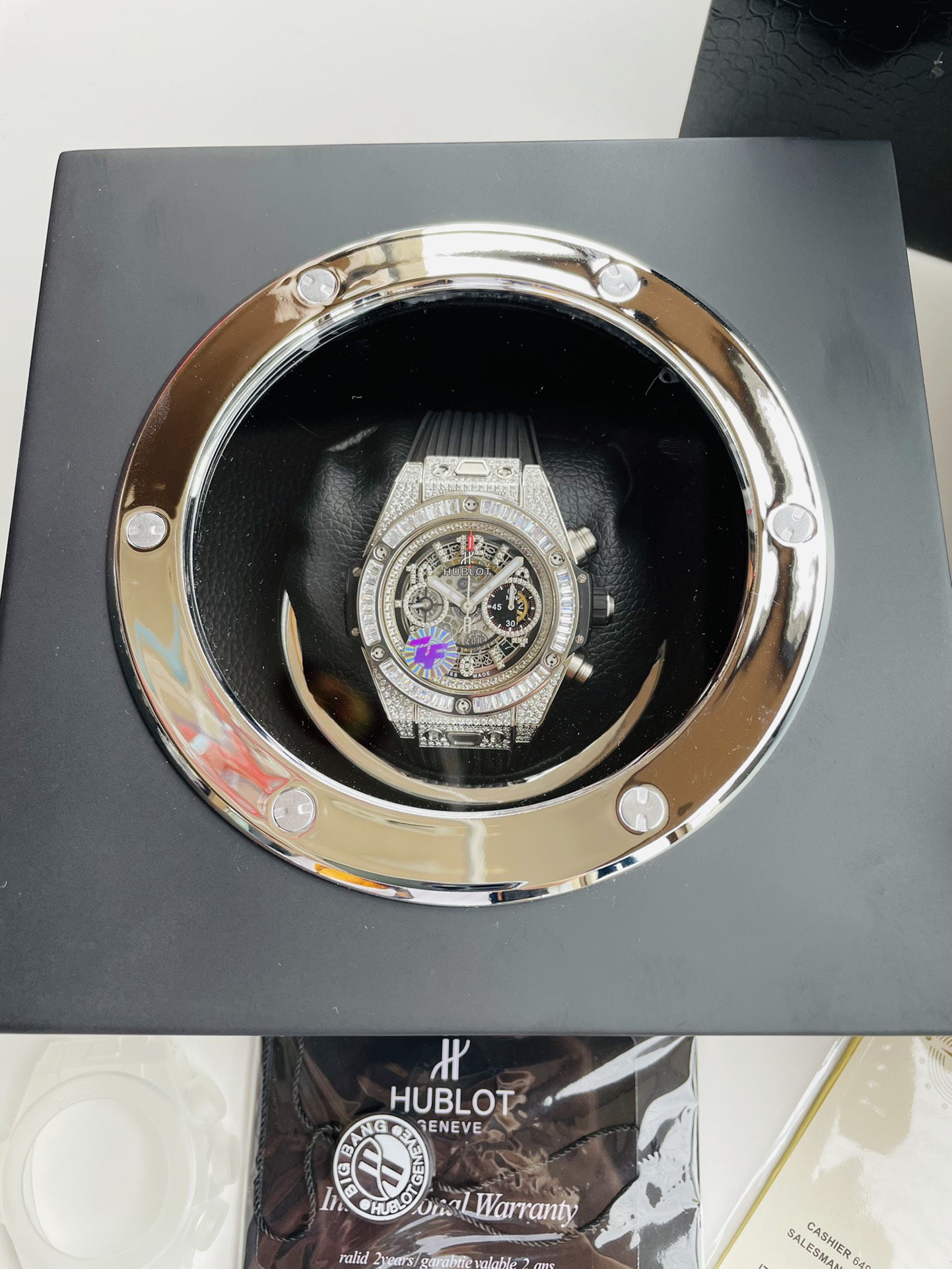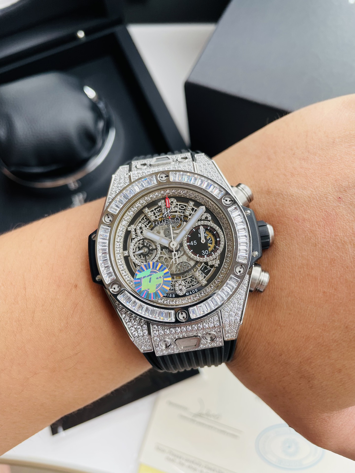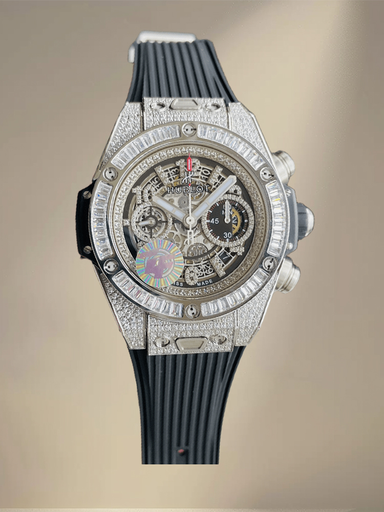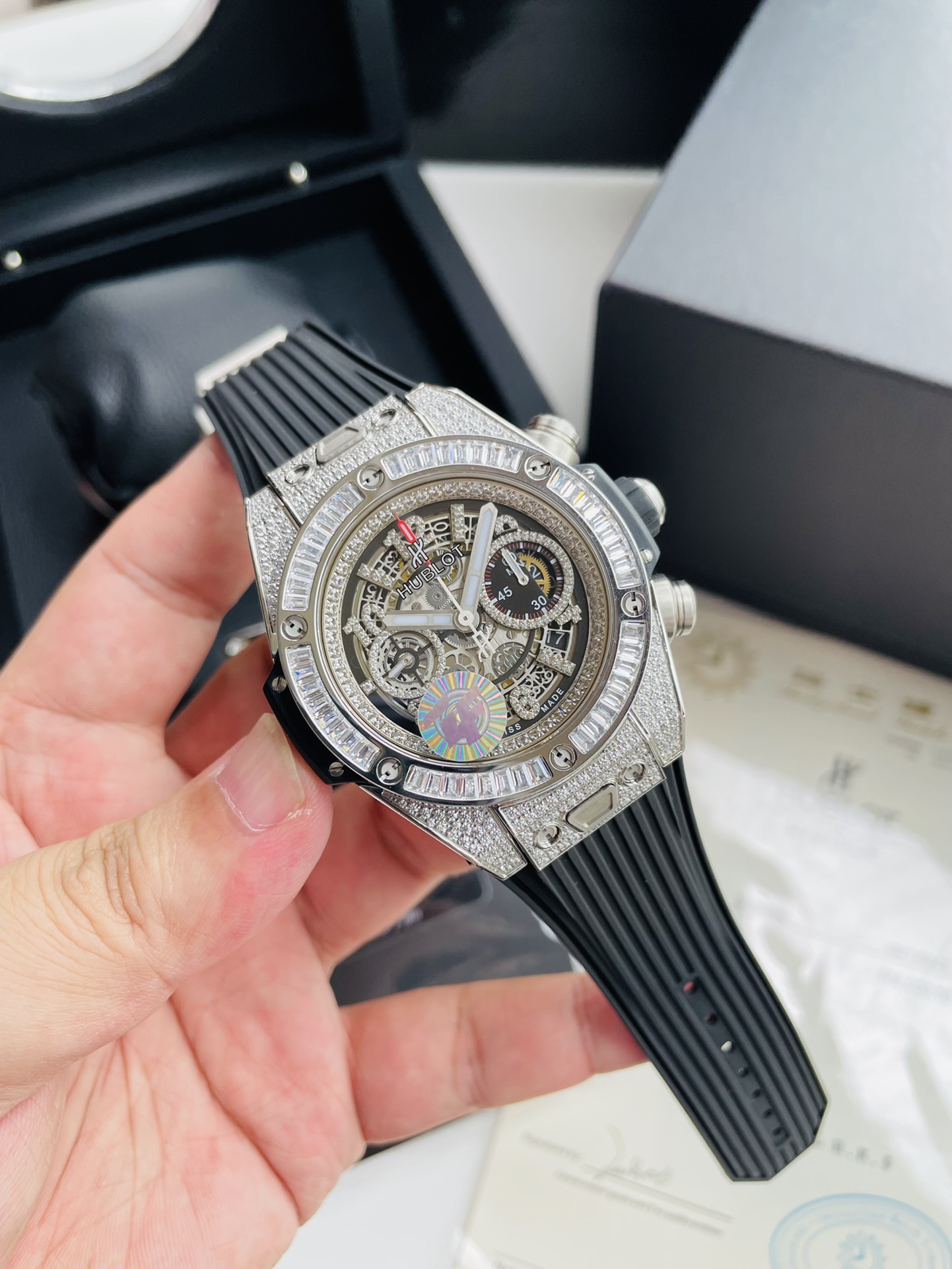 Tämä Hublot Big Bang Unico 411.NX.1170.RX.0904 -kopio edustaa luksusta. Sen kuori kimaltelee timanteista. Siinä on myös kaksi pientä timanteilla päällystettyä kellotaulua. Arabiankieliset numero- ja viivamerkit (kaikki tuntimerkit on asetettu timanteilla). Päivämääräikkuna sijaitsee neljän ja viiden välillä. Ontto muotoilu ja punainen sekuntiviisari antavat sille urheilullisen ilmeen. Tietenkin siinä on timantti kehys lisäkimallusta varten. Musta kumihihna tekee siitä mukavan käyttää. Siinä on kestävä safiirilasi. Se kestää vesiroiskeita. Se yhdistää nykypäivän tyylin luotettavuuteen. Se on loistava valinta, jos haluat tyylikkään, ylellisen kellon.