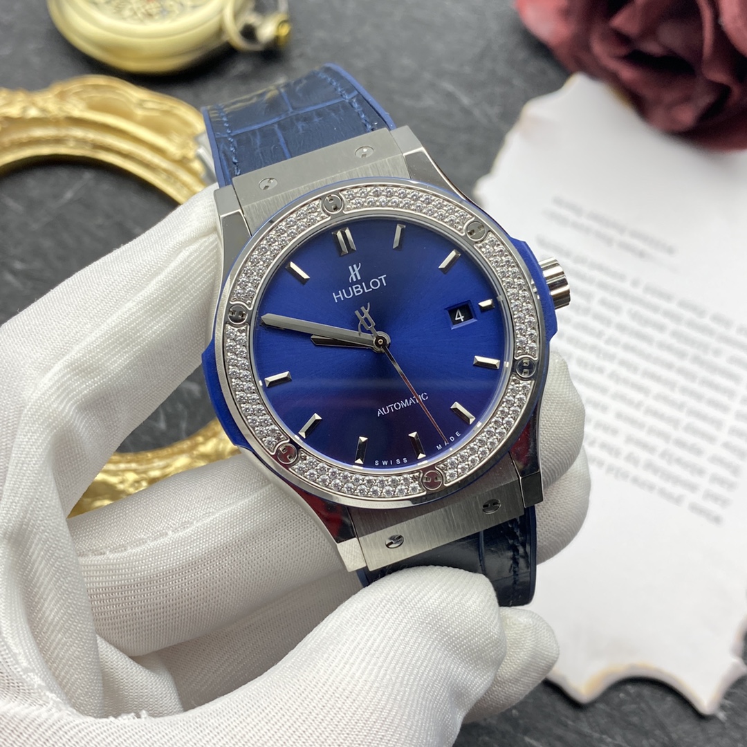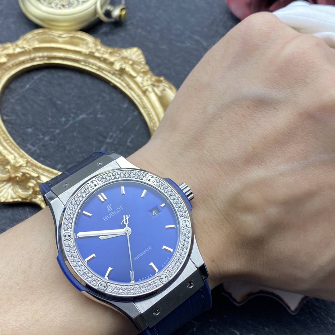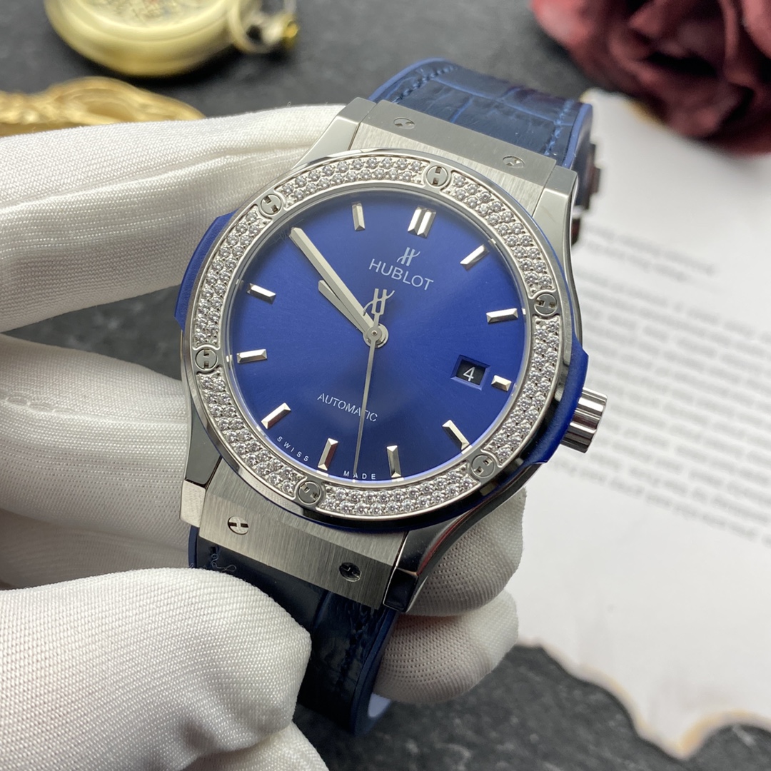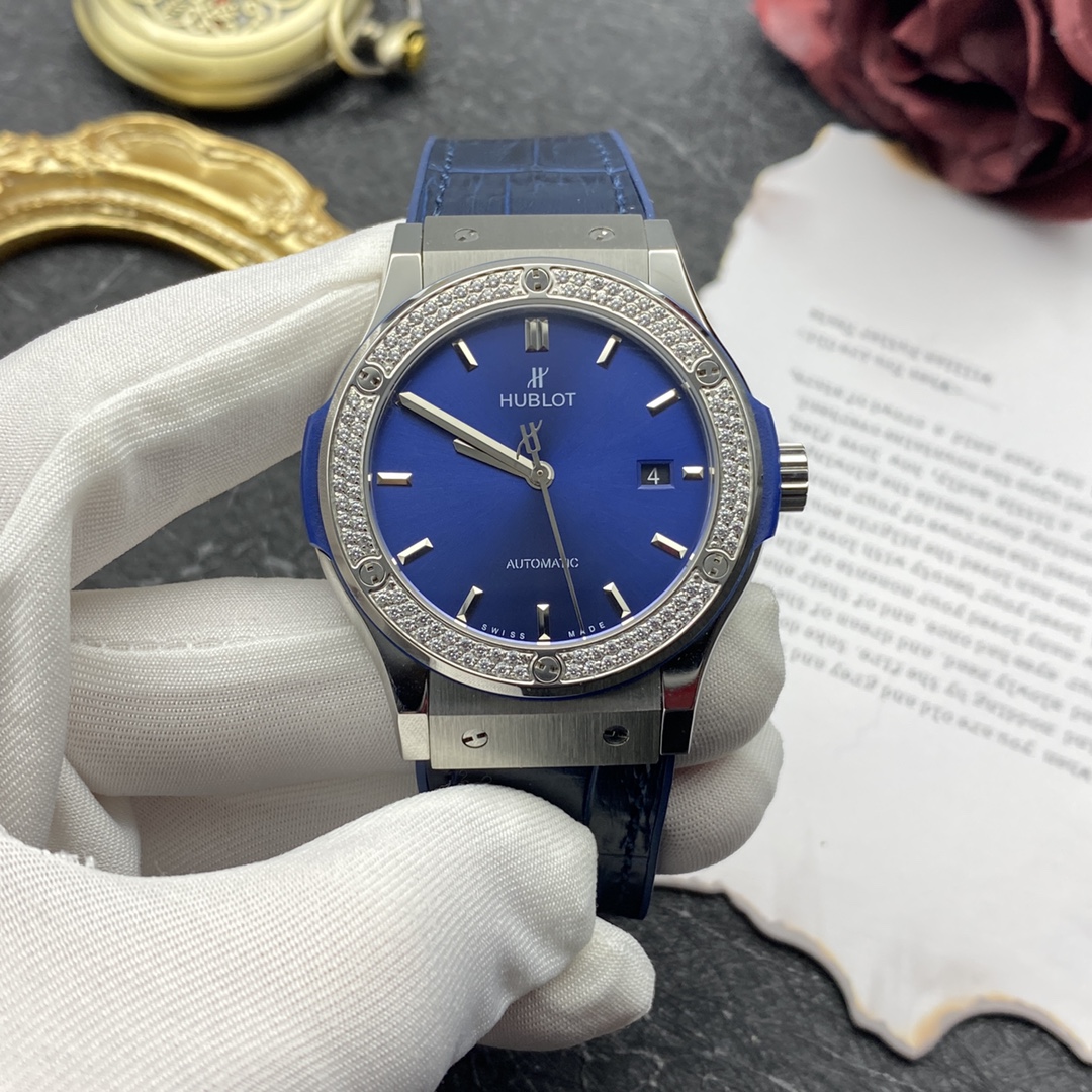 Sveitsiläinen Hublot Classic Fusion -kopio 42 mm sininen kellotaulu timanttikehyksellä titaanikello miehille