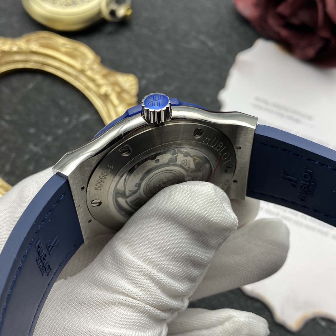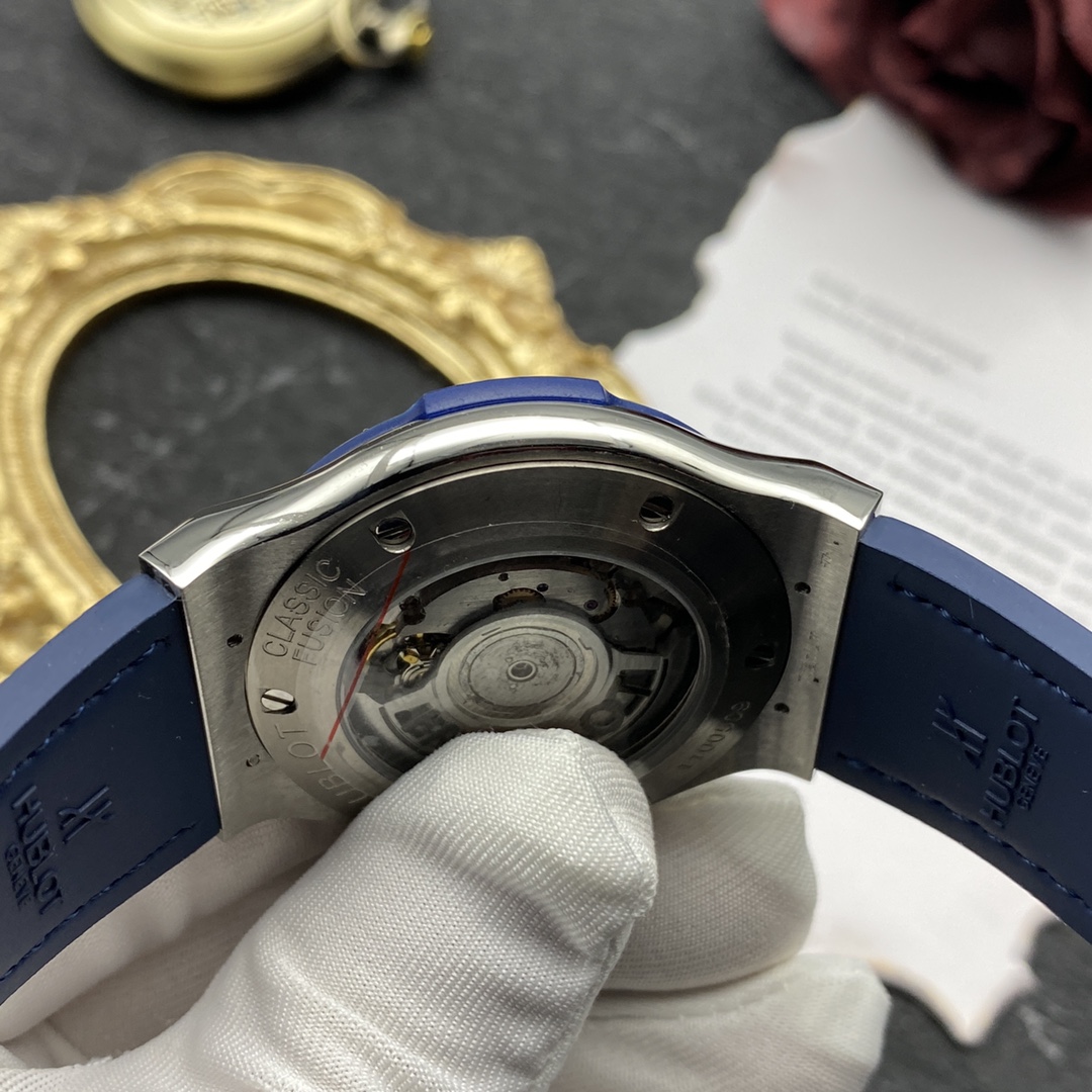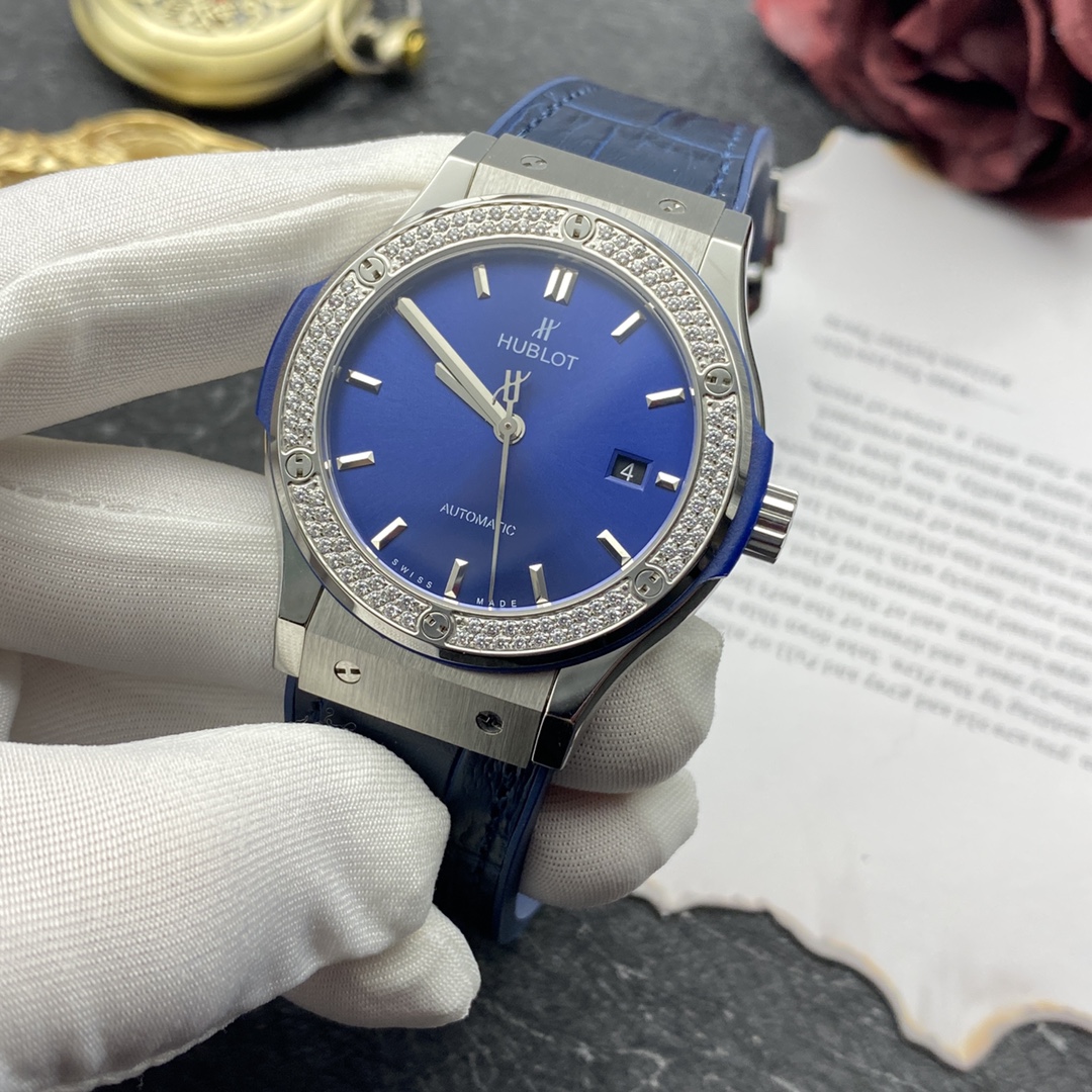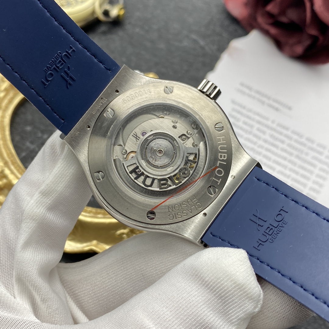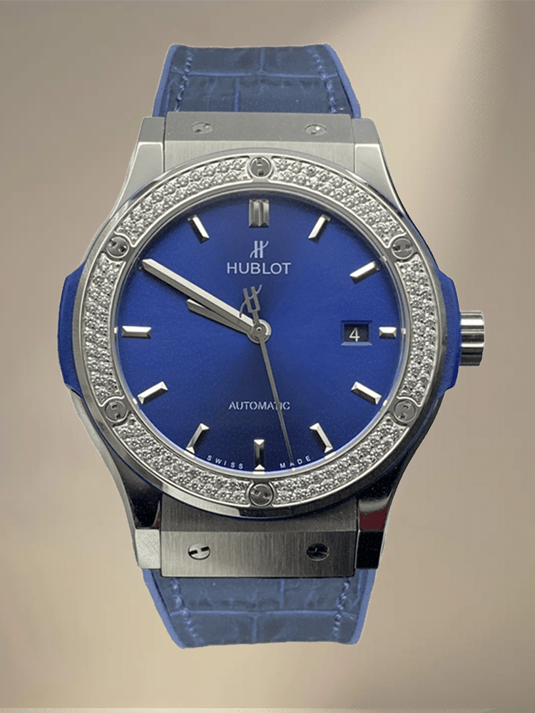 Sveitsiläinen Hublot Classic Fusion -kopio 42 mm sininen kellotaulu timanttikehyksellä titaanikello miehille