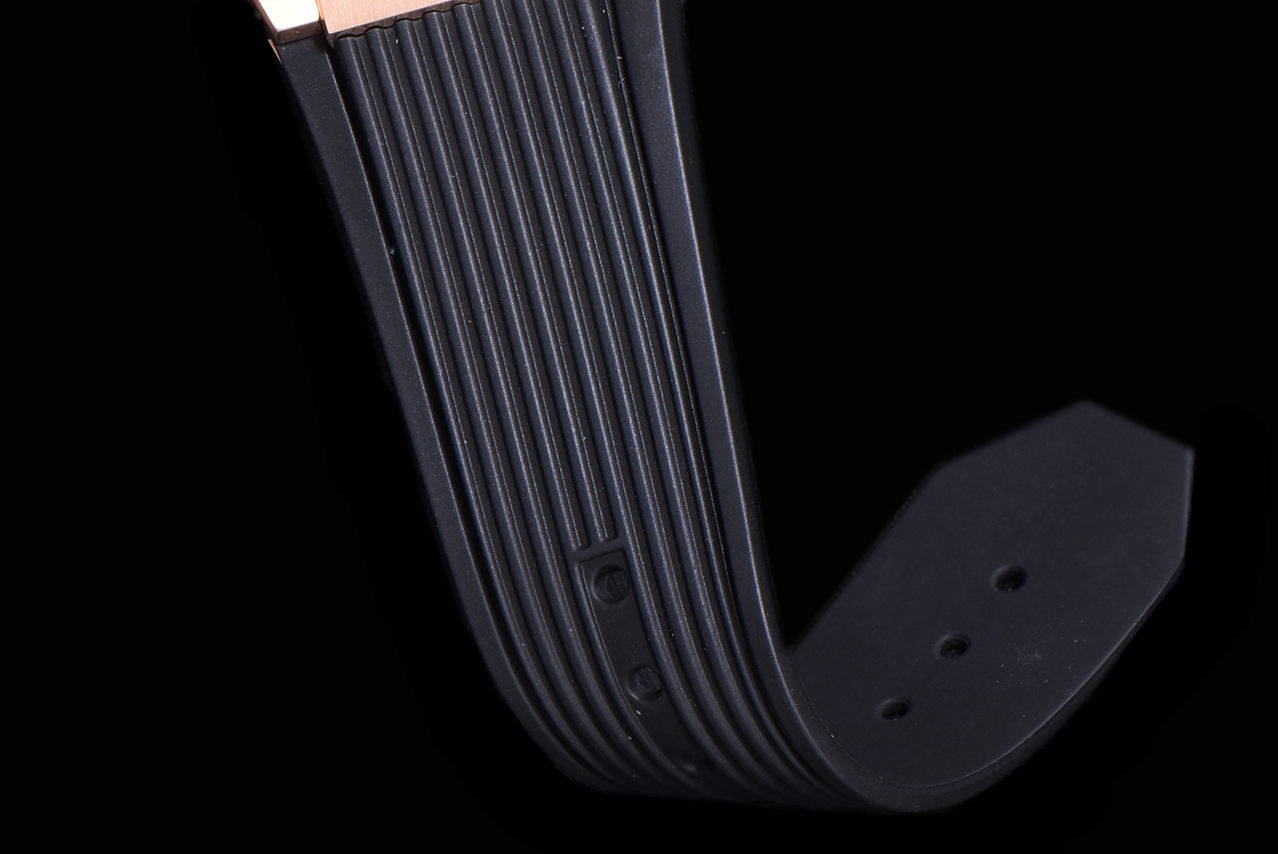 Elle est fabriquée en acier inoxydable plaqué or rose et est dotée d'un bracelet en caoutchouc noir. Elle est résistante à l'usure. Elle est protégée par un cristal saphir. Ainsi, elle est robuste et affiche des images d'une clarté cristalline de ses pièces finement usinées. Résistante à l'eau jusqu'à 50 mètres, elle est fonctionnelle sans être inesthétique.