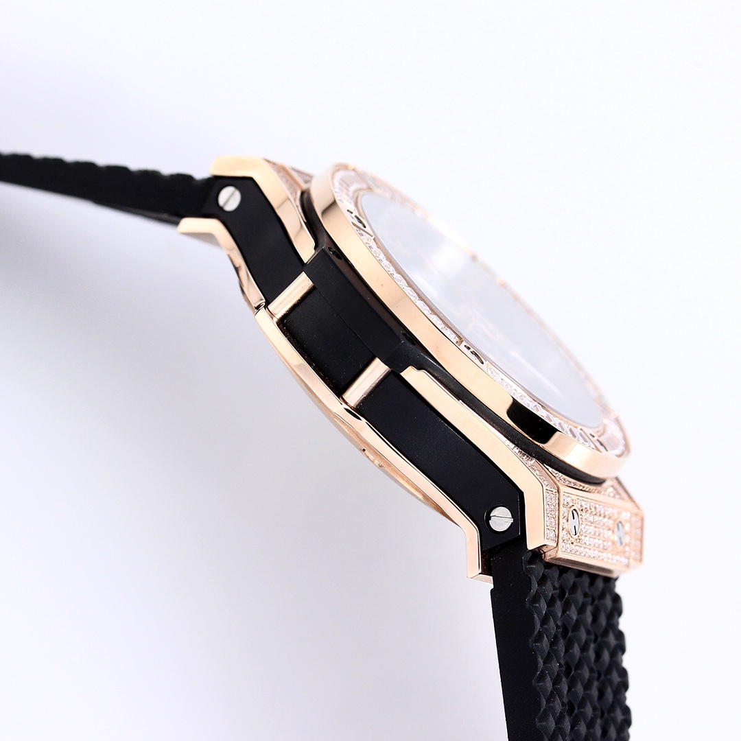 Son lunette sertie de diamants est intégrée dans un boîtier en acier inoxydable plaqué or rose, alliant luxe et robustesse—beauté maximale et solidité maximale. Les grands chiffres aux positions 3, 6, 9 et 12 heures permettent une lisibilité immédiate, rendant ainsi le cadran à la fois esthétique et fonctionnel.