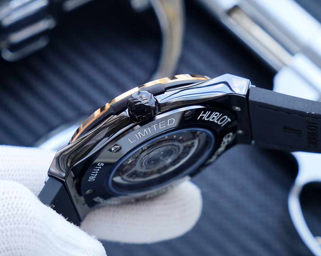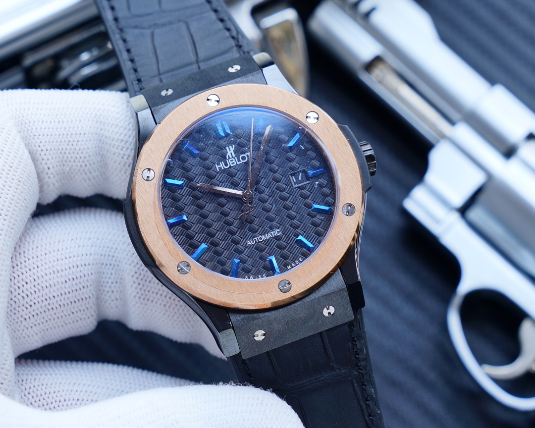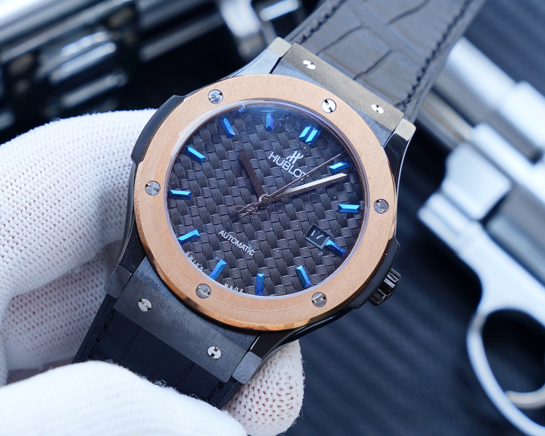 Jam tangan replika Hublot Classic Fusion didefinisikan oleh kesederhanaan yang elegan dan gaya modern. Case ramping berwarna hitam dengan diameter 42mm dilengkapi dengan bezel stainless steel berlapis emas. Ini menciptakan kontras yang mencolok. Dial hitam yang tekstur dihiasi dengan penanda jam 3D berwarna biru dan jarum jam berwarna perak. Serta jendela tanggal yang tenang di posisi 3 untuk sentuhan pragmatis.