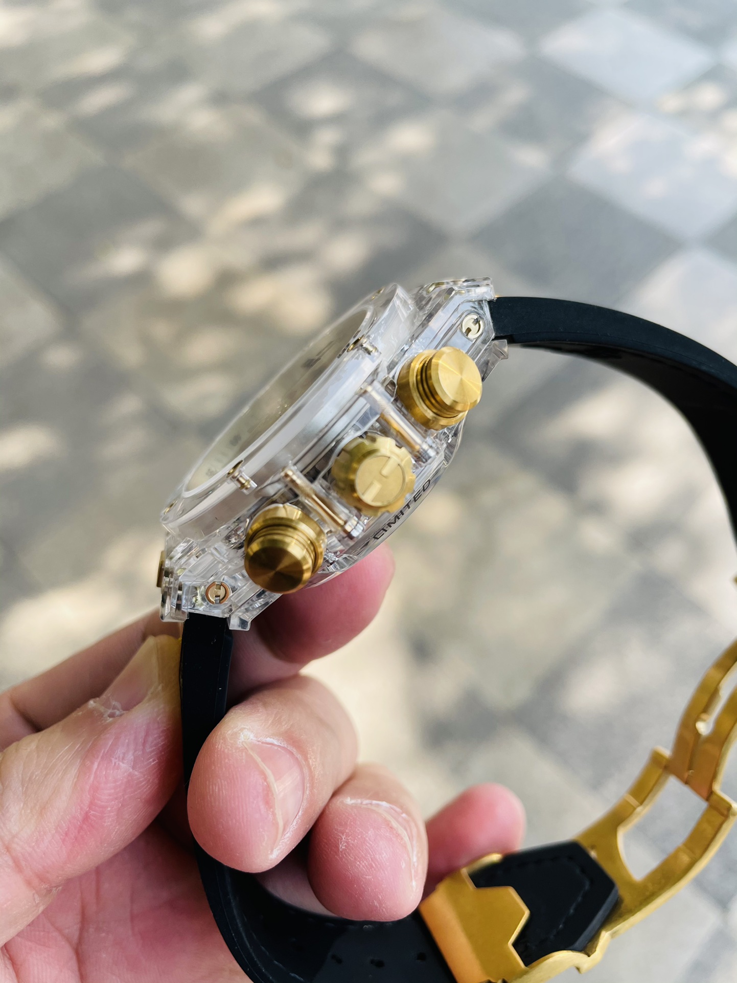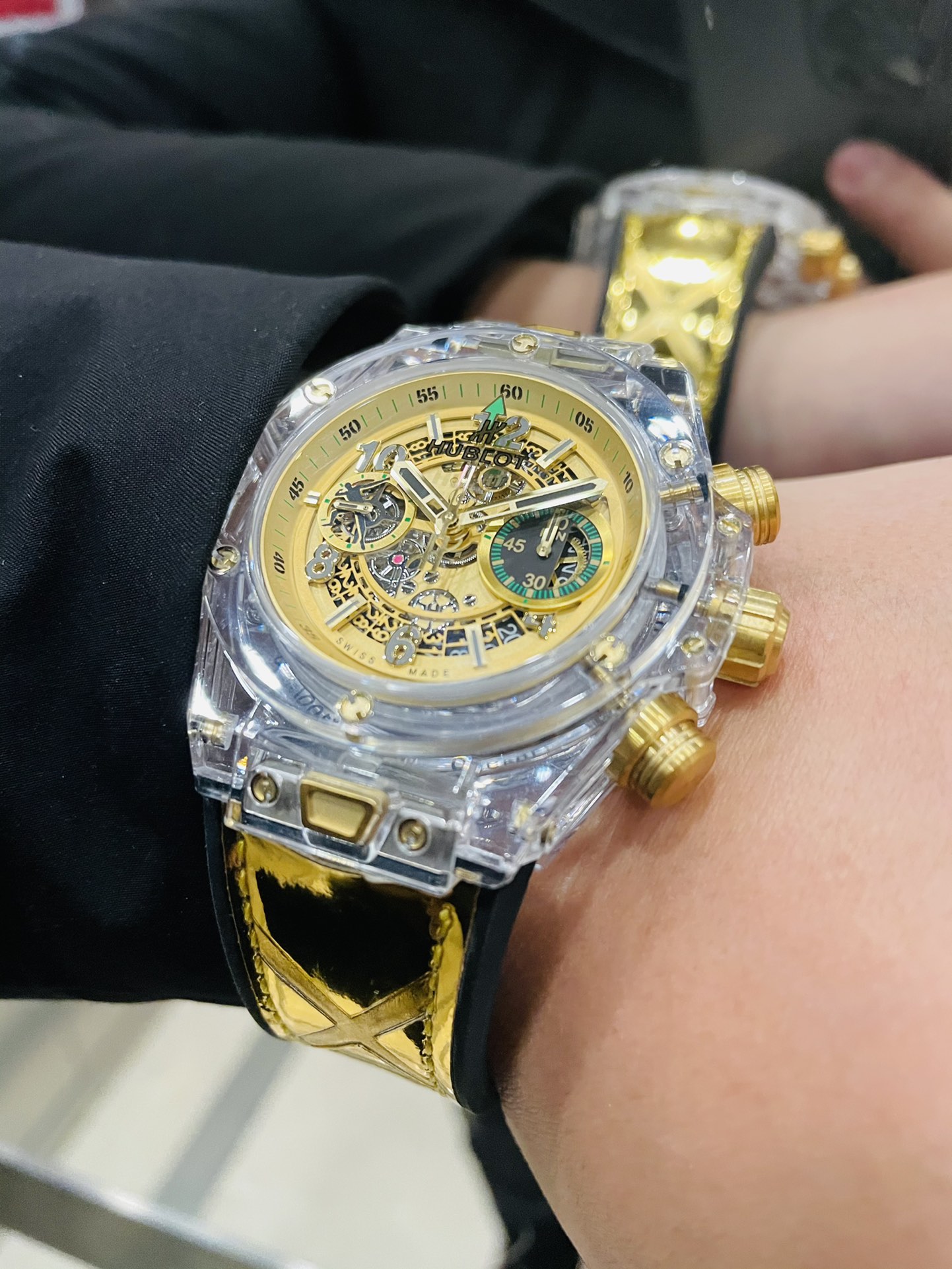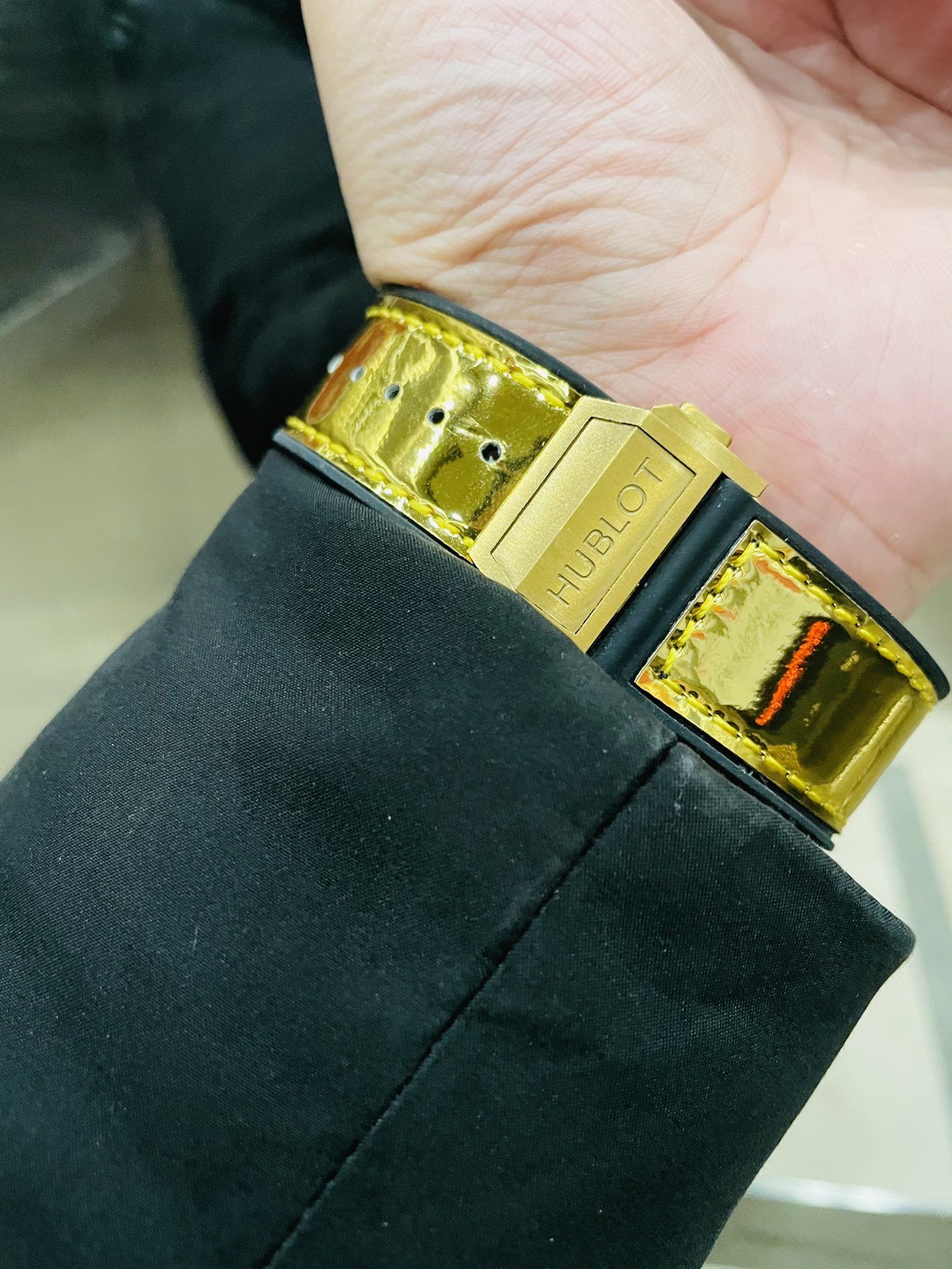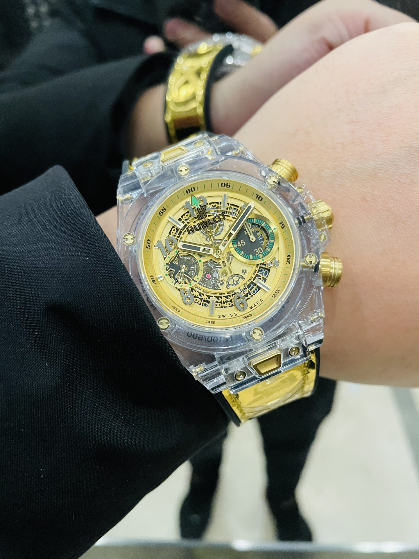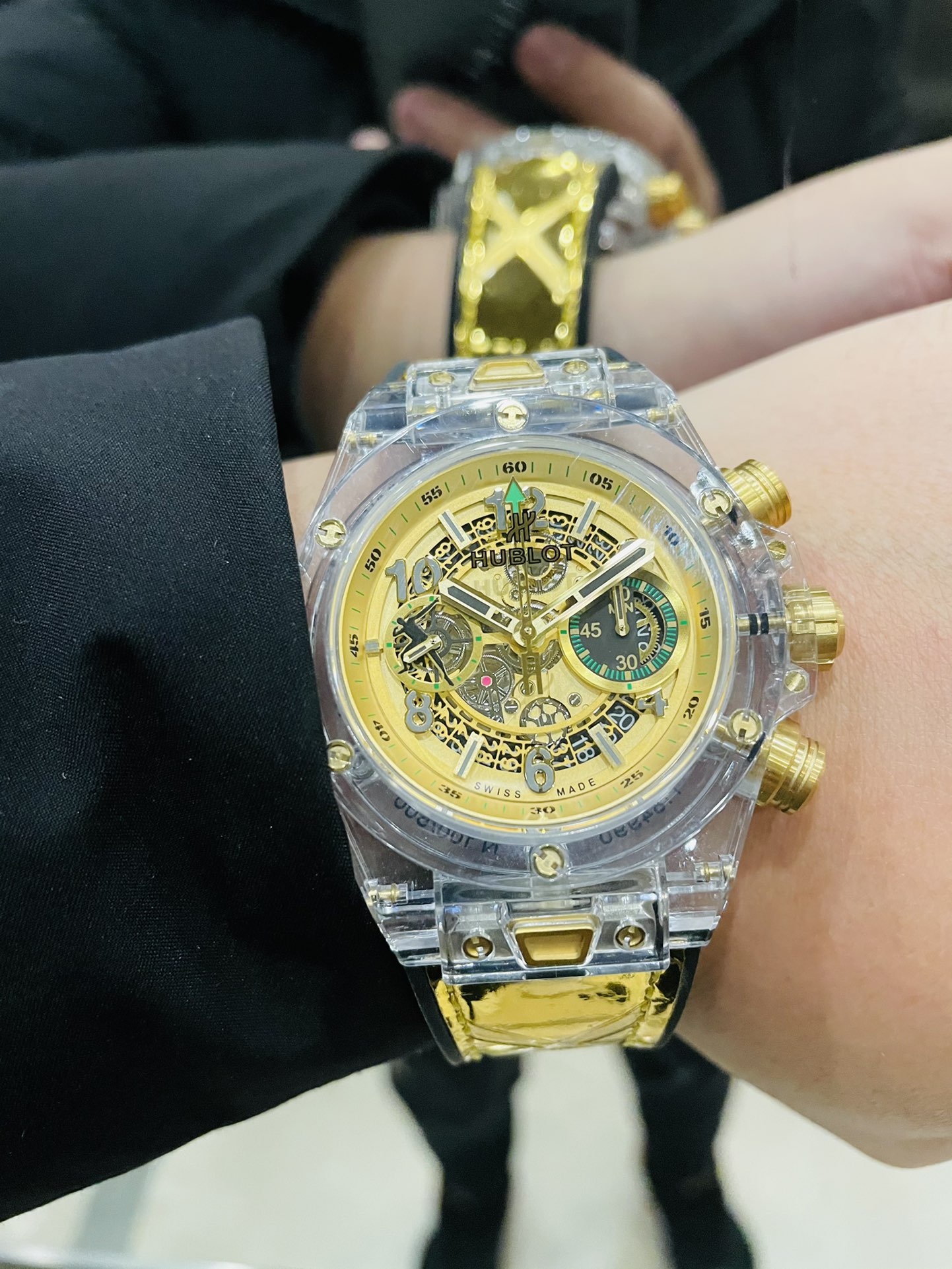 Nikmati keanggunan yang tak terputus dengan replika jam tangan pria Hublot Big Bang Unico 411.JX.4802.RT. Jam ini hadir dengan wajah kuning praktis berukuran 45mm yang memiliki dua sub-dial, angka Arab, dan penanda jam berbentuk stik, serta jendela tanggal di antara posisi pukul 4 dan 5. Lug emasnya melengkapi desain keseluruhan dengan sempurna. Dan casing kristal safir berkualitas tinggi menampilkan keanggunan dan kekuatan. Tali kulit kuningnya yang dilapisi karet hitam memberikan kenyamanan dan pegangan yang kokoh.