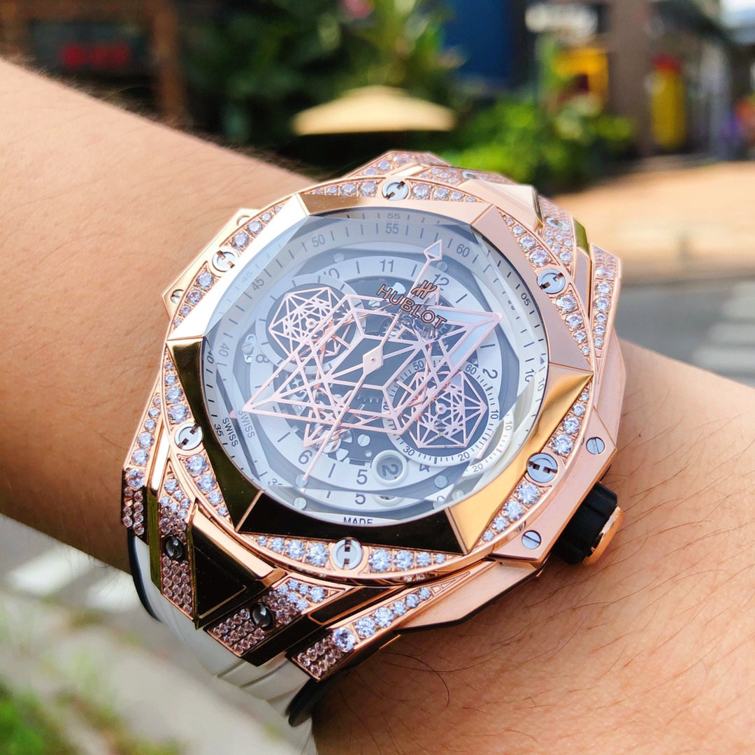 Replica Hublot Big Bang Sang Bleu II King Rose Gouden Behuizing met Diamanten 45mm Zwitsers Uurwerk