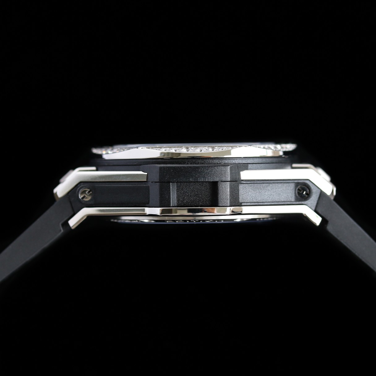 De blauwe wijzerplaat trekt onmiddellijk de aandacht met zijn gebeeldhouwde geometrische vormen en polygonenpatroon, wat een hypnotiserend effect van diepte creëert. Slanke Arabische cijferuurmarkeringen rond de rand van de wijzerplaat zijn duidelijk en elegant. De bezel, bezet met diamanten die een verblindende schittering uitstralen, omringt de wijzerplaat en benadrukt de hoogwaardige aard van het horloge.
