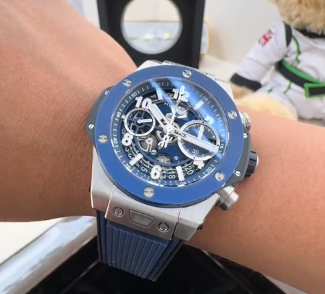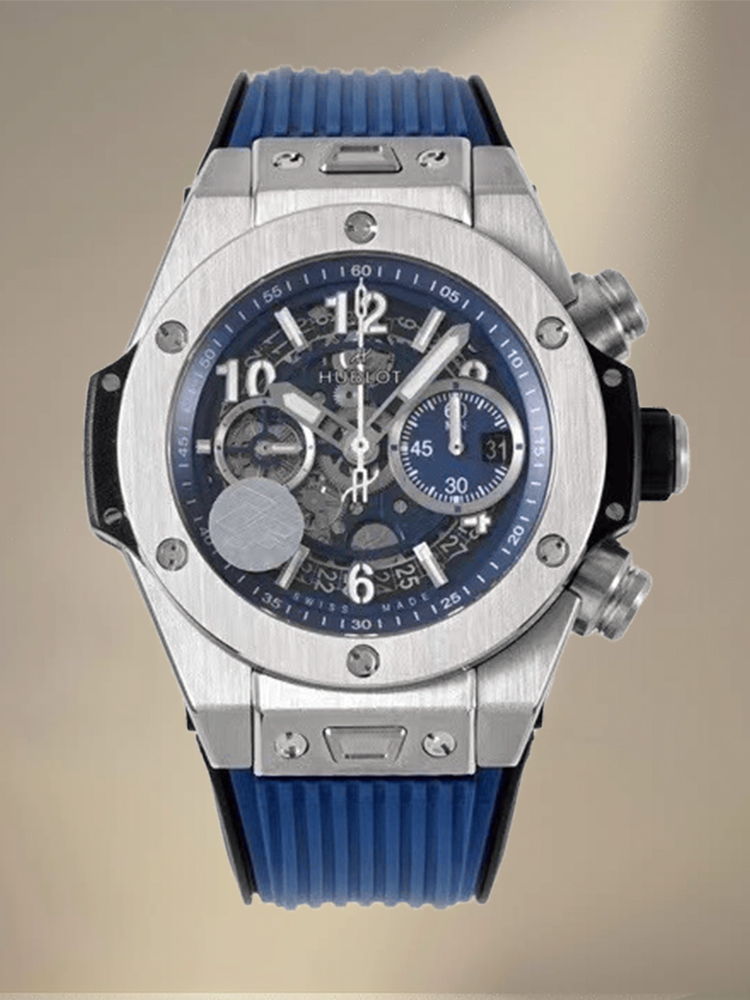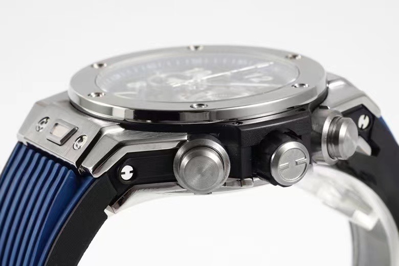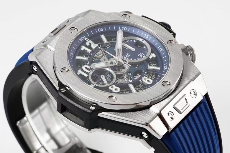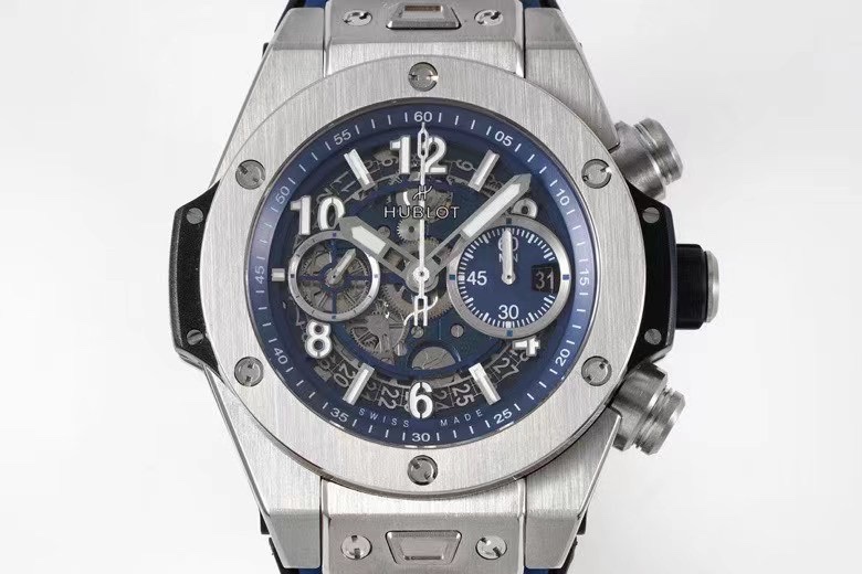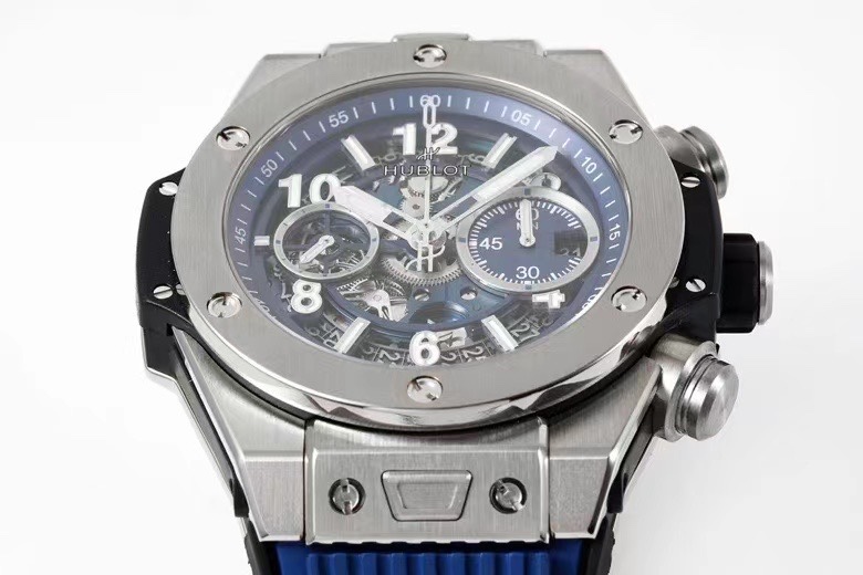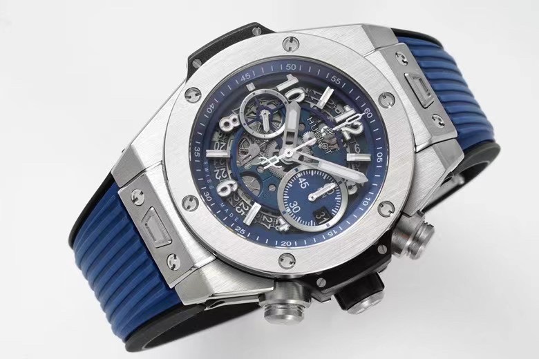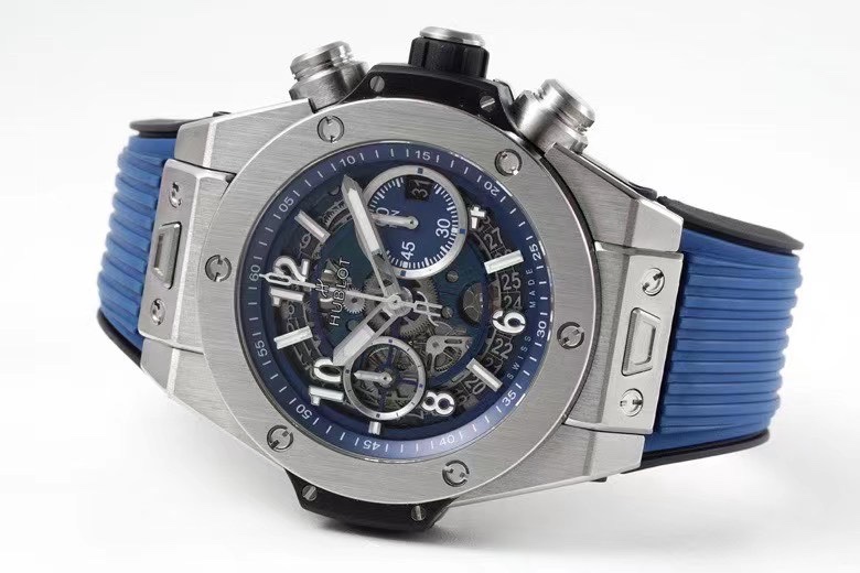 Stilfull for horologi-entusiasten, Hublot Big Bang Unico 421.NX.5170.RX-replikatet er en utstilling av toppmoderne design og slitesterk funksjonalitet. Forsterket av en energisk skeletonisert blå urskive, viser denne 44 mm klokken det intrikate sveitsiske urverket i sin fulle prakt. Underskiver er plassert på klokken 3 og 9, mens et datovindu vises klokken 3 for økt funksjonalitet.