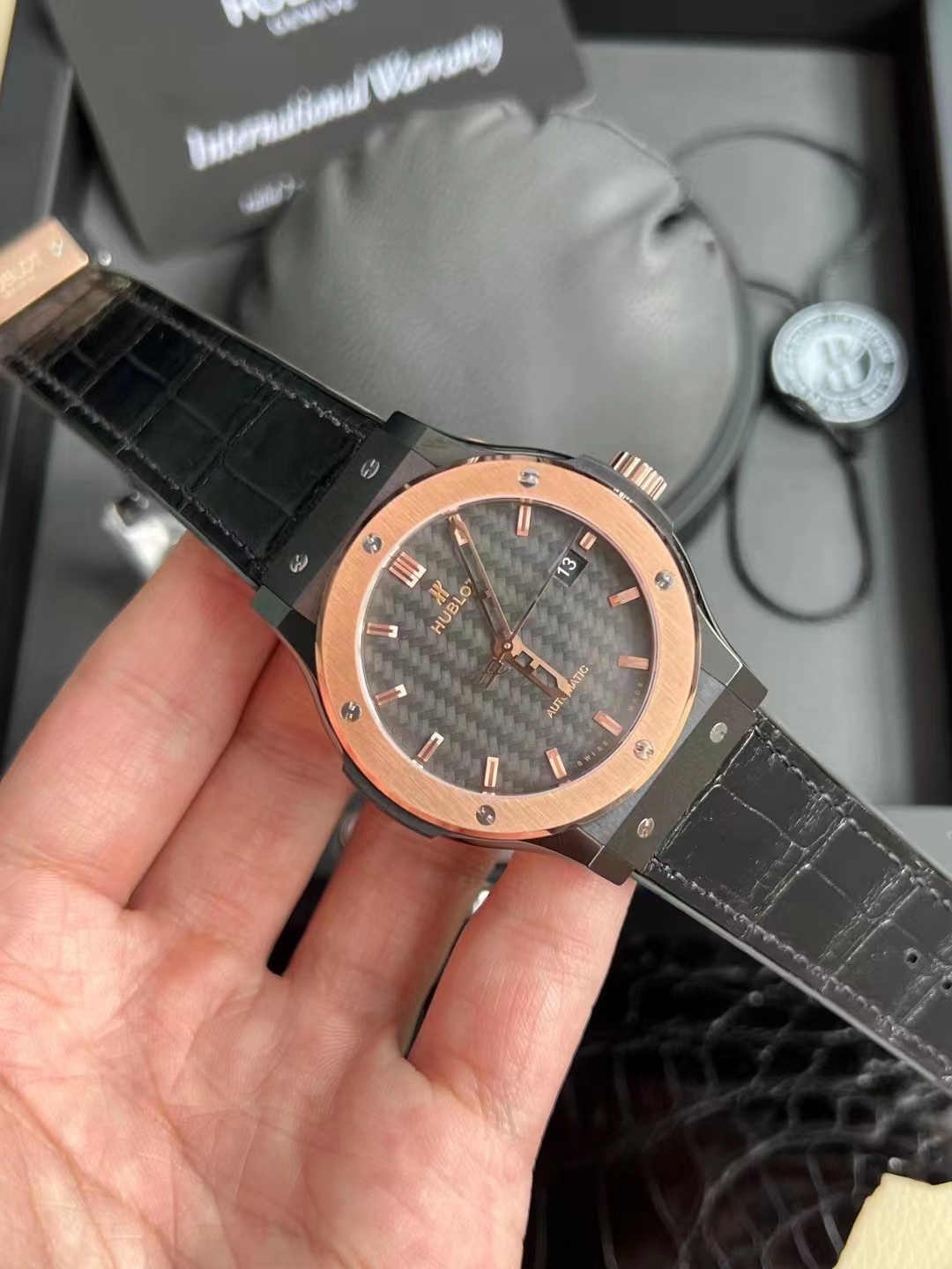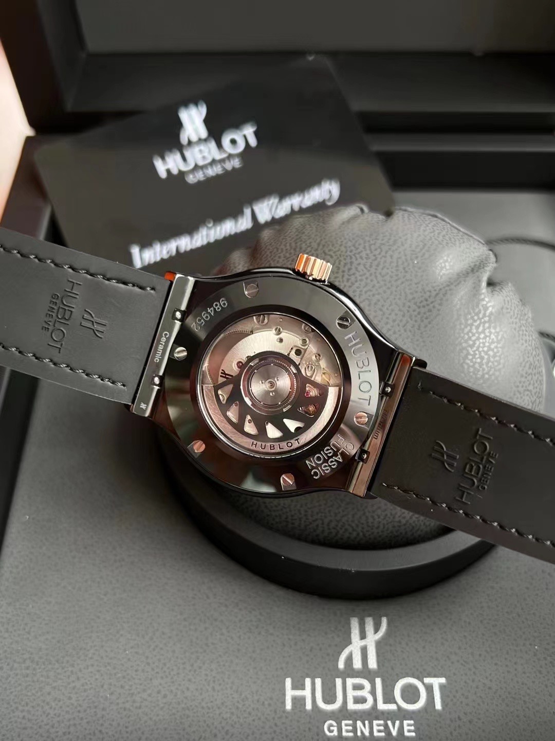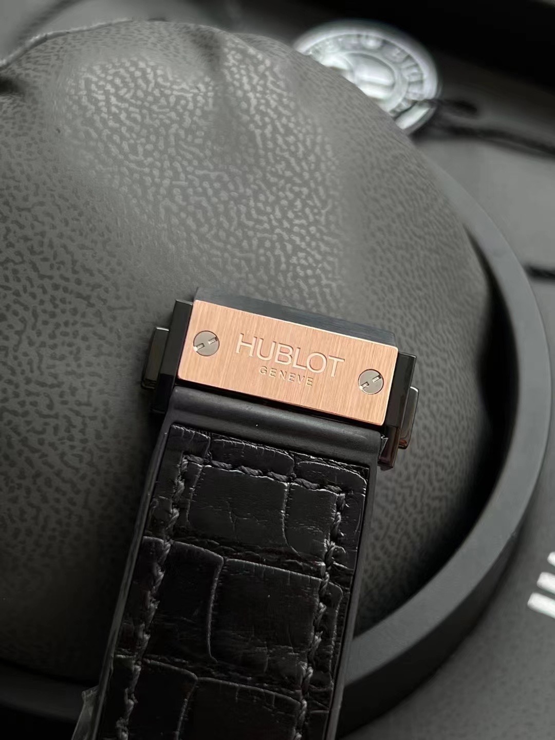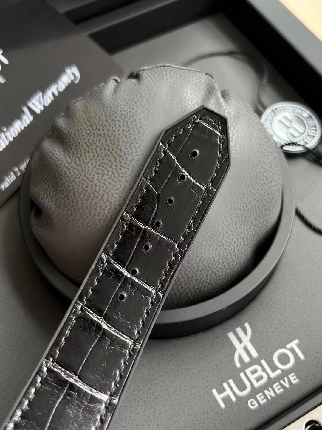 Svart lærrem fullfører antrekket og gir komfort og eleganse. Den svarte lærremmen gjør denne Hublot Classic Fusion 565.CO.1781.RX replika-klokken ideell for minimalistiske stiler kombinert med entusiaster for sterke materialer.