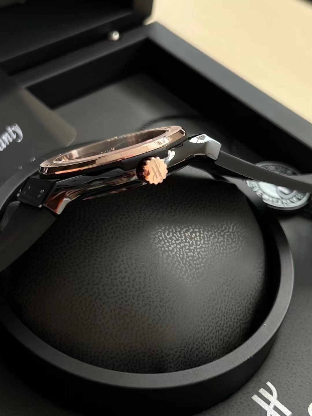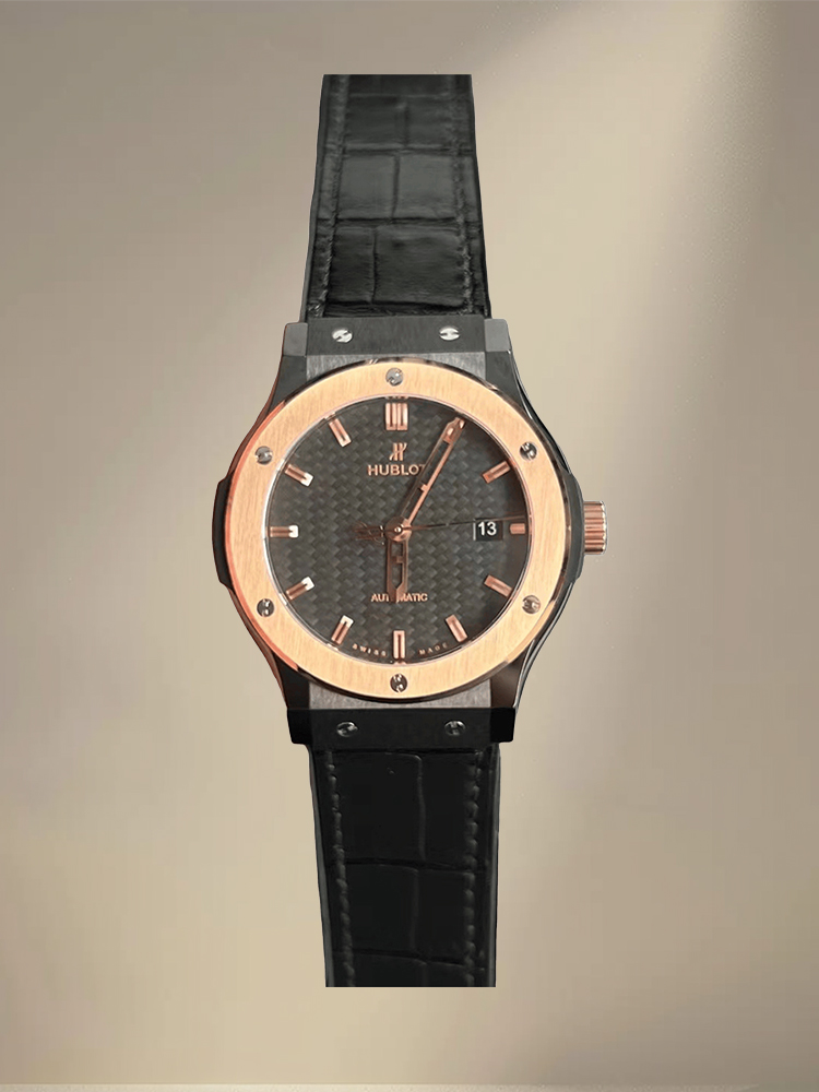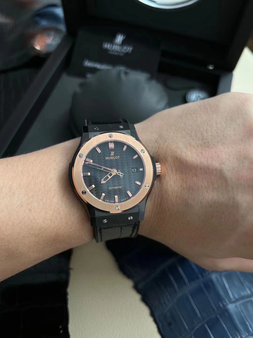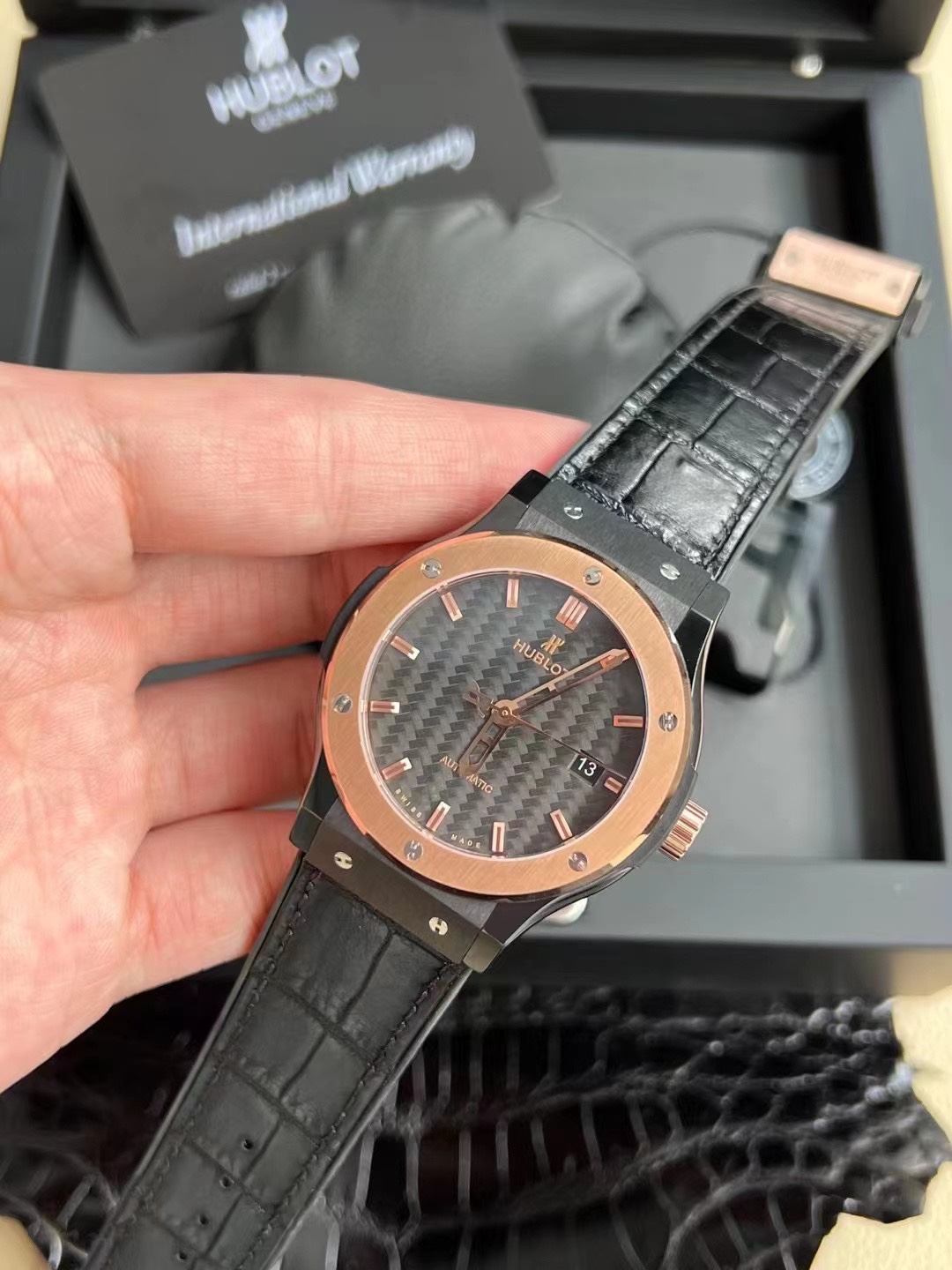 Svart lærrem fullfører antrekket og gir komfort og eleganse. Den svarte lærremmen gjør denne Hublot Classic Fusion 565.CO.1781.RX replika-klokken ideell for minimalistiske stiler kombinert med entusiaster for sterke materialer.