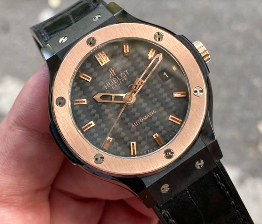 Kassen er laget av matt svart karbonfiber, en rik teksturert finish som gir den karakter og dybde. Gullfargede markører og visere fremstår vakkert mot den svarte fargen, med et diskret datovindu klokken tre.