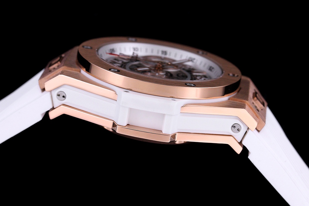 Replicasjonen av Hublot Big Bang Unico 441.OE.2010.RW er designet for å passe stilen til de som setter pris på dramatisk sofistikering. Den har et 42 mm hus i roségullbelagt rustfritt stål og en hvit gummirem med enkle linjer. Den skjelettdialen, plassert på en hvit bakgrunn, viser frem de indre mekanismene til det sveitsiske urverket.