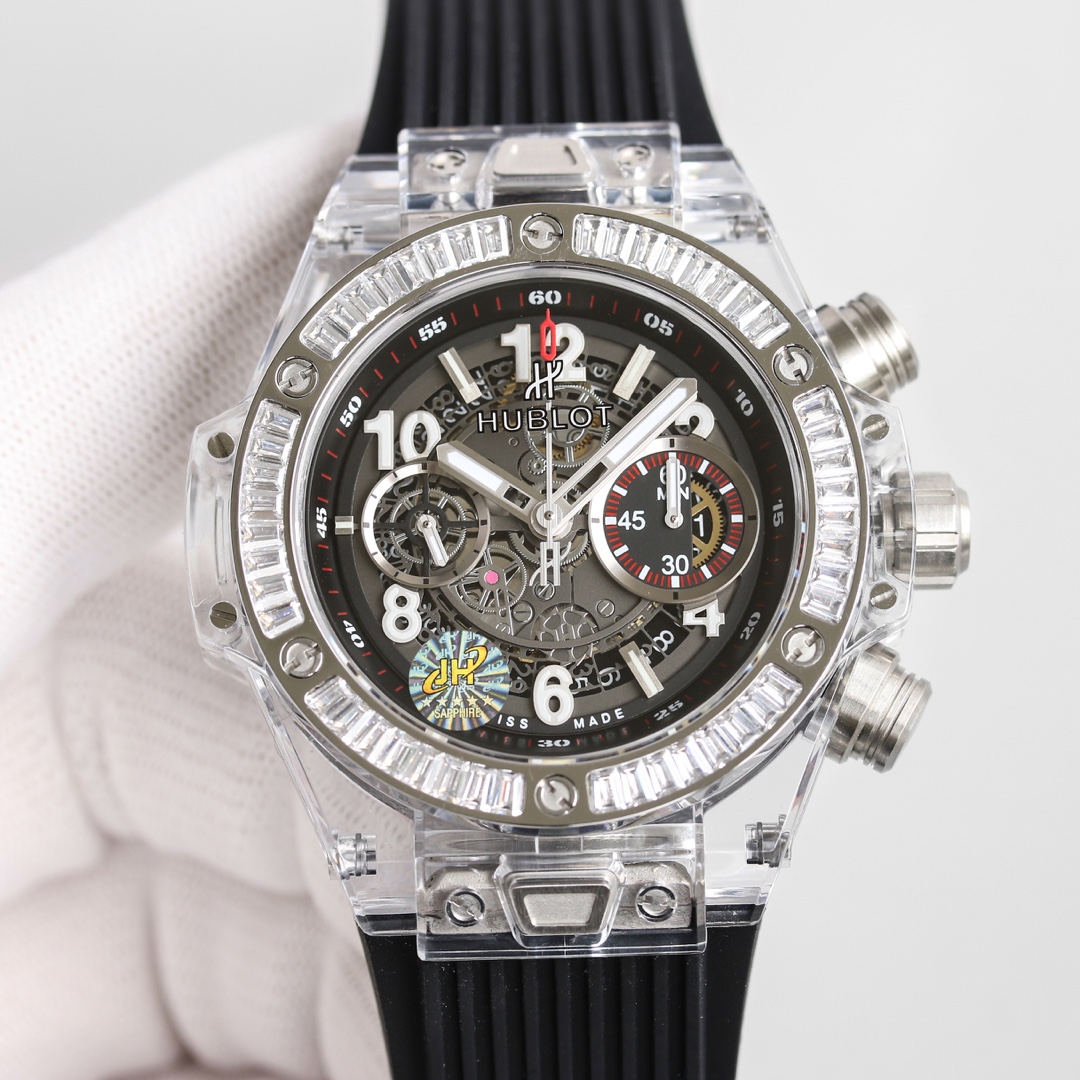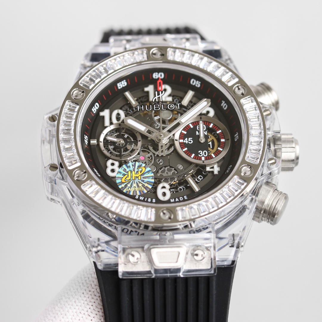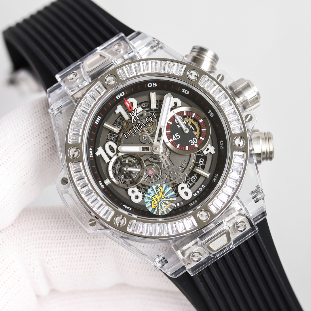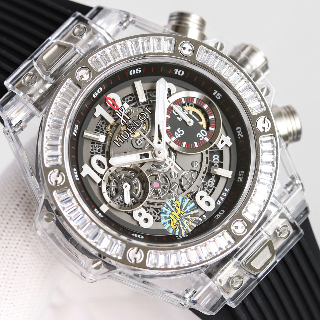 นาฬิกา AAA Replica Hublot Big Bang Unico 411.JX.1170.RX – ตัวเรือนขนาด 45 มม., หน้าปัดแบบโครงกระดูกสีดำ, ขอบเพชร, กลไกสวิส