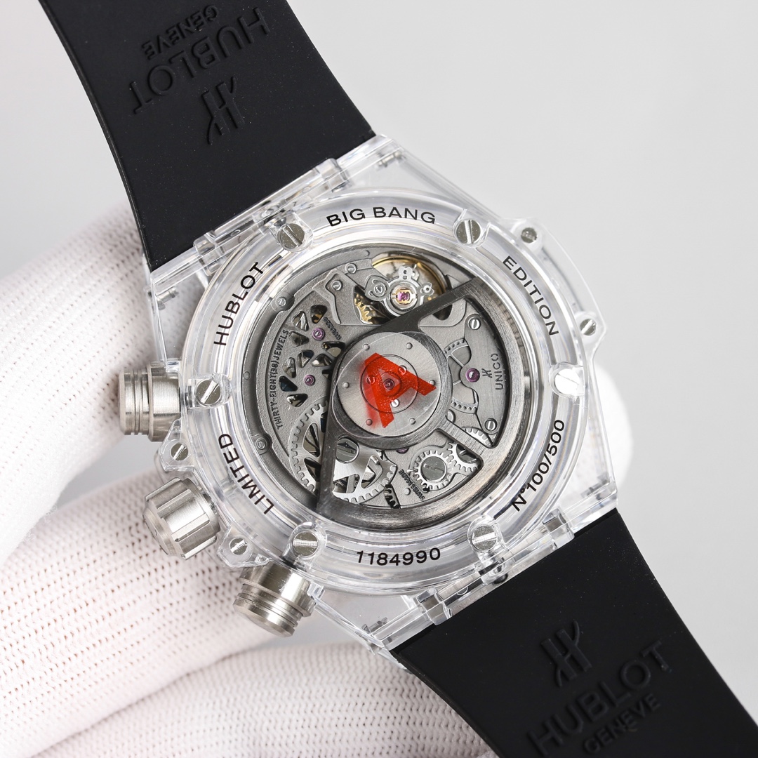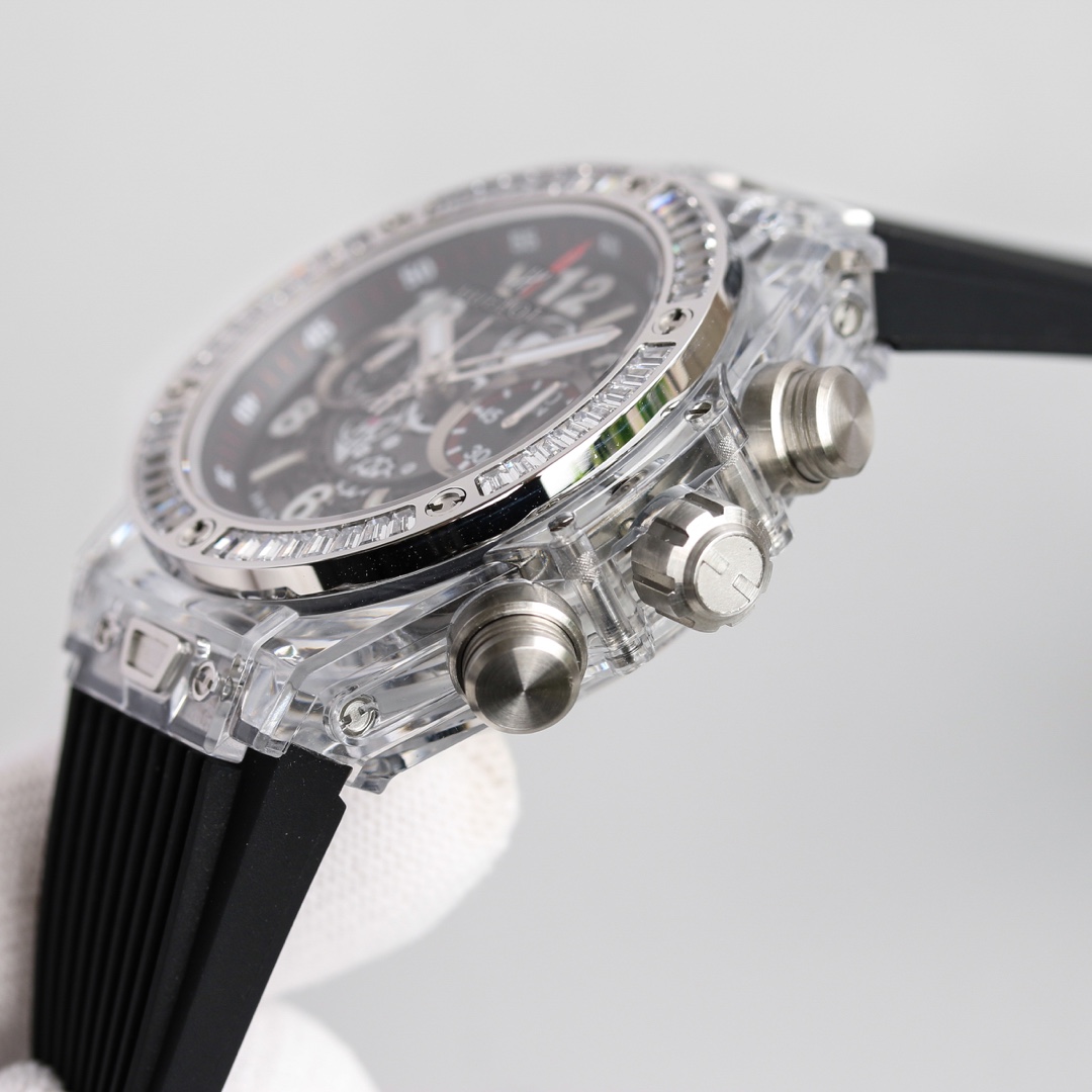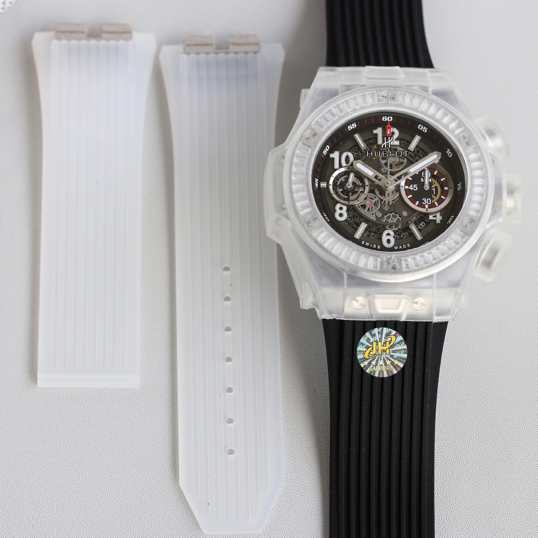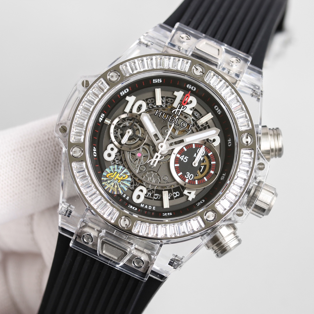 นาฬิกา AAA Replica Hublot Big Bang Unico 411.JX.1170.RX – ตัวเรือนขนาด 45 มม., หน้าปัดแบบโครงกระดูกสีดำ, ขอบเพชร, กลไกสวิส
