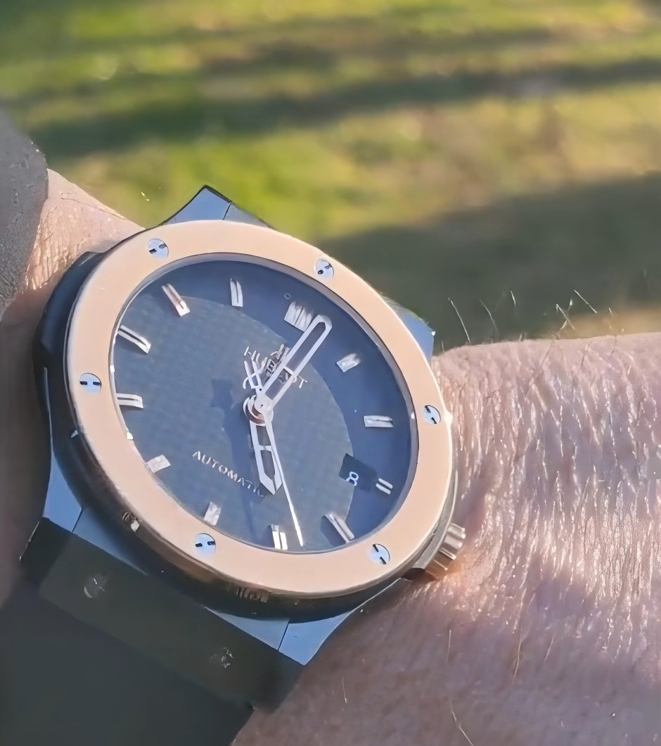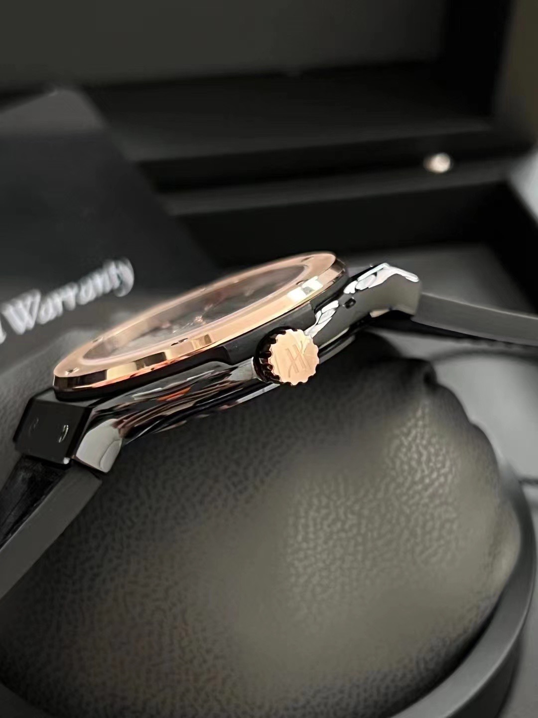 | สีหน้าปัด | ลายคาร์บอนสีดำพร้อมเข็มนาฬิกาโครงกระดูกสีโรสโกลด์และเครื่องหมายชั่วโมง 3D |