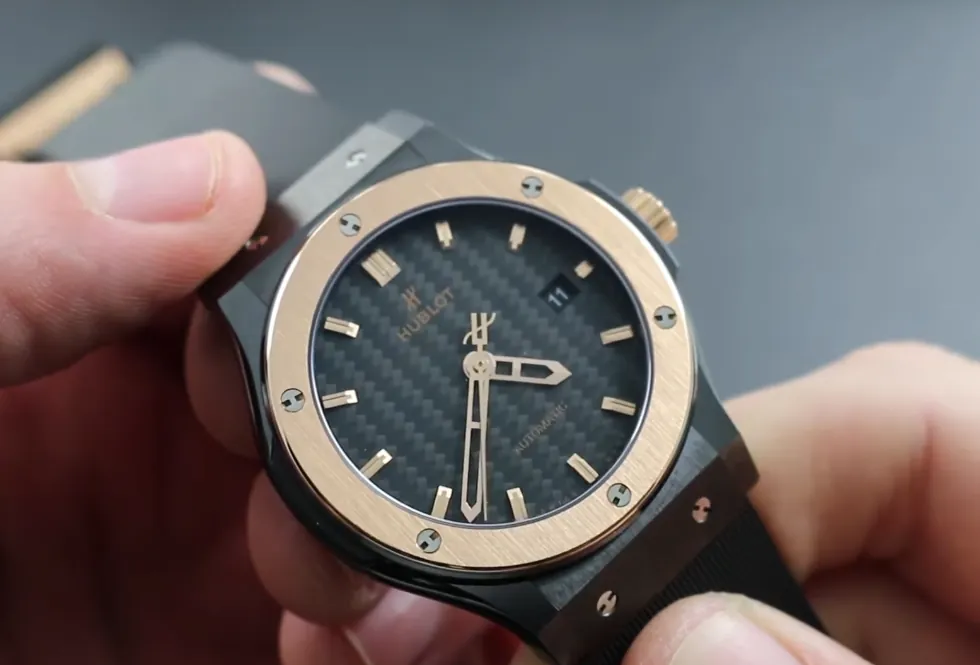 ค้นพบความซับซ้อนของนาฬิกา Hublot Classic Fusion 561.CO.1780.RX รุ่นเลียนแบบ นี่คือนาฬิกาที่มีความซับซ้อนสำหรับทั้งชายและหญิงที่มาพร้อมกับสไตล์และวัตถุประสงค์ นาฬิกามีตัวเรือนเซรามิกสีดำขนาด 38 มม. ที่โดดเด่นด้วยหน้าปัดลายคาร์บอนสีดำที่ชัดเจนและเข็มนาฬิกาสีโรสโกลด์แบบโครงกระดูกพร้อมเครื่องหมายชั่วโมงสามมิติ หน้าต่างวันที่ที่ตำแหน่ง 3 นาฬิกาช่วยเพิ่มความสะดวกสบายโดยไม่ลดทอนความสวยงาม