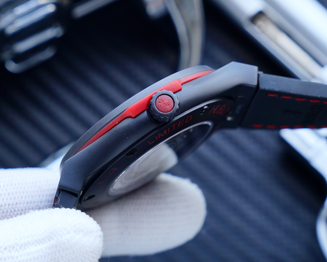 นาฬิกานี้มาพร้อมกับสายหนังสีแดงพันรอบยางธรรมสีดำ สร้างเอฟเฟกต์ทางสายตาและความสะดวกสบายในการสวมใส่แม้จะเป็นเวลาหลายชั่วโมง นาฬิกาขับเคลื่อนด้วยกลไกสวิสที่ทนทานซึ่งให้การบอกเวลาที่แม่นยำและราบรื่น หรูหราด้วยกระจกแซฟไฟร์ที่ปกป้องหน้าปัด กันน้ำได้ถึง 50 เมตร และพร้อมสำหรับการผจญภัยในชีวิตประจำวัน