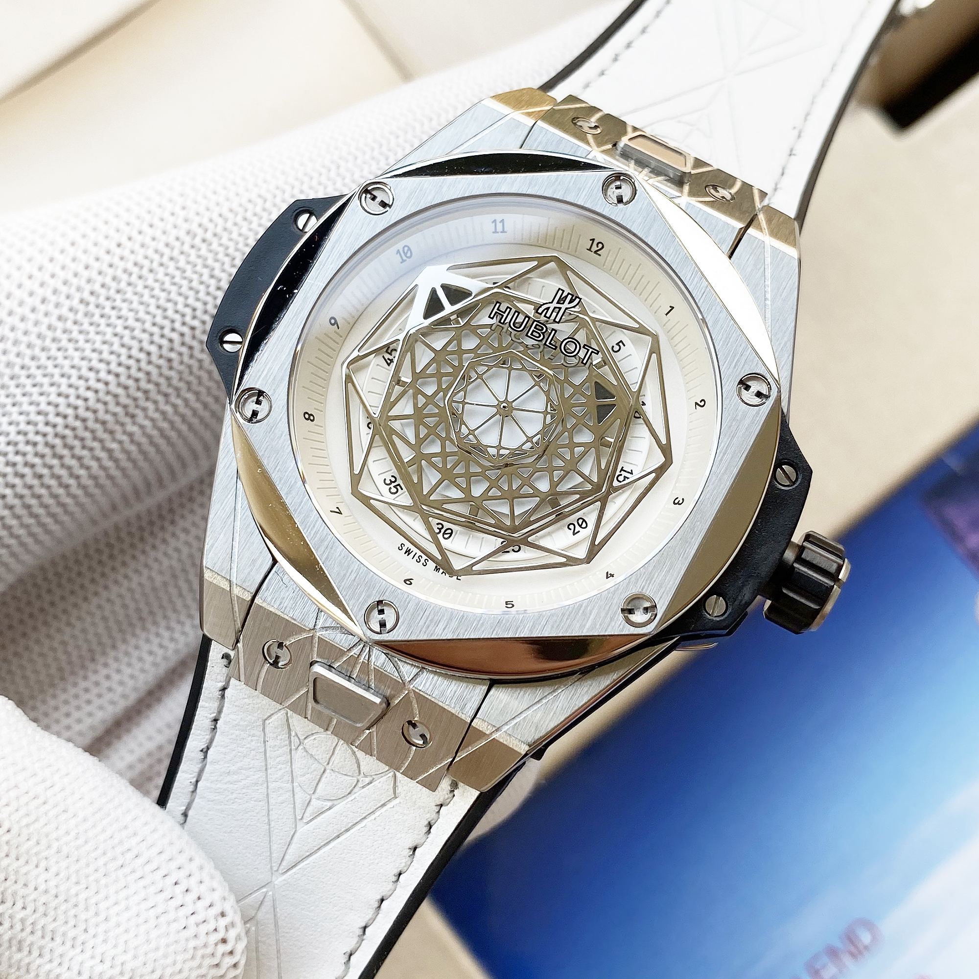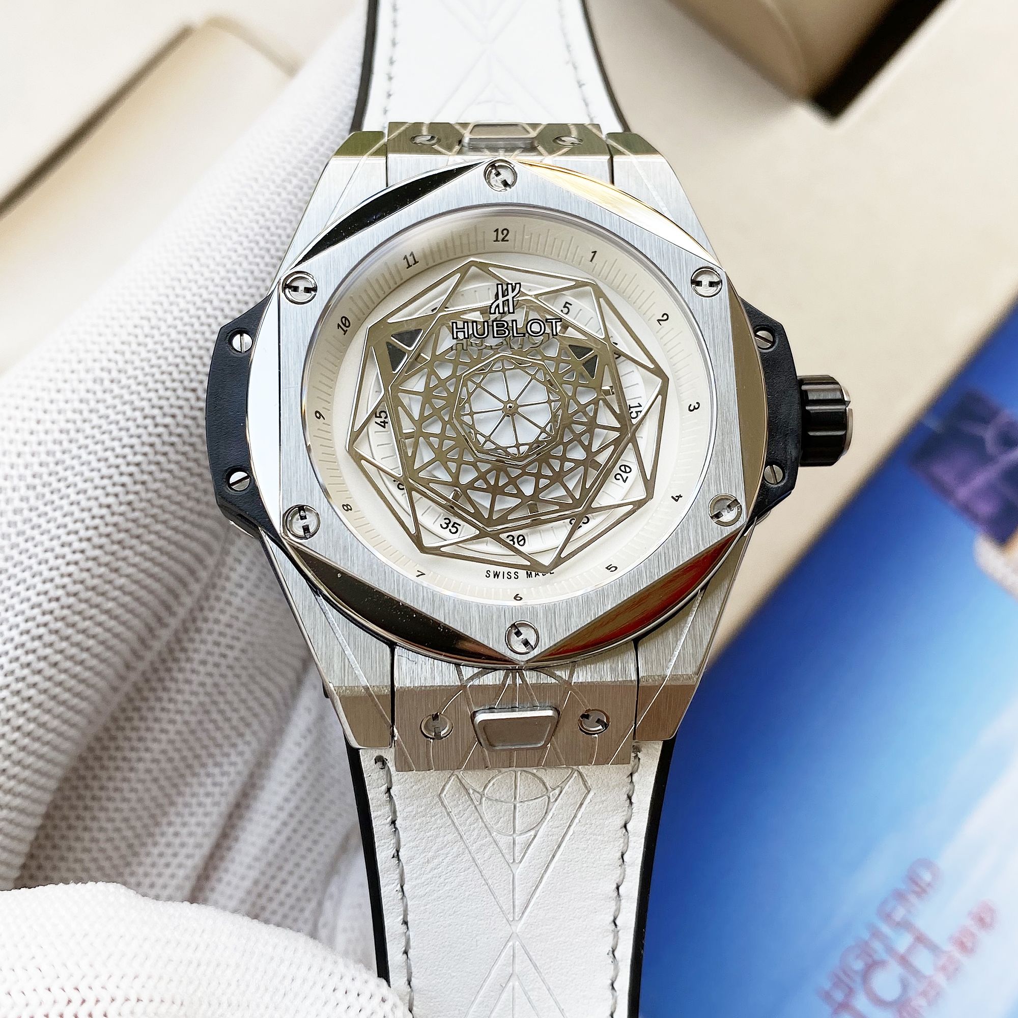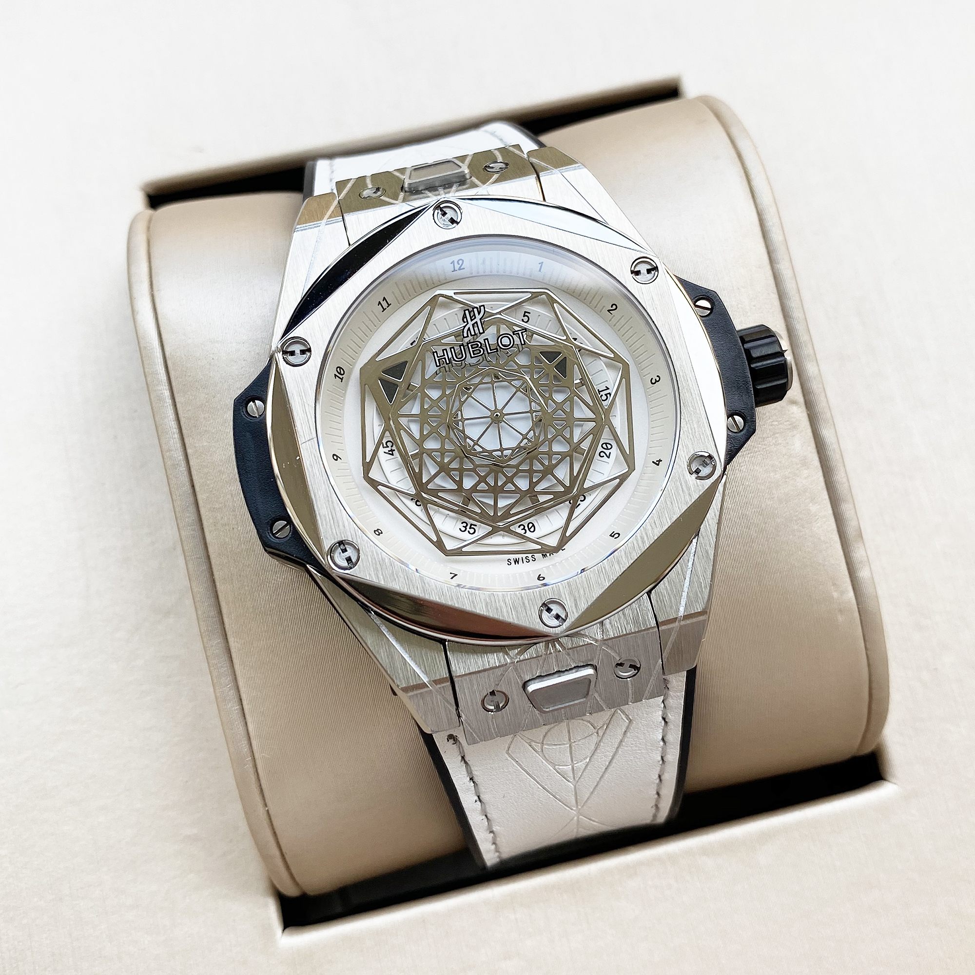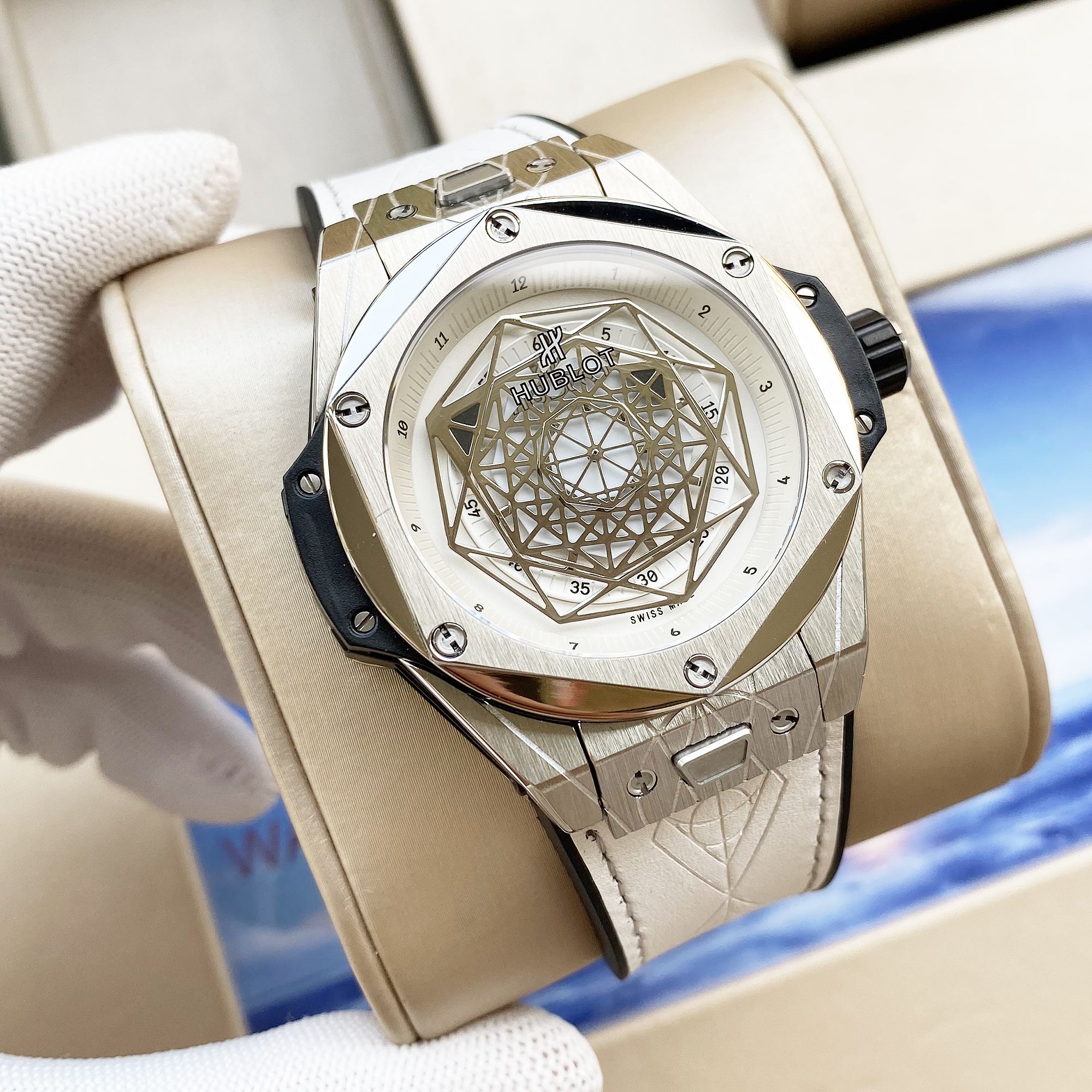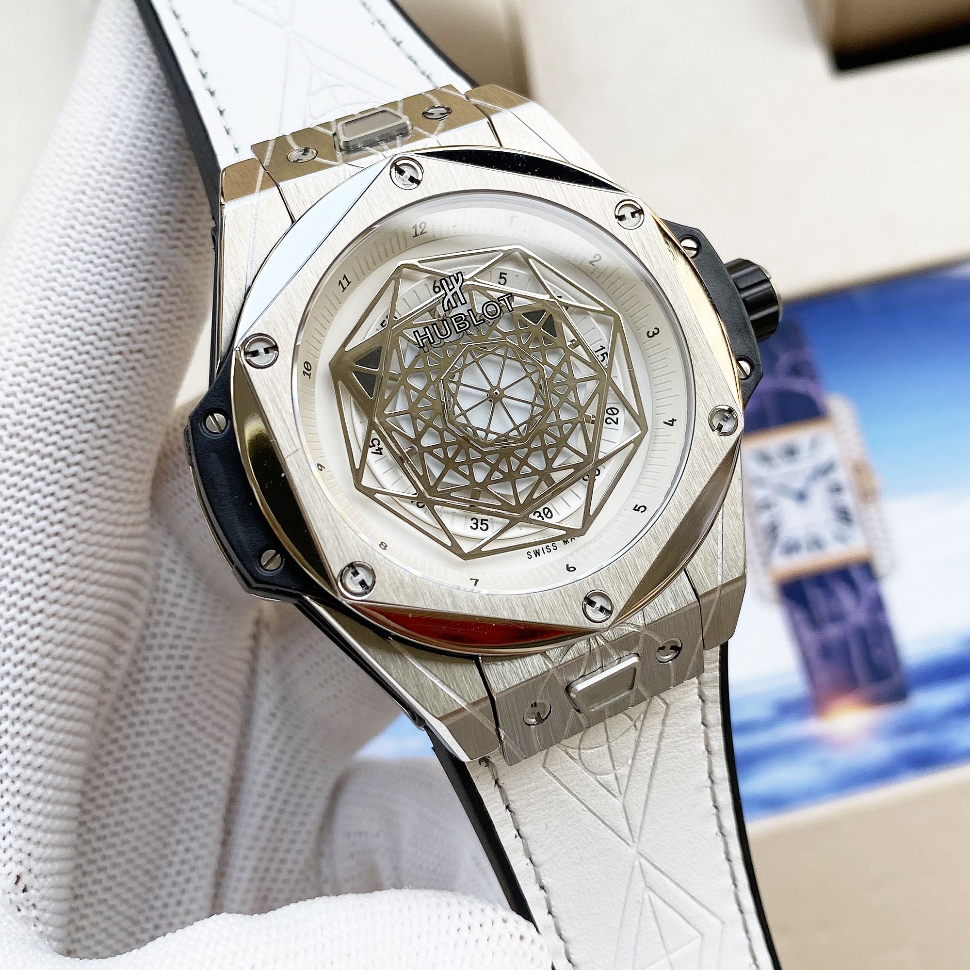 หน้าปัดเปิดและเข็มโครงกระดูกทรงแปดเหลี่ยมแสดงให้เห็นถึงการเคลื่อนไหวของสวิสที่ทำงานอยู่ พร้อมสายหนังสีขาวและกระจกแซฟไฟร์ที่ทนต่อรอยขีดข่วน กันน้ำได้ถึง 50 เมตร เหมาะสำหรับการใช้งานในชีวิตประจำวัน