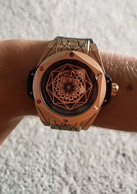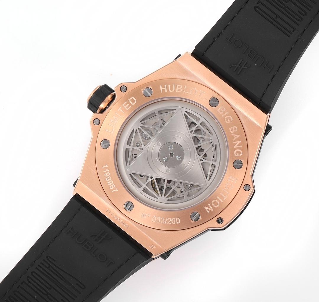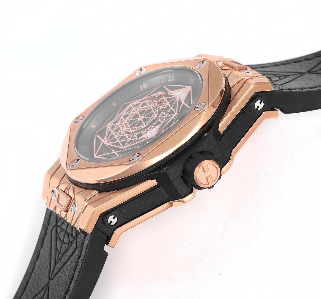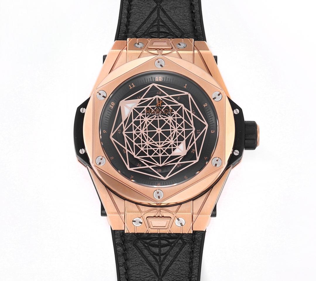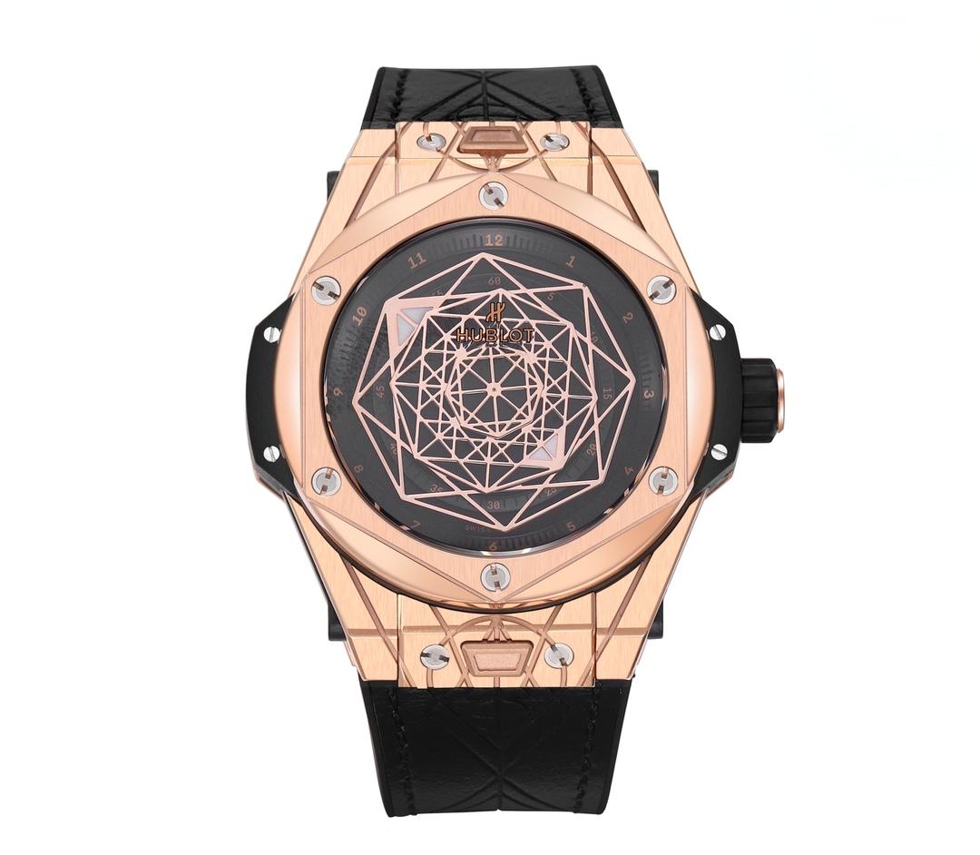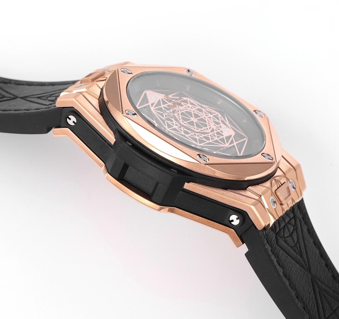 สร้างความโดดเด่นด้วยนาฬิกา Hublot Big Bang 415.OX.1118.VR.MXM17 รุ่นเลียนแบบ – การผสมผสานที่ได้รับแรงบันดาลใจจากกีฬา ความหรูหรา และสไตล์ที่ทันสมัย ด้วยตัวเรือนทองคำชมพู 18k ขนาด 45 มม. นาฬิกานี้เปล่งประกายด้วยหน้าปัดโครงกระดูกที่น่าสนใจซึ่งมีการออกแบบเรขาคณิตสามชั้นในสีทองชมพูบนพื้นหลังสีดำ