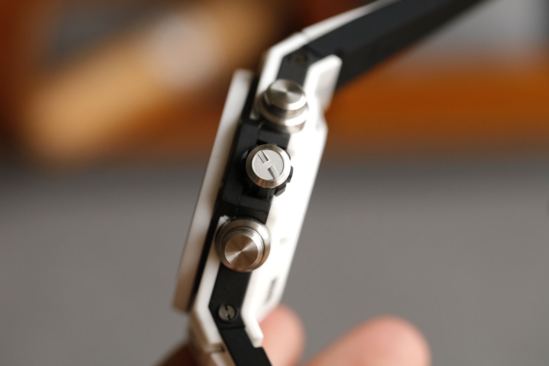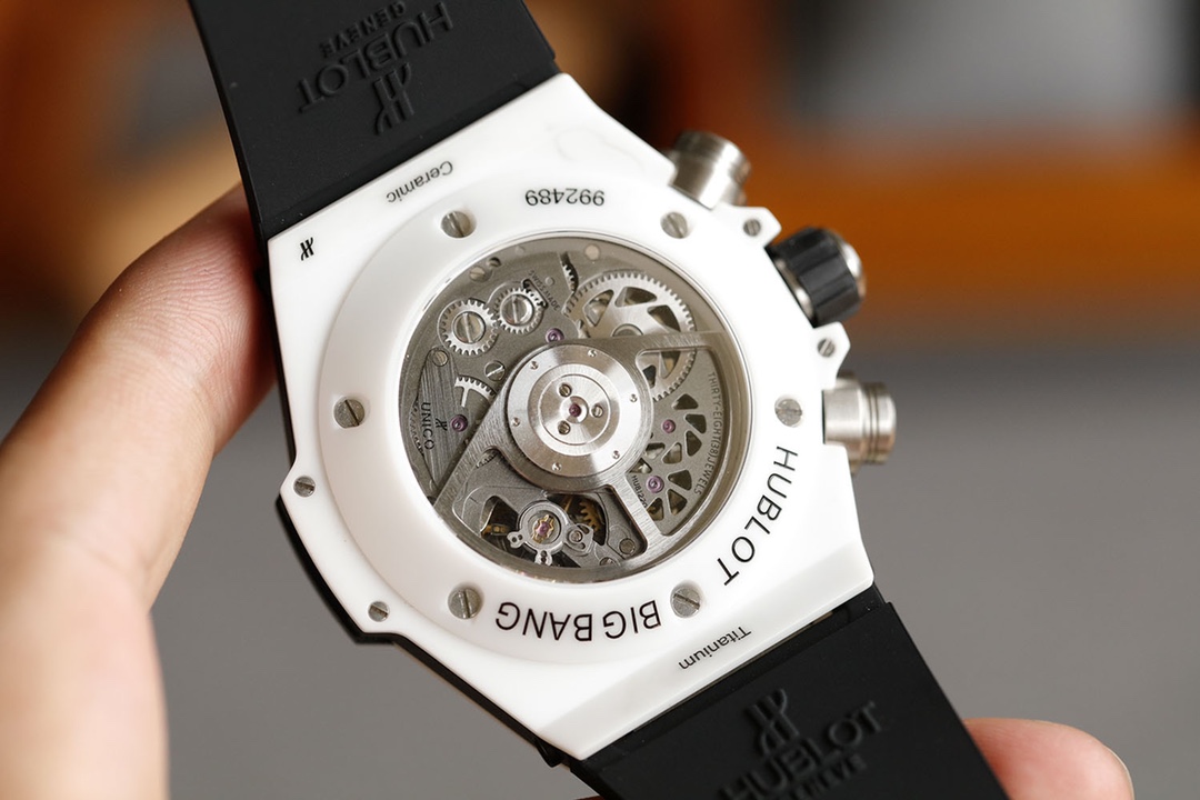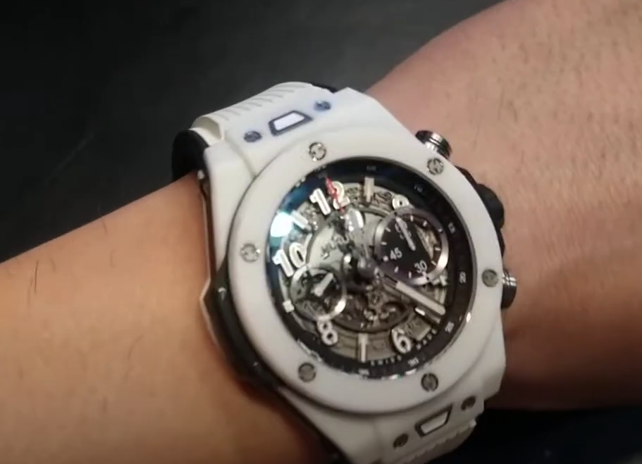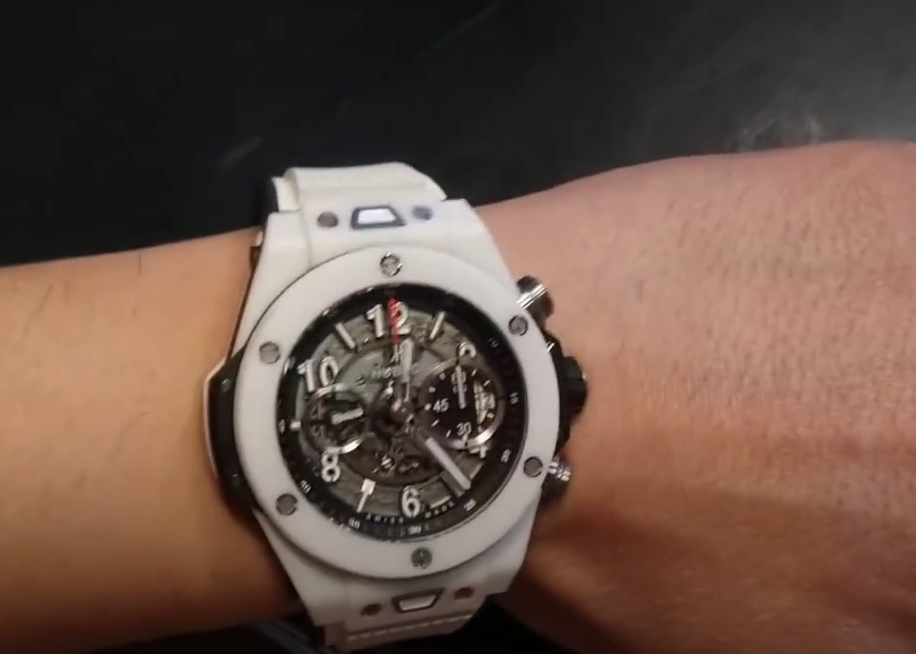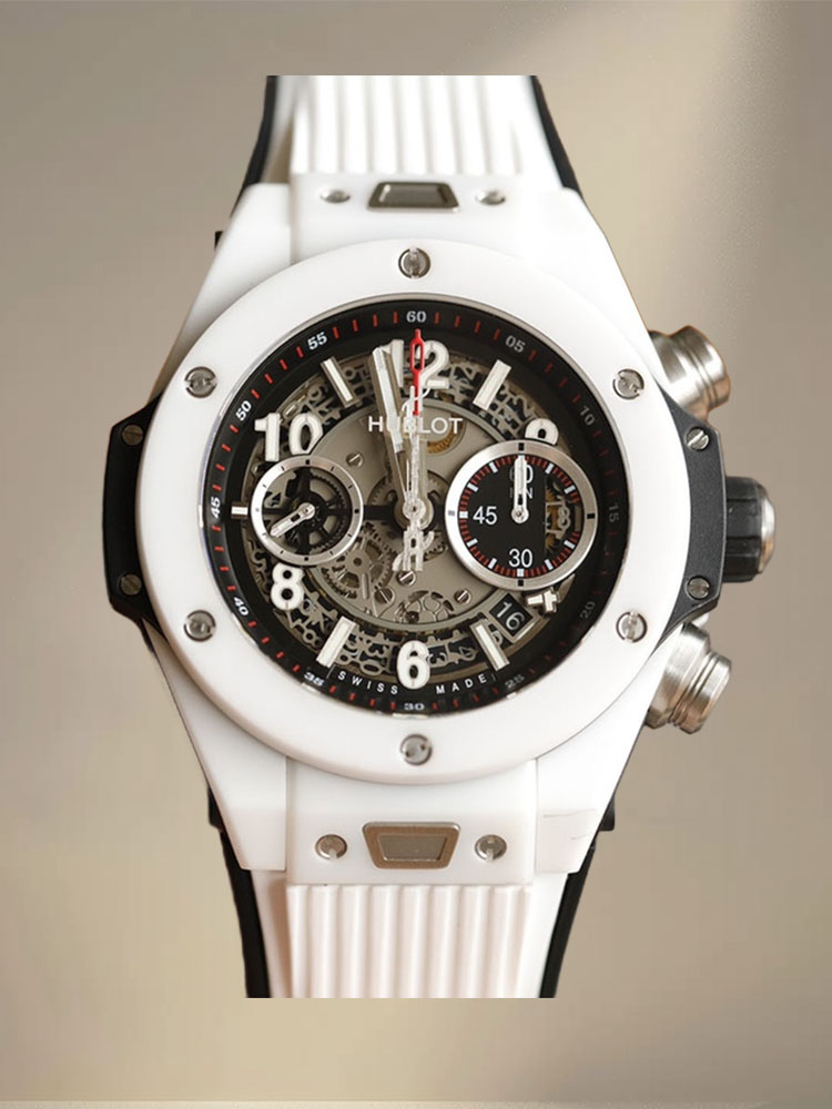 นาฬิกา Hublot Big Bang 411.NM.1170.RX รุ่นเลียนแบบมีขนาดตัวเรือน 45.5 มม. พร้อมหน้าปัดแบบสเกลเลตัน ตัวเลขชั่วโมงที่มีการเคลือบเรืองแสง ตัวเลขอารบิก เข็มนาฬิกาที่มีการสเกลเลตันบางส่วนและเรืองแสง เคาน์เตอร์โครโนกราฟ 60 นาที แสดงวันที่ที่ตำแหน่ง 3 นาฬิกา และวินาทีที่ตำแหน่ง 9 นาฬิกา หน้าปัดทำจากเซรามิกสีขาวมาพร้อมกับสายยางสีขาวที่ให้ความสะดวกสบายและทนทาน โดยมีการเคลื่อนไหวของสวิสเพื่อความแม่นยำ นาฬิกามีคริสตัลซาฟไฟร์และกันน้ำได้ถึง 50 เมตร สายยางที่นำเข้ามาที่นี่ไม่เพียงแต่ให้สไตล์ แต่ยังมีความทนทานเป็นนาฬิกาที่คู่ควรแก่การครอบครอง