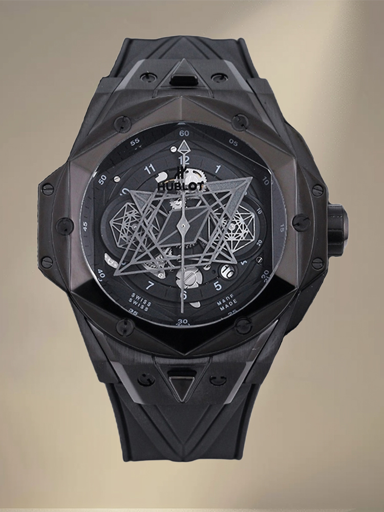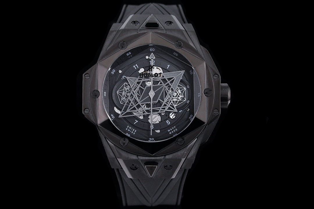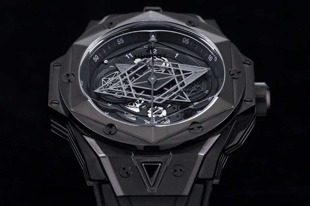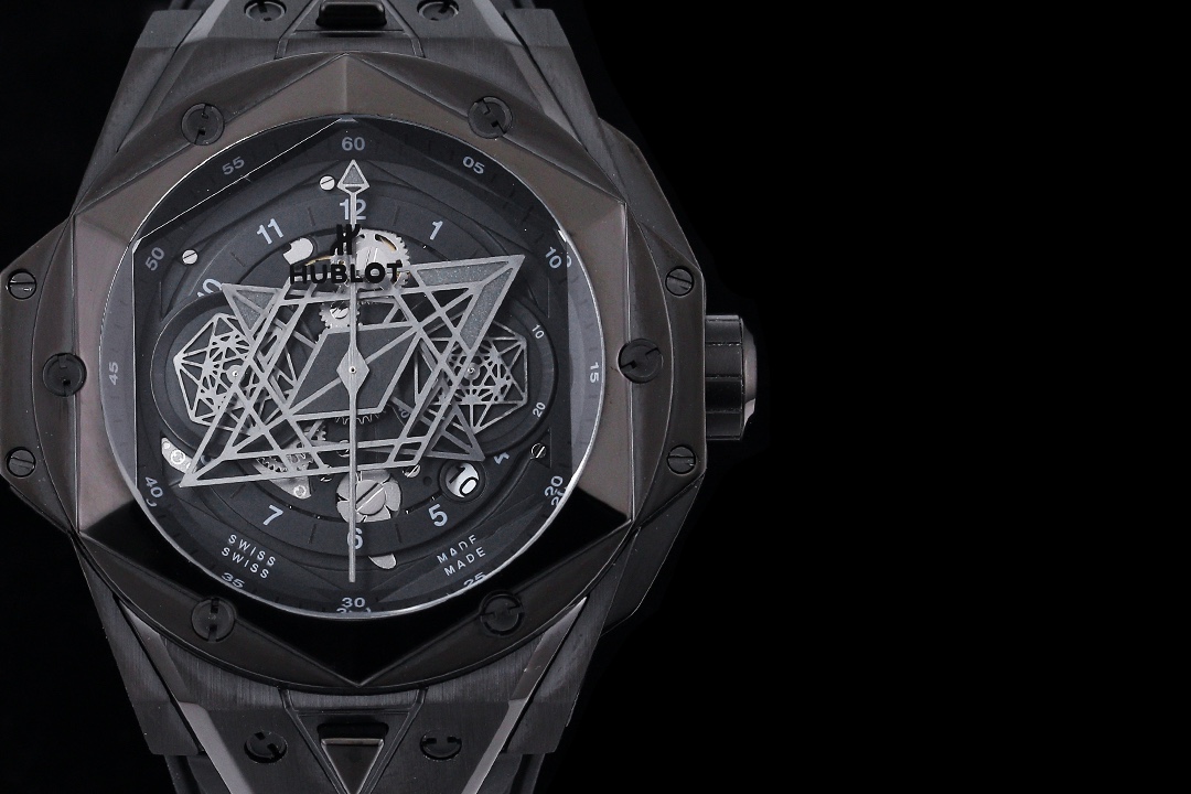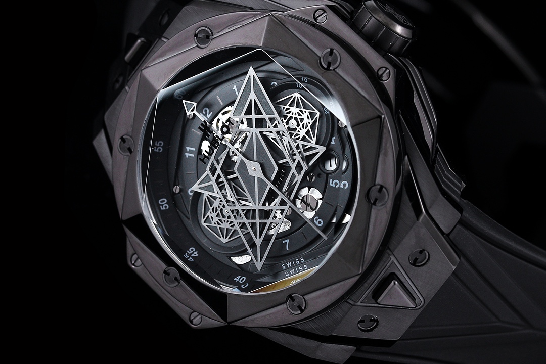 กล้าหาญ, มีรูปทรงเรขาคณิต, และมีศิลปะอย่างไม่อาย — นาฬิกา Hublot Big Bang Sang Bleu II 418.CX.1107.RX.MXM22 รุ่นเลียนแบบนี้เป็นนาฬิกาที่แตกต่างจากที่เคยมีมา ตัวเรือนทำจากเซรามิกสีดำ ขนาด 45 มม. ที่แข็งแกร่ง และเพื่อเพิ่มความหรูหรา ยังประดับด้วยหน้าปัดสถาปัตยกรรมที่ซับซ้อนและมีรายละเอียดกราฟิกที่อลังการ ในแบบสเกลตัน มันเผยให้เห็นหัวใจที่เต้นของกลไกภายใน พร้อมหน้าปัดย่อยหกเหลี่ยมและเข็มชั่วโมงและนาทีที่มีรูปทรงเหมือนเพชร สร้างสรรค์ลวดลายเรขาคณิตที่ดึงดูดสายตาขณะที่เวลาผ่านไป.