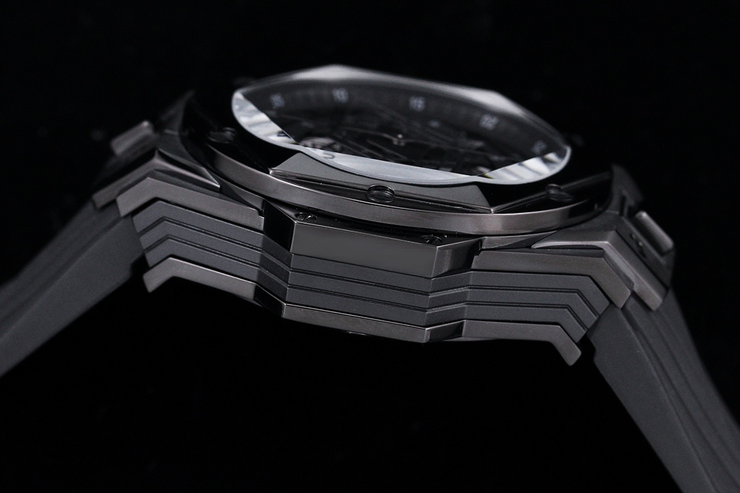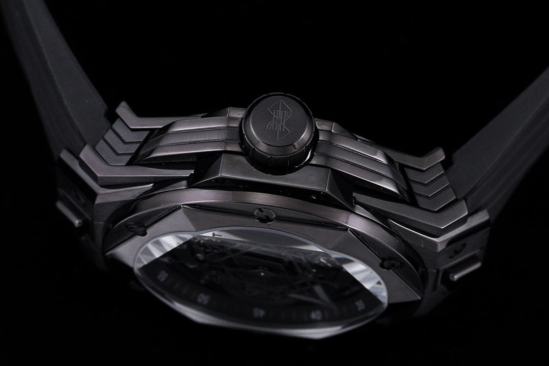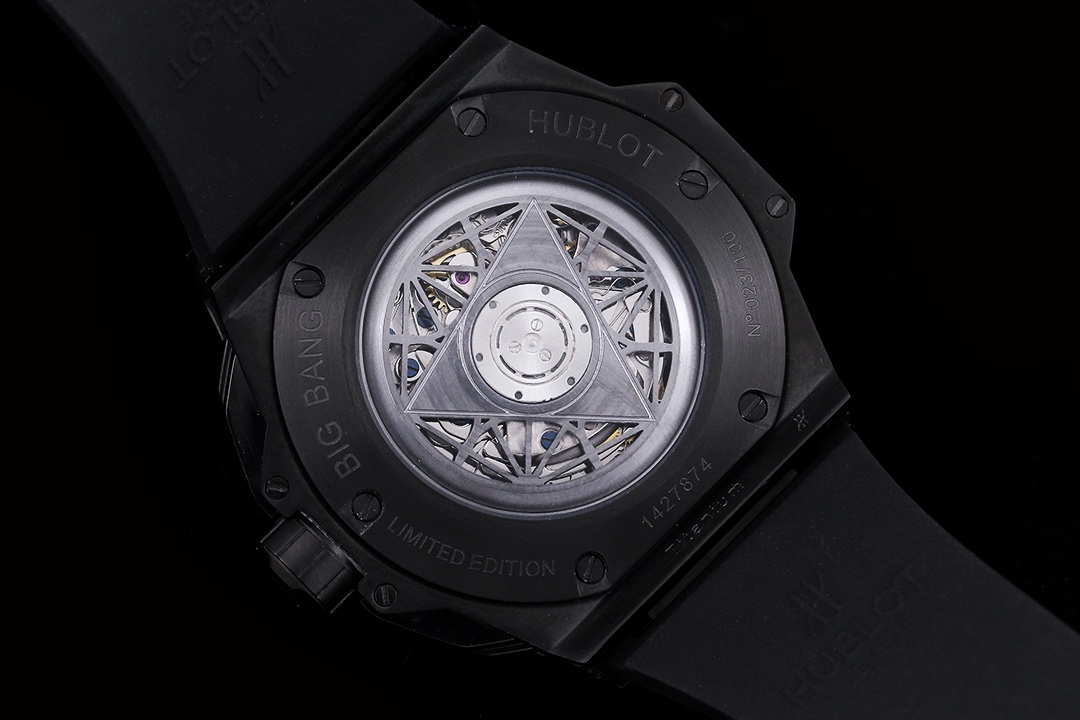 ยึดด้วยสกรูไทเทเนียมรูปตัว H หกตัว ขอบนาฬิกาหกเหลี่ยมเพิ่มมิติและความลึกให้กับนาฬิกา ขาเชื่อมที่มีขอบคมและสายยางสีดำหนาให้ความรู้สึกหรูหราในแบบทันสมัย นาฬิกานี้ขับเคลื่อนด้วยกลไกความแม่นยำของสวิสและกระจกแซฟไฟร์ที่ทนต่อรอยขีดข่วนและปกป้องมัน นาฬิกาในรุ่นลิมิเต็ดเอดิชั่นนี้ยังมีความสามารถกันน้ำได้ถึง 50 เมตร.