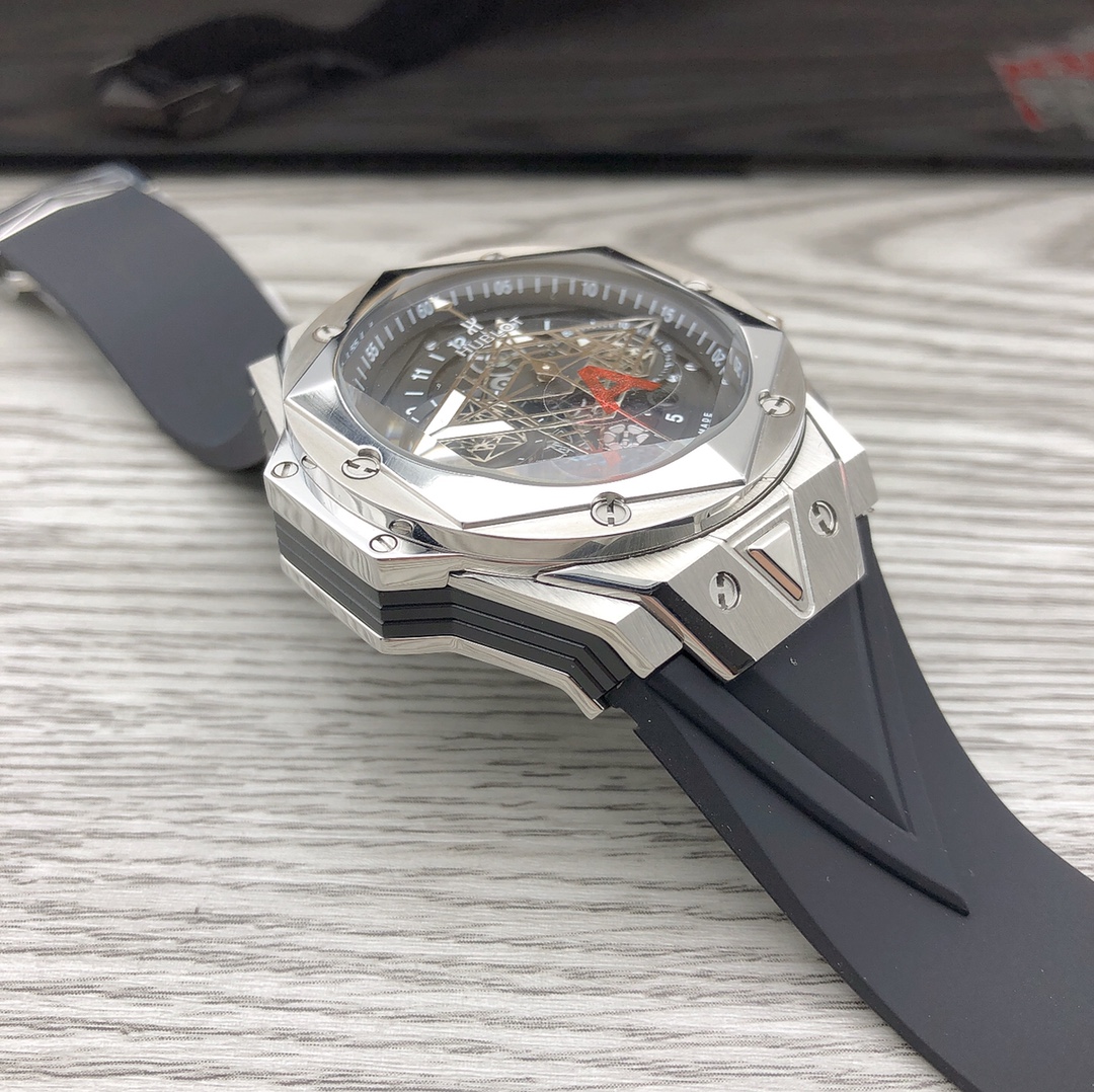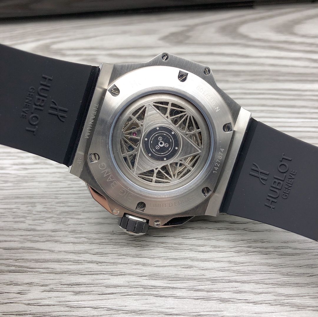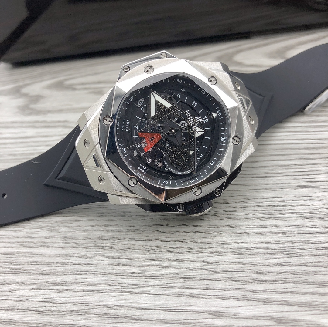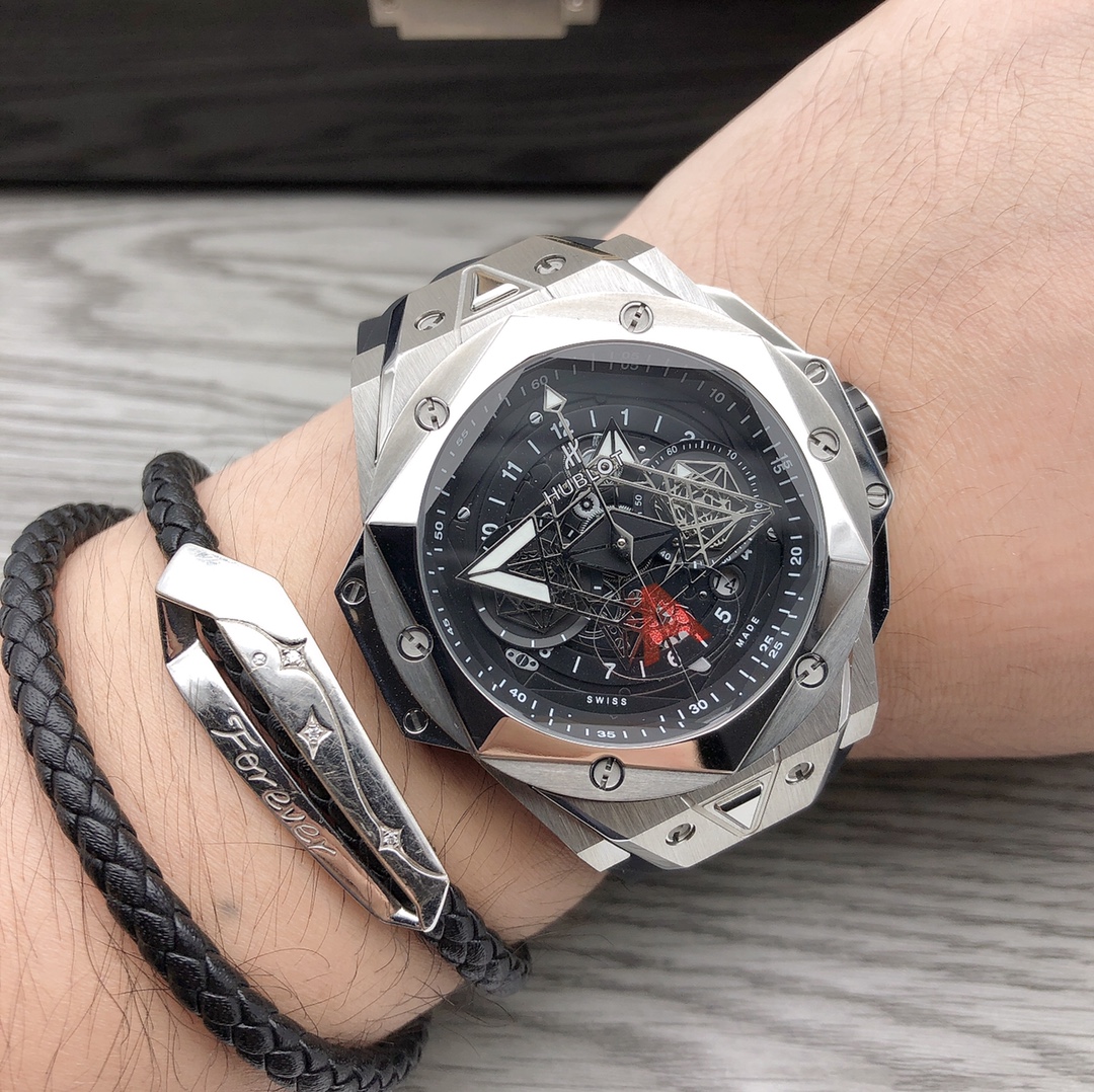 นาฬิกา Hublot Big Bang Sang Bleu II Tattoo Copy มาพร้อมกับการออกแบบที่สร้างสรรค์และงานฝีมือที่ซับซ้อน ตัวเรือนของนาฬิกามีเส้นผ่านศูนย์กลาง 45 มม. และมีรายละเอียดทางเรขาคณิตบนตัวเรือน ซึ่งถูกเพิ่มด้วยการตัดและแกะสลักอย่างแม่นยำ สกรูไทเทเนียมรูปตัว H จำนวนหกตัวยึดขอบตัวเรือนหกเหลี่ยม และการออกแบบขาเชื่อมต่อที่คมชัดและมุมเหลี่ยมทำให้นาฬิกามีลักษณะที่โดดเด่น