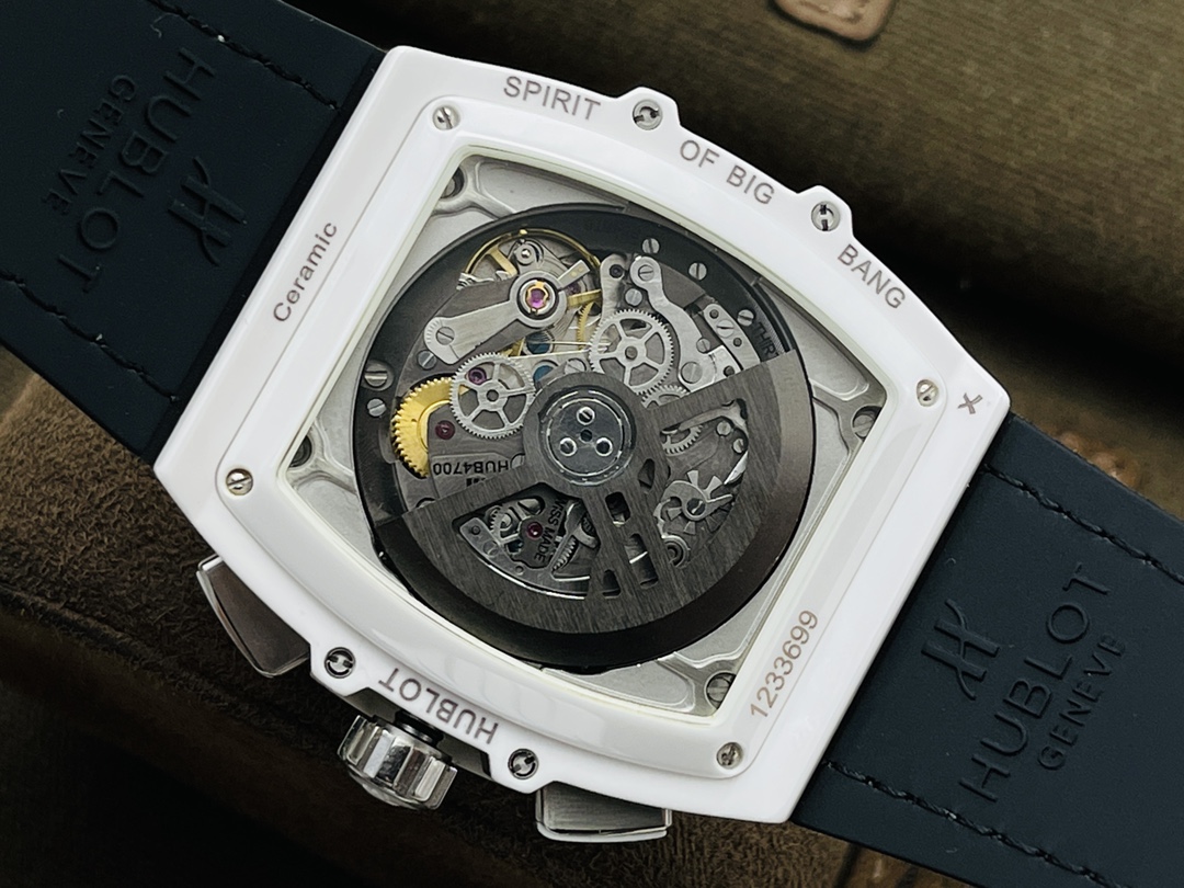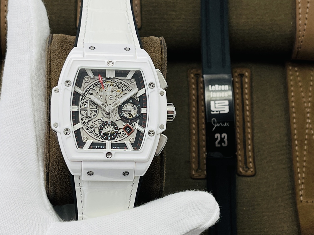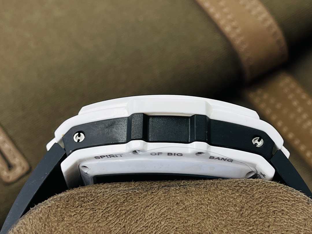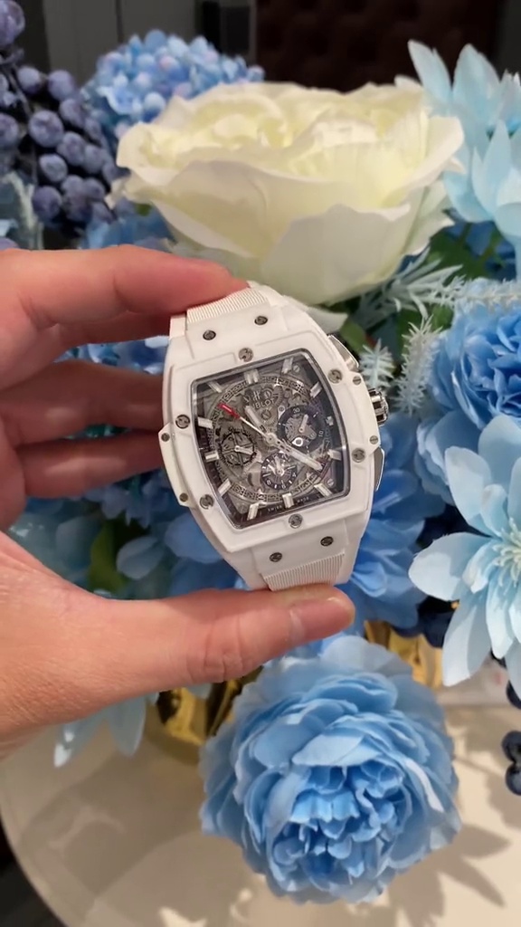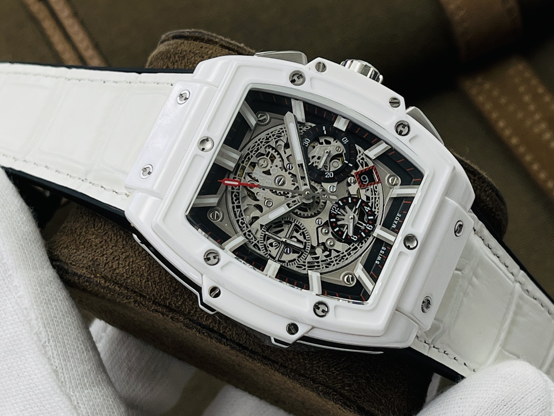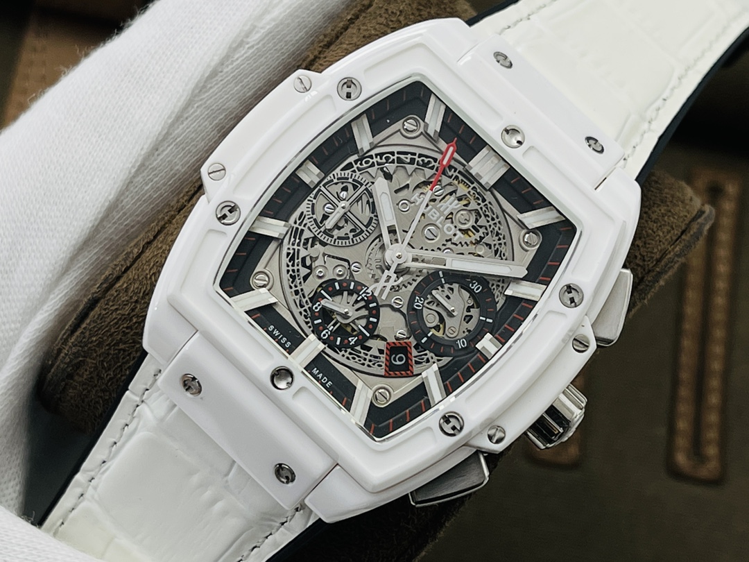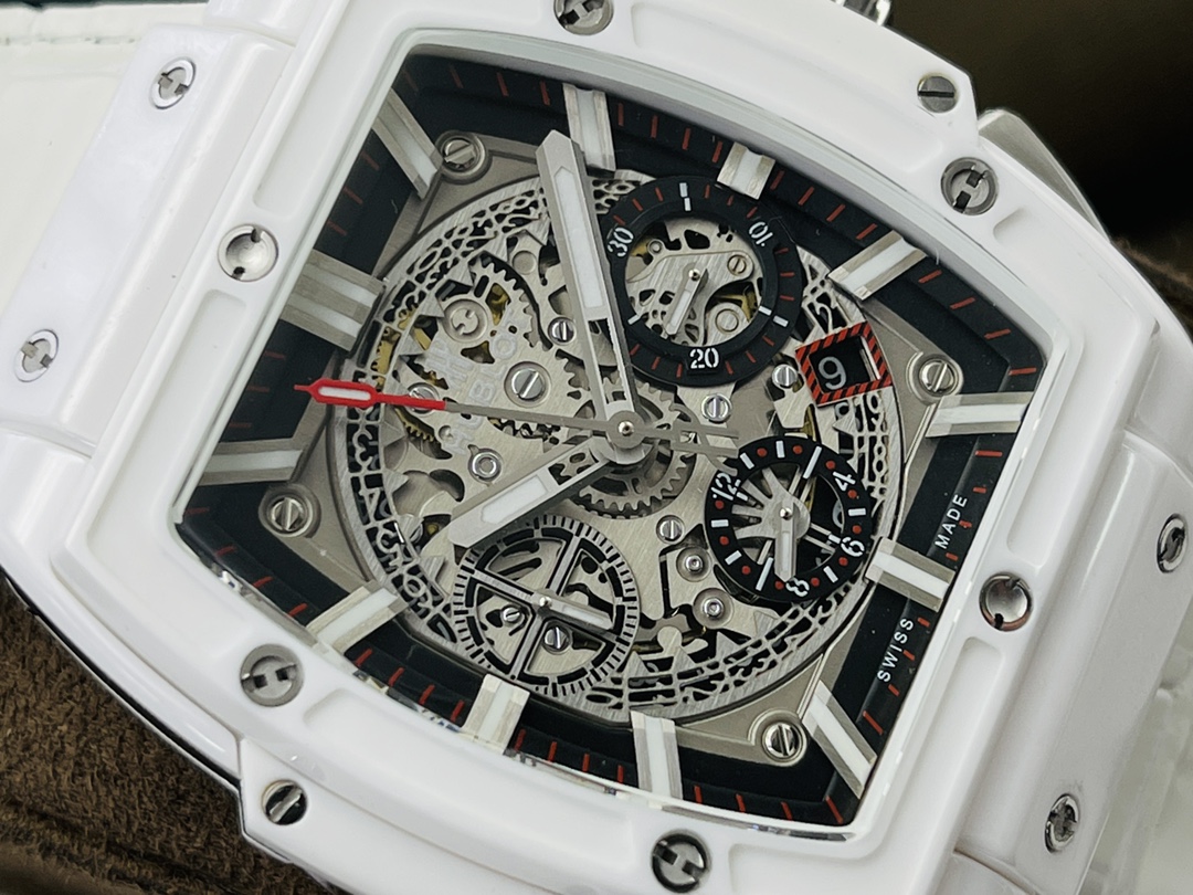 นาฬิกา Hublot Spirit of Big Bang ขนาด 42 มม. รุ่น Swiss Replica เป็นงานศิลปะที่ได้รับแรงบันดาลใจจากกีฬามอเตอร์สปอร์ต ซึ่งความเชี่ยวชาญทางเทคนิคได้รวมเข้ากับการออกแบบที่สร้างสรรค์ นาฬิกา AAA Super Clone มีเคสทรงกระบอกพร้อมโลโก้ ทำจากเซรามิกสีขาวและยึดด้วยสกรูรูปตัว H หกตัวในโครงสร้างแบบแซนด์วิช ซึ่งเป็นตัวแทนของปรัชญา "Art of Fusion" ของ Hublot หน้าปัดแบบสเกเลตันเผยให้เห็นกลไกสวิสที่ซับซ้อนเพื่อให้ความแม่นยำสูง สายหนังสีขาวเพิ่มความหรูหรา ด้วยความสามารถกันน้ำได้ถึง 50 เมตร นาฬิกานี้จึงมอบความมั่นคงและความหรูหราให้กับผู้ชายยุคใหม่