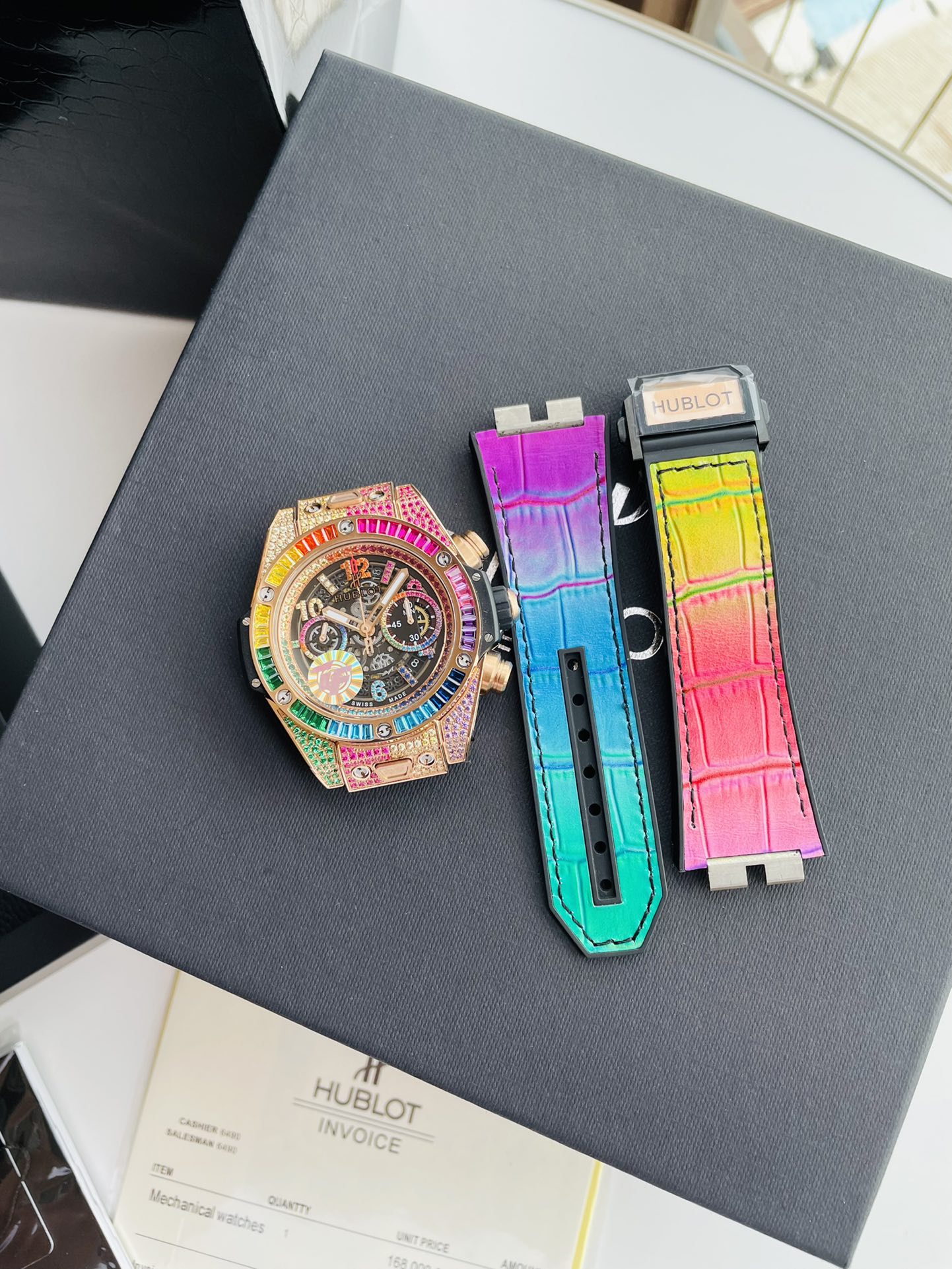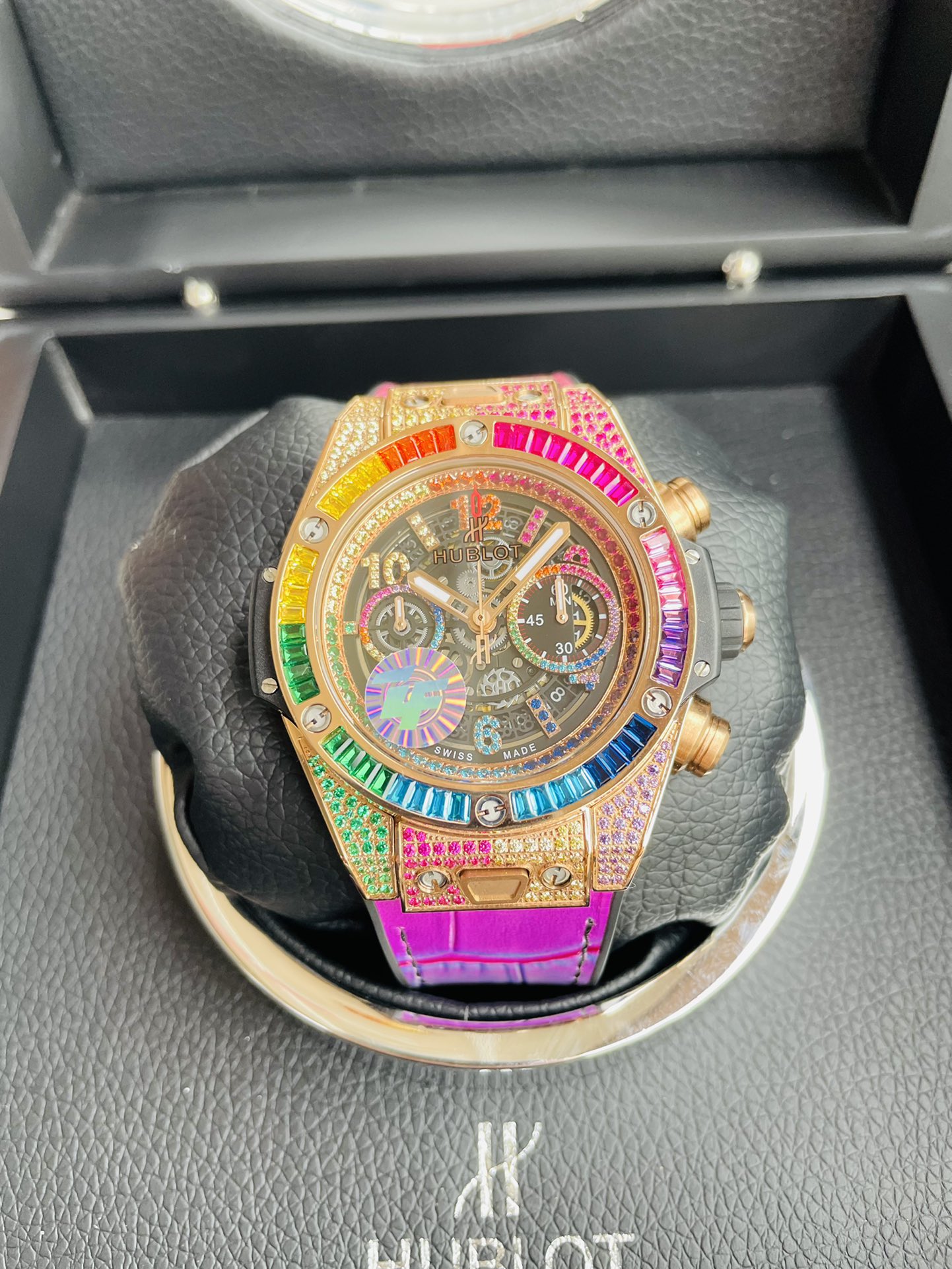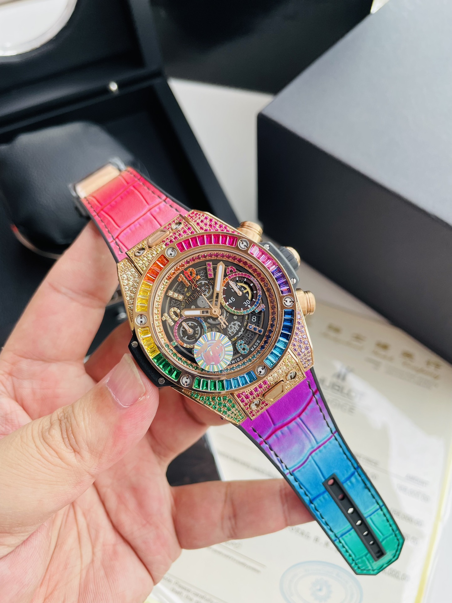 สวัสดีกับนาฬิกาผู้ชาย Hublot Big Bang Unico King Gold Rainbow Automatic ที่ดีที่สุดในแบบ Swiss Replica นาฬิกาหรูระดับ AAA นี้มีตัวเรือนขนาด 42 มม. ที่สวยงามพร้อมขอบ King Gold ที่ประดับด้วยอัญมณีสี่เหลี่ยมผืนผ้าสีสันสดใส พื้นหลังสีดำด้านที่มีลักษณะโปร่งใสเผยให้เห็นกลไกอัตโนมัติของสวิสอย่างละเอียด และเข็มทองที่มีความสว่างช่วยให้สามารถอ่านเวลาได้ในทุกสภาพแสง