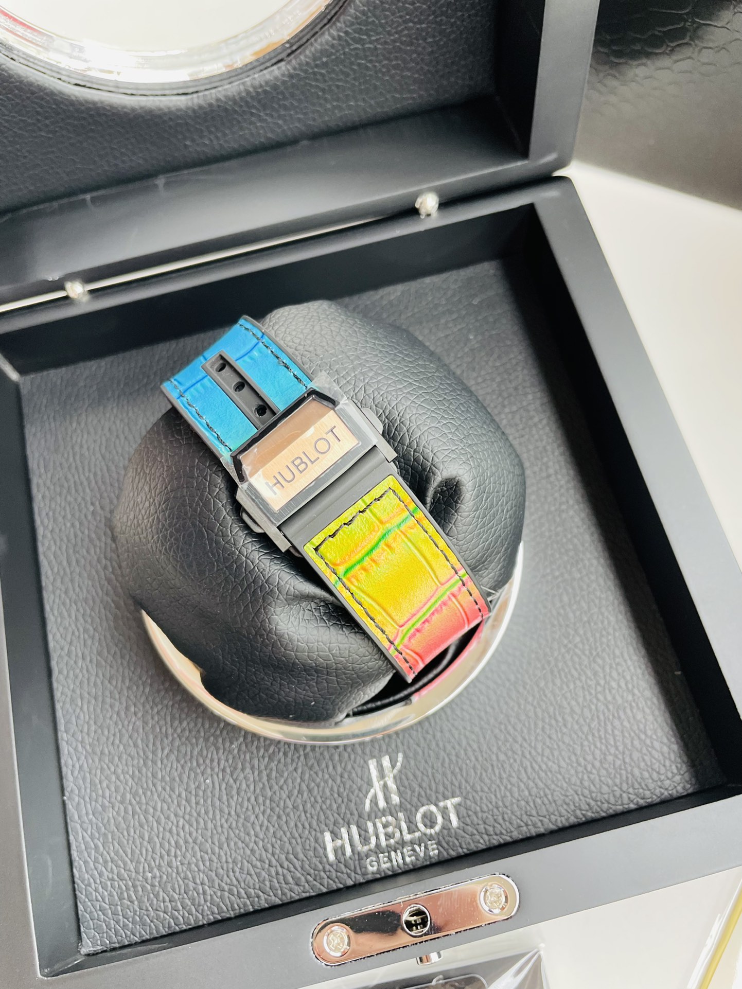 | วัสดุสายรัด | ยางสีดำพร้อมรายละเอียดหนังจระเข้สีแดงและสีม่วง |