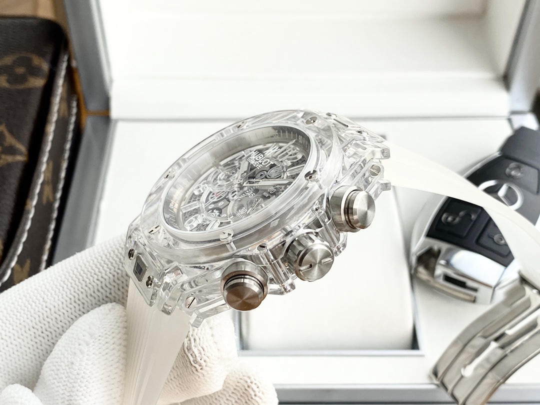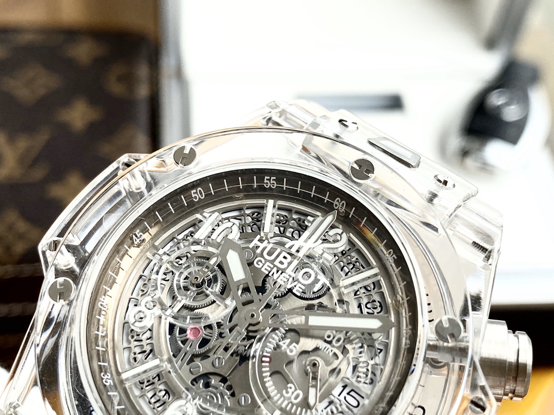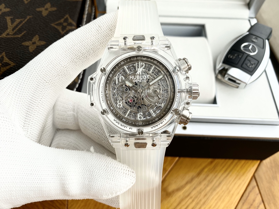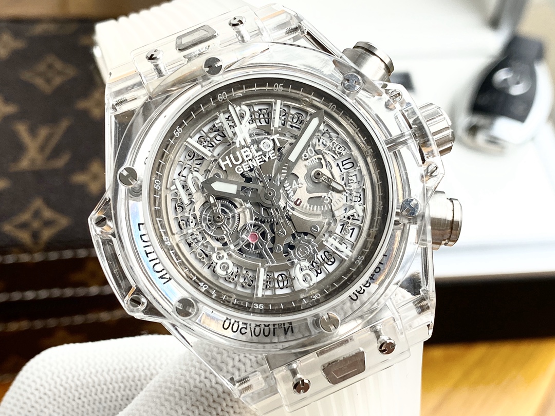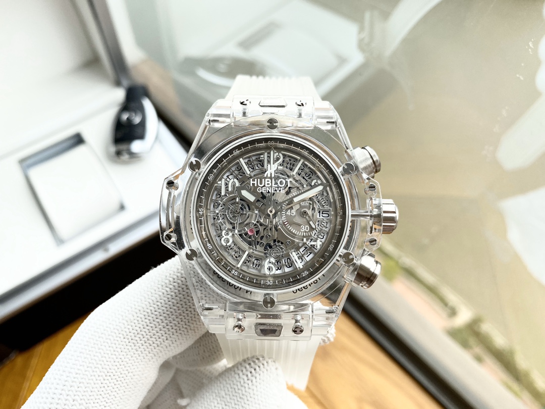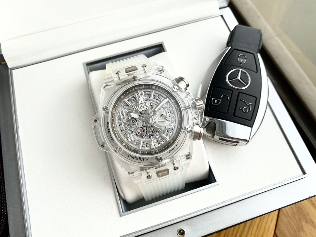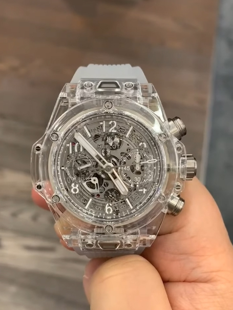 ยินดีต้อนรับสู่ Hublot Big Bang Unico Sapphire 441.JX.4802.RT Super Clone ผลงานชิ้นเอกแห่งการผลิตนาฬิกา นาฬิกาขนาด 45 มม. จากสวิสที่มาพร้อมกับเคสคริสตัลซาฟไฟร์ใส ซึ่งให้มุมมองที่ชัดเจนไร้ที่ติ บี๊กแบงค์ยูนิโก "แมจิกโกลด์" ขอบและฝาหลังทำจากซาฟไฟร์ที่ผ่านการตกแต่งด้วยมือ ซึ่งเป็นแก่นแท้ของการออกแบบร่วมสมัยและศิลปะการผสมผสาน หน้าปัดแบบสเกเลตันเผยให้เห็นกลไกภายในของการเคลื่อนไหวแบบสวิส ความแม่นยำและศิลปะที่แสดงออกมาอย่างเต็มที่ ร่วมกับสายยางใส นาฬิกานี้ได้กำหนดนิยามใหม่ของความหรูหราและนวัตกรรม กันน้ำได้ถึง 50 เมตร เพิ่มสไตล์และฟังก์ชันให้กับคอลเลกชันนาฬิกาใด ๆ
