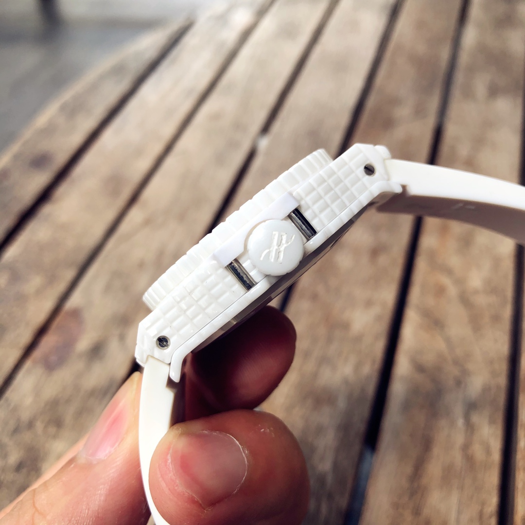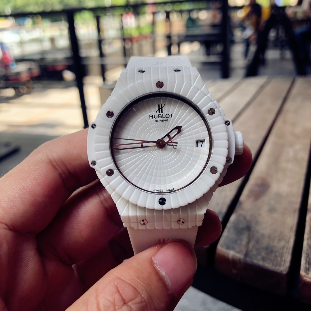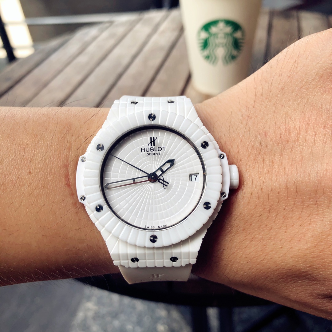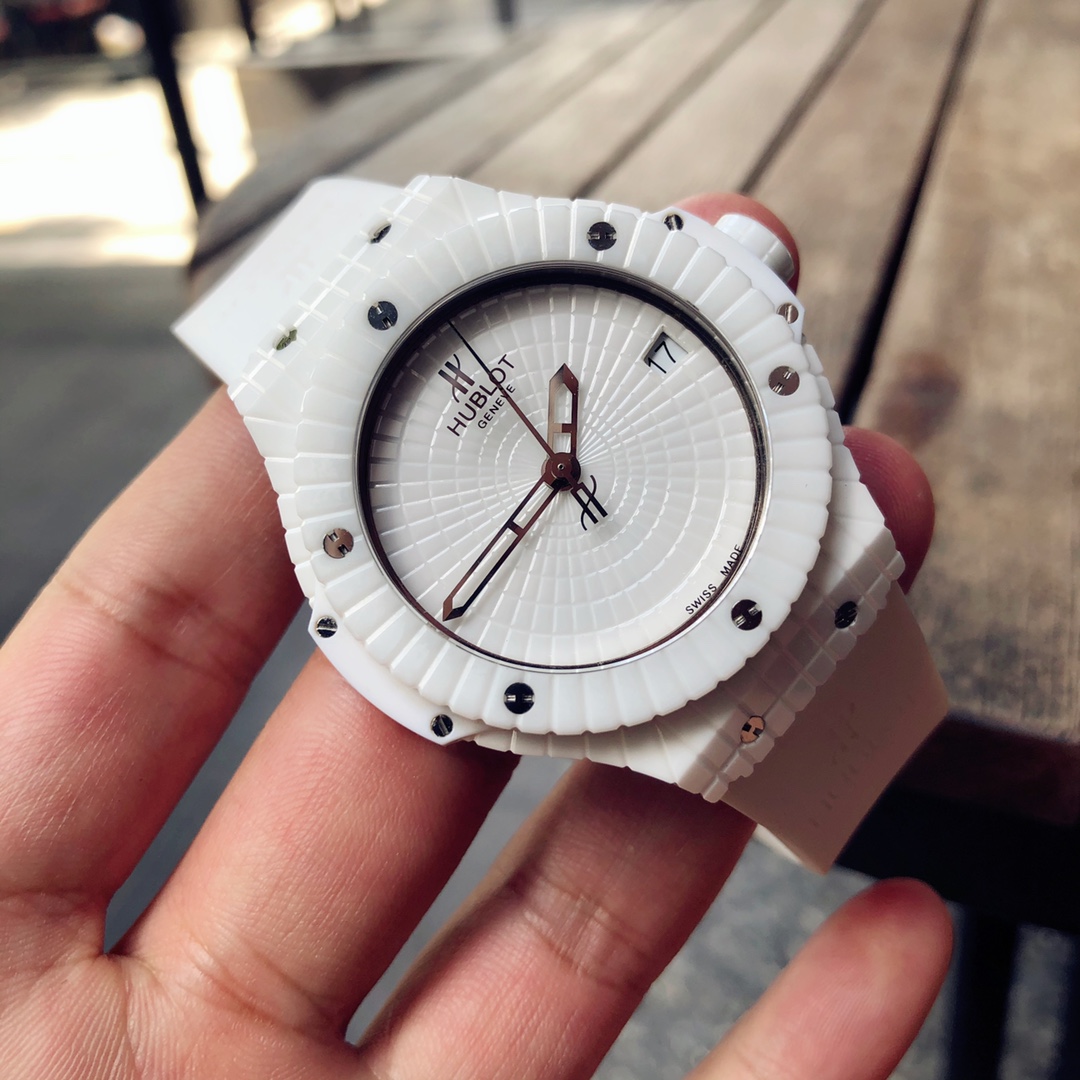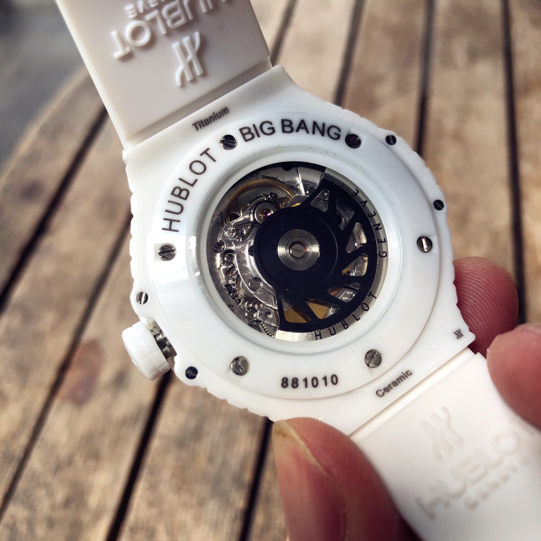 นาฬิกา Hublot Big Bang Caviar ขนาด 41 มม. หน้าปัดสีขาว อัตโนมัติ เซรามิก รุ่นเลียนแบบ เป็นนาฬิกาที่สวยงามซึ่งผสมผสานแฟชั่นและเทคโนโลยีเข้าด้วยกัน ตัวเรือนเซรามิกสีขาวที่ผ่านการขัดเงา, ขอบนาฬิกา และหน้าปัดมีลักษณะเหมือนเพชรที่มีหลายเหลี่ยมบนคุณสมบัติของเซรามิกทั้งหมด ทำให้เกิดการออกแบบวงกลมที่น่าสนใจ หกสกรูไทเทเนียม "H" ที่ผ่านการขัดเงายึดขอบนาฬิกาไว้ด้วยกัน ทำให้แข็งแรงและดูน่าสนใจมากขึ้น ส่วนที่เป็นเรซินคอมโพสิตสีขาวที่ด้านข้างของตัวเรือนกลางเพิ่มเอกลักษณ์ให้กับนาฬิกา ตัวหมุดเซรามิกสีขาวที่ผ่านการขัดเงาเป็นจุดเด่นสุดท้าย ขณะที่เข็มนาฬิกาแบบโครงกระดูกที่เคลือบโรเดียมของสแตนเลสสตีลทำให้ดูสง่างาม หน้าต่างวันที่ที่ตำแหน่ง 3 นาฬิกาเพิ่มฟังก์ชันการใช้งานให้กับนาฬิกาหรูนี้ มันมาพร้อมกับกลไกอัตโนมัติจากสวิสและระดับกันน้ำ 50 เมตร สายรัดยางสีขาวยังทำให้ดูสปอร์ตแต่ก็มีความสง่างามในดีไซน์ จึงสามารถพกพาไปได้ทุกที่