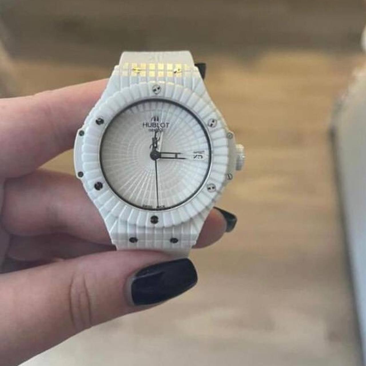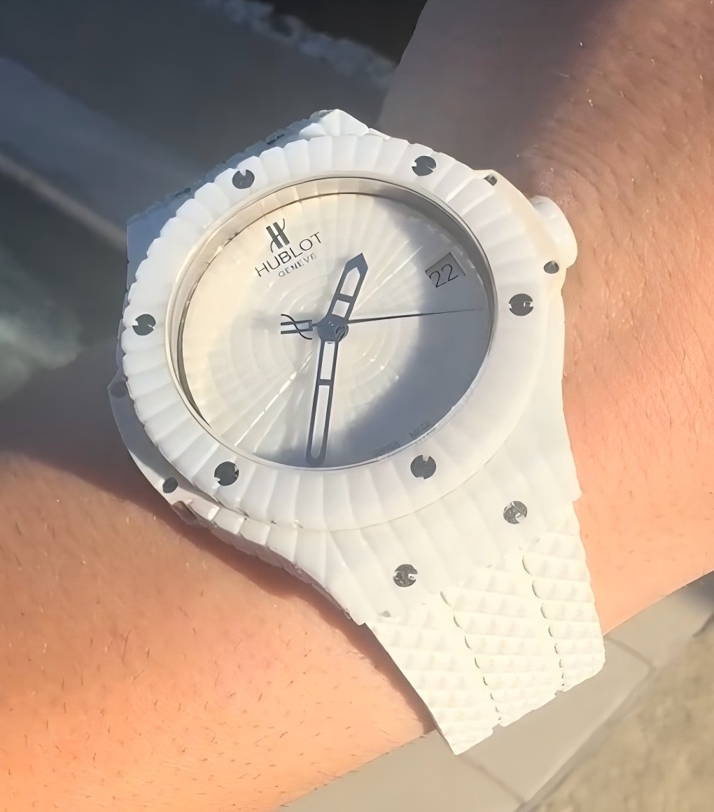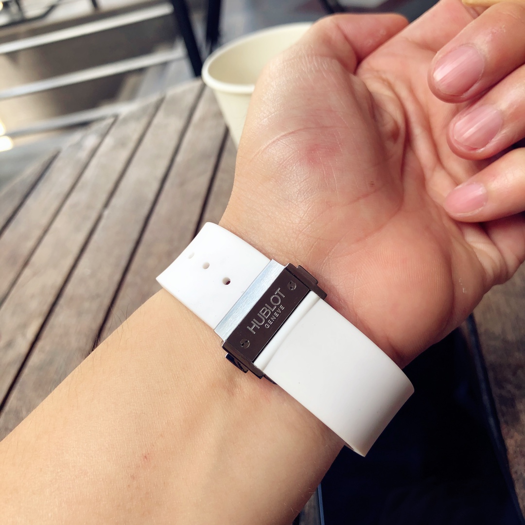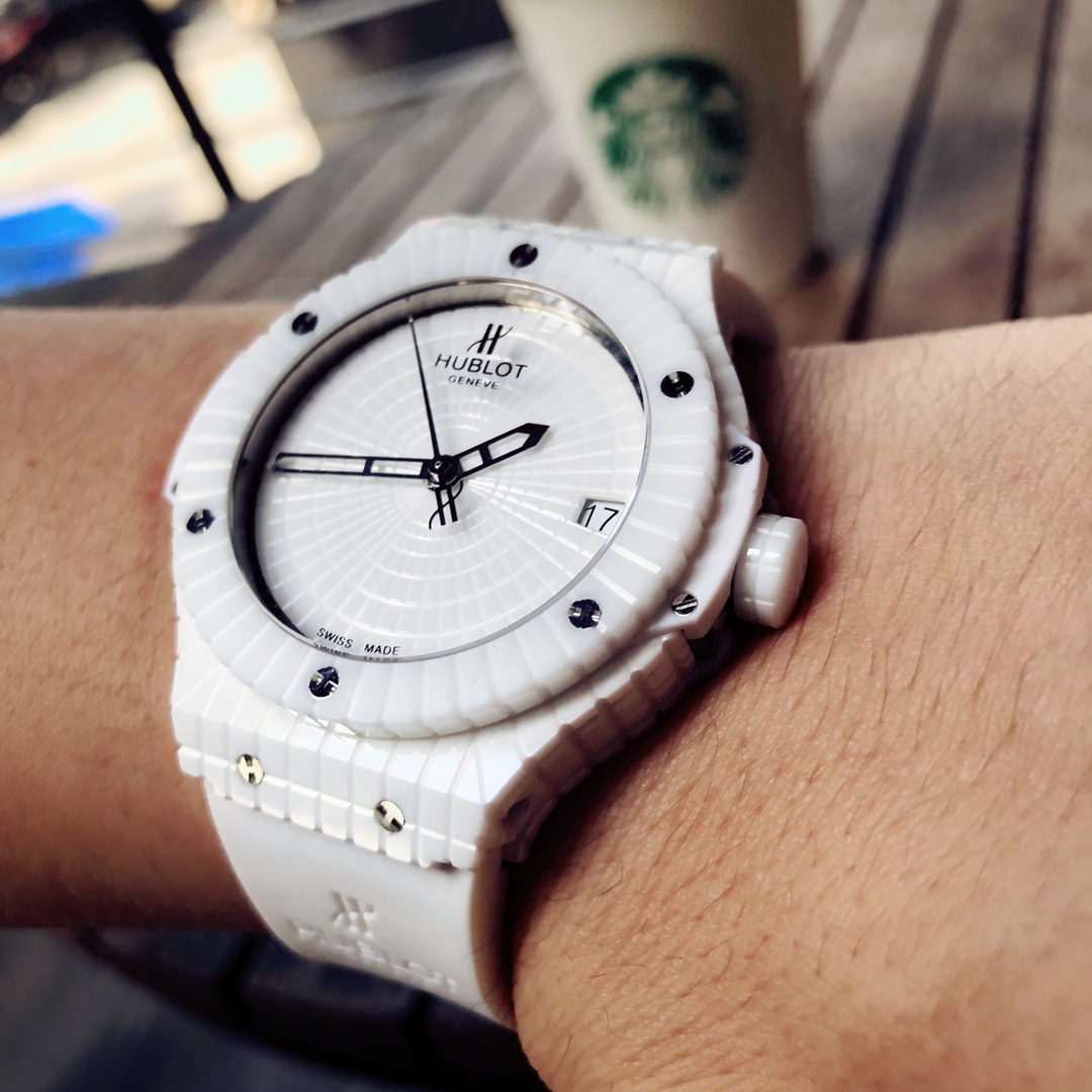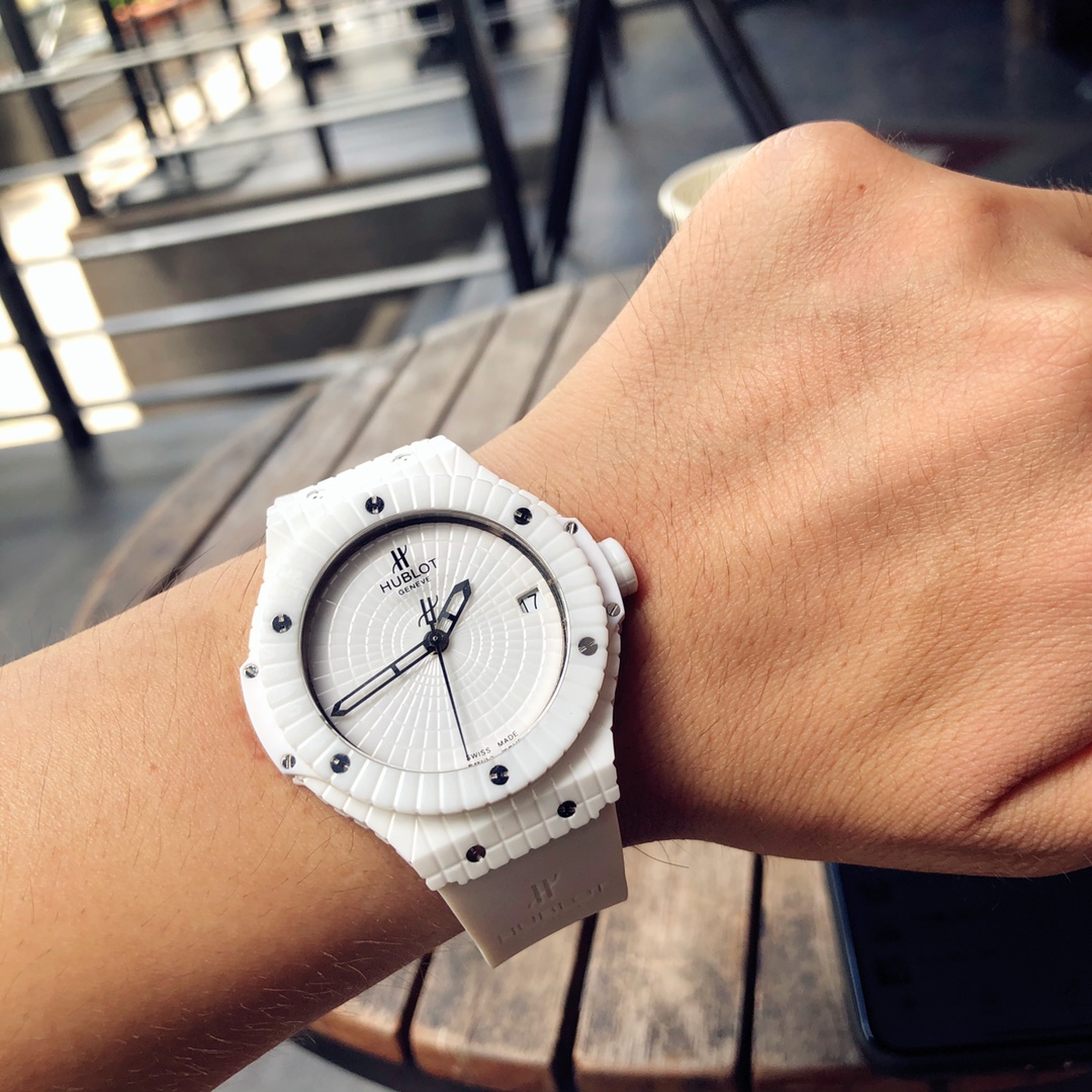นาฬิกา Hublot Big Bang Caviar ขนาด 41 มม. หน้าปัดสีขาว อัตโนมัติ เซรามิก รุ่นเลียนแบบ เป็นนาฬิกาที่สวยงามซึ่งผสมผสานแฟชั่นและเทคโนโลยีเข้าด้วยกัน ตัวเรือนเซรามิกสีขาวที่ผ่านการขัดเงา, ขอบนาฬิกา และหน้าปัดมีลักษณะเหมือนเพชรที่มีหลายเหลี่ยมบนคุณสมบัติของเซรามิกทั้งหมด ทำให้เกิดการออกแบบวงกลมที่น่าสนใจ หกสกรูไทเทเนียม "H" ที่ผ่านการขัดเงายึดขอบนาฬิกาไว้ด้วยกัน ทำให้แข็งแรงและดูน่าสนใจมากขึ้น ส่วนที่เป็นเรซินคอมโพสิตสีขาวที่ด้านข้างของตัวเรือนกลางเพิ่มเอกลักษณ์ให้กับนาฬิกา ตัวหมุดเซรามิกสีขาวที่ผ่านการขัดเงาเป็นจุดเด่นสุดท้าย ขณะที่เข็มนาฬิกาแบบโครงกระดูกที่เคลือบโรเดียมของสแตนเลสสตีลทำให้ดูสง่างาม หน้าต่างวันที่ที่ตำแหน่ง 3 นาฬิกาเพิ่มฟังก์ชันการใช้งานให้กับนาฬิกาหรูนี้ มันมาพร้อมกับกลไกอัตโนมัติจากสวิสและระดับกันน้ำ 50 เมตร สายรัดยางสีขาวยังทำให้ดูสปอร์ตแต่ก็มีความสง่างามในดีไซน์ จึงสามารถพกพาไปได้ทุกที่