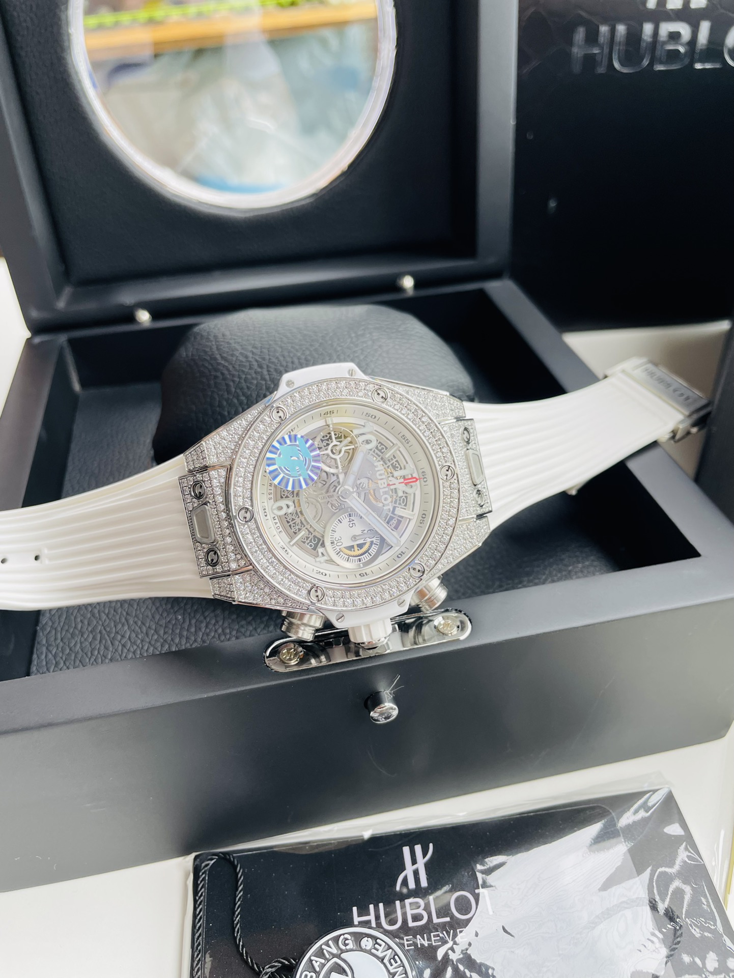 นาฬิกาขนาด 42 มม. นี้มาพร้อมกับตัวเรือนไทเทเนียมที่เคลือบซาตินสีขาวประดับด้วยเพชรระยิบระยับ – ดูเรียบหรูและมีระดับ ตัวหน้าปัดโครงกระดูกสีขาวเผยให้เห็นกลไกสวิสภายใน – สะอาด รายละเอียด และมีสไตล์อย่างแท้จริง